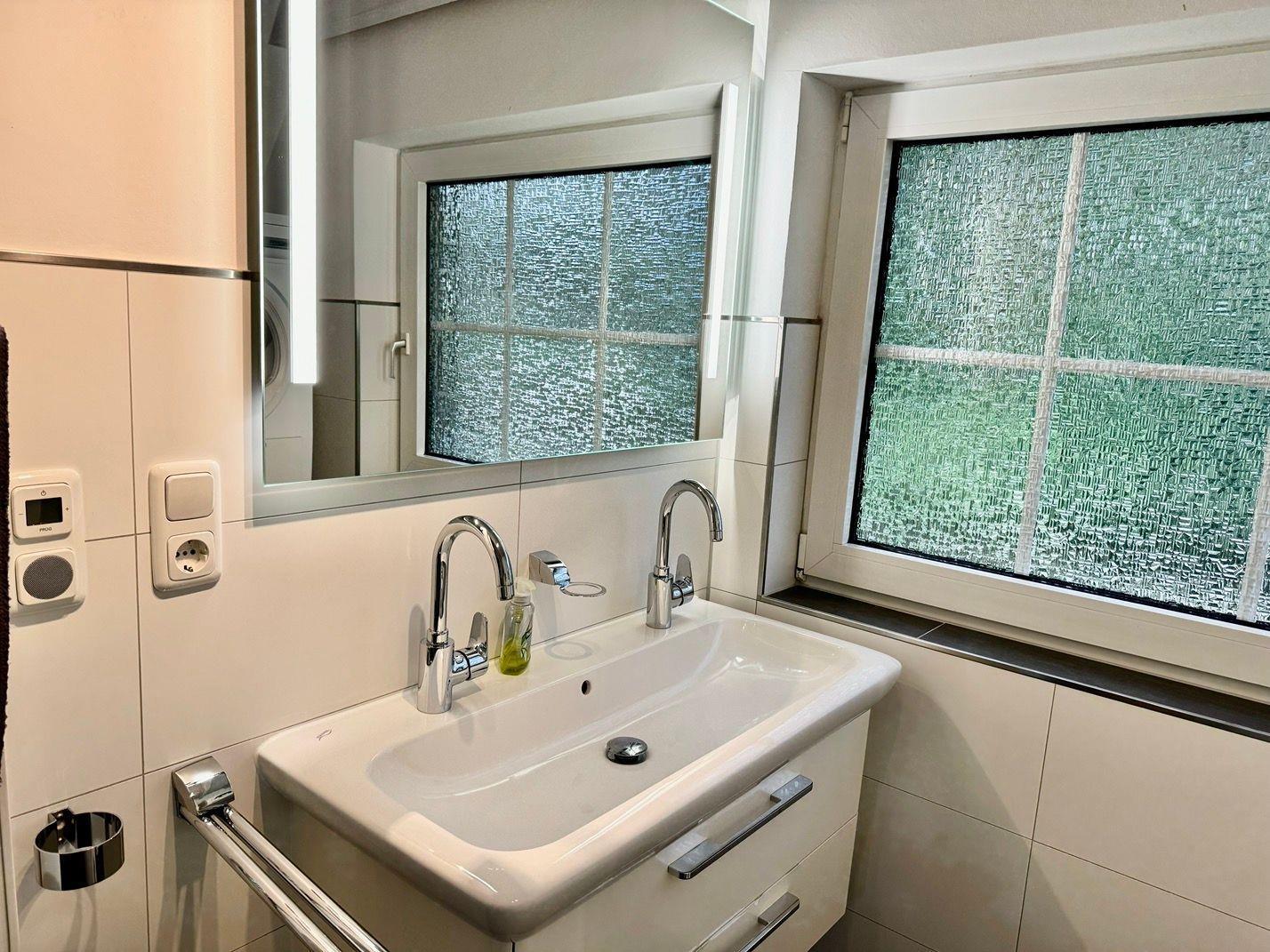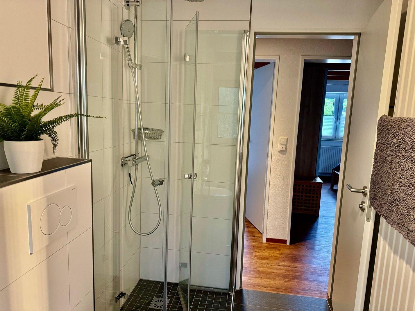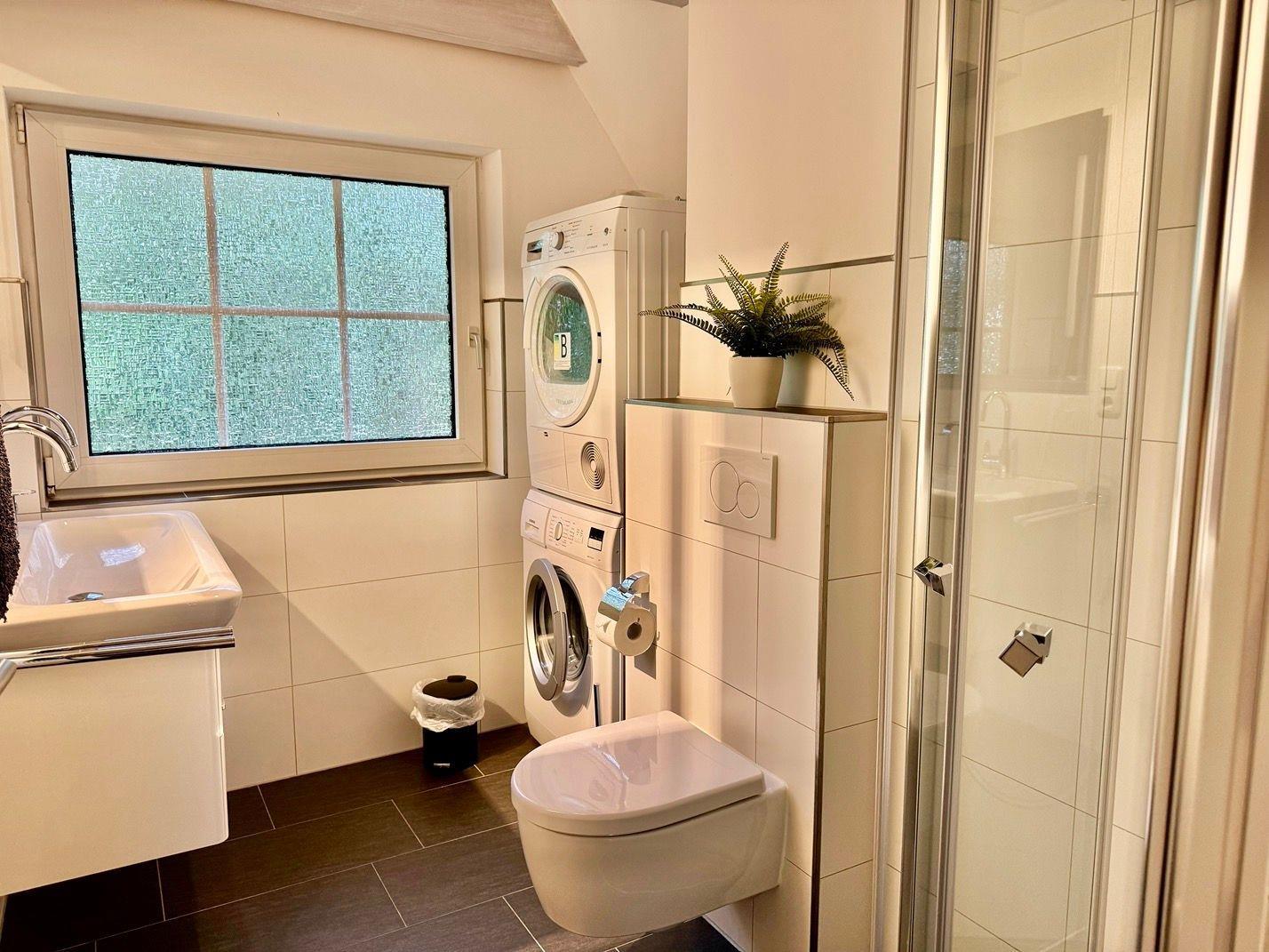 neues Badezimmer mit Dusche, Waschmaschine und Trockner, Abstellraum.