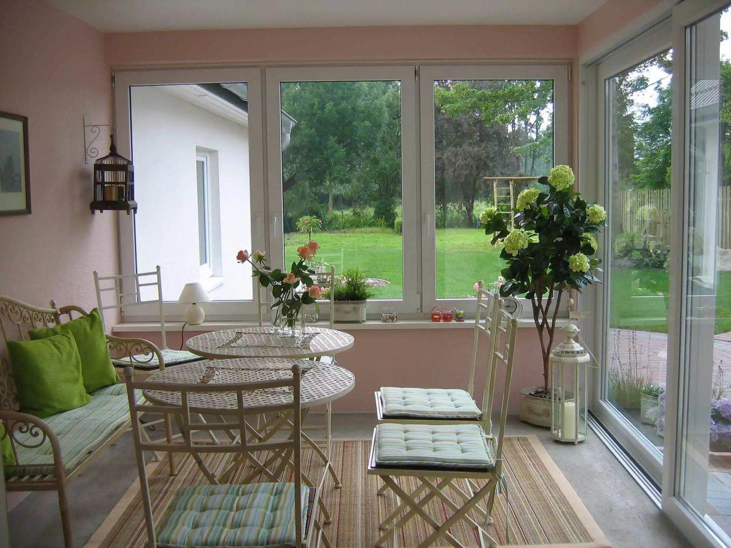 Wunderschöner großzügiger Terrassenbereich mit 2 Terrassentüren ?jeweils vom Esszimmer/Küche. Rechts der herrliche Wintergarten, ebenfalls mit Ausgang zur Terrasse.