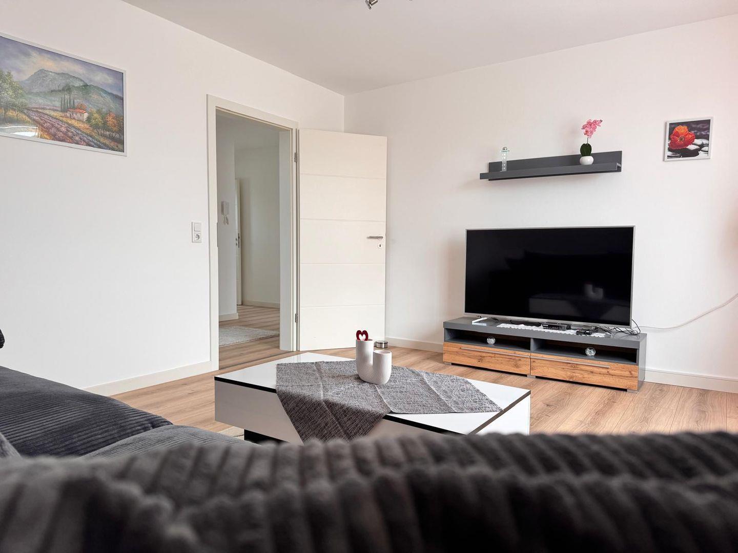 Zu den Annehmlichkeiten gehören ein helles Wohnzimmer mit Laminatboden, Sofaecke, Esstisch und einem modernen Fernseher, der für entspannte Abende einlädt. Zudem bietet das WLAN freien Zugang, um Ihre digitalen Bedürfnisse während Ihres Urlaubs zu erfüllen.