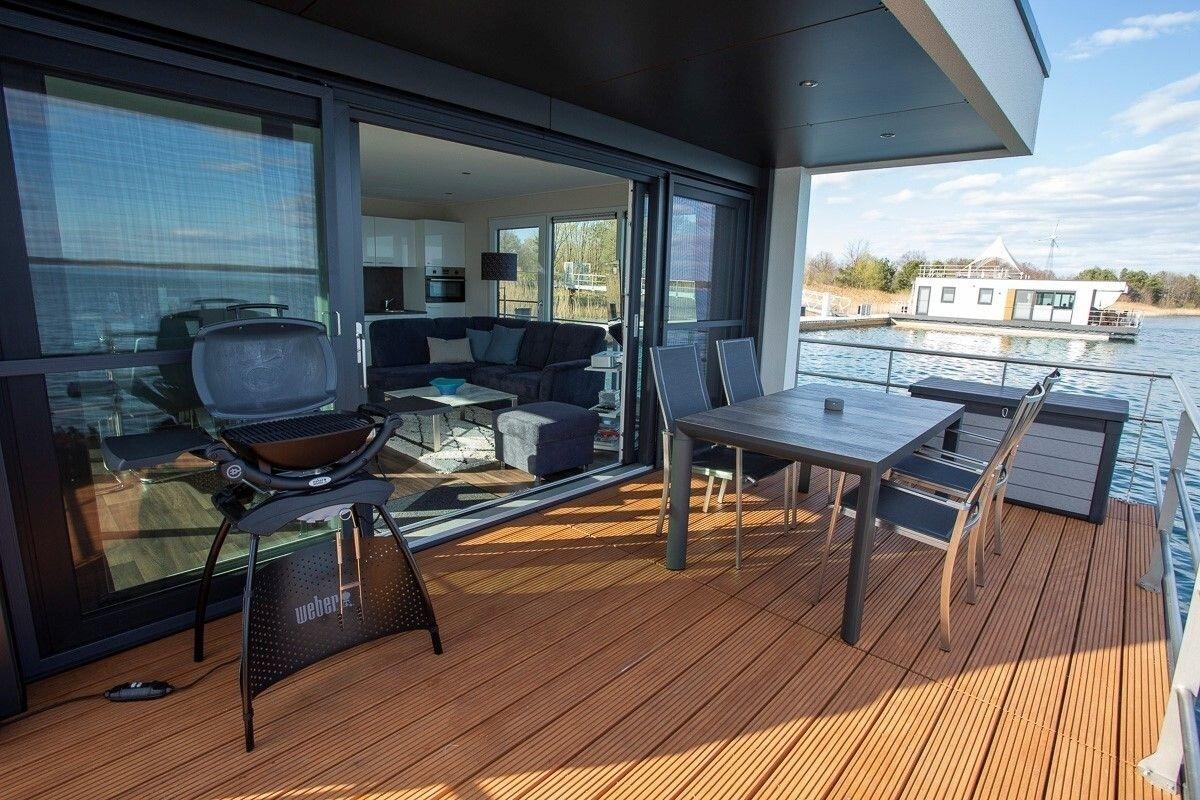 Aus dem Wohn- und Essbereich gelangen Sie auf die Terrasse. Hier können Sie Ihre Mahlzeiten genießen. Auf der Dachterrasse kann man sehr gut entspannen und die Seele baumeln lassen. Erleben Sie das Gefühl von Freiheit auf dem Wasser!