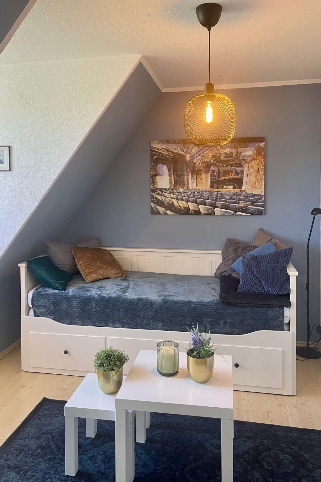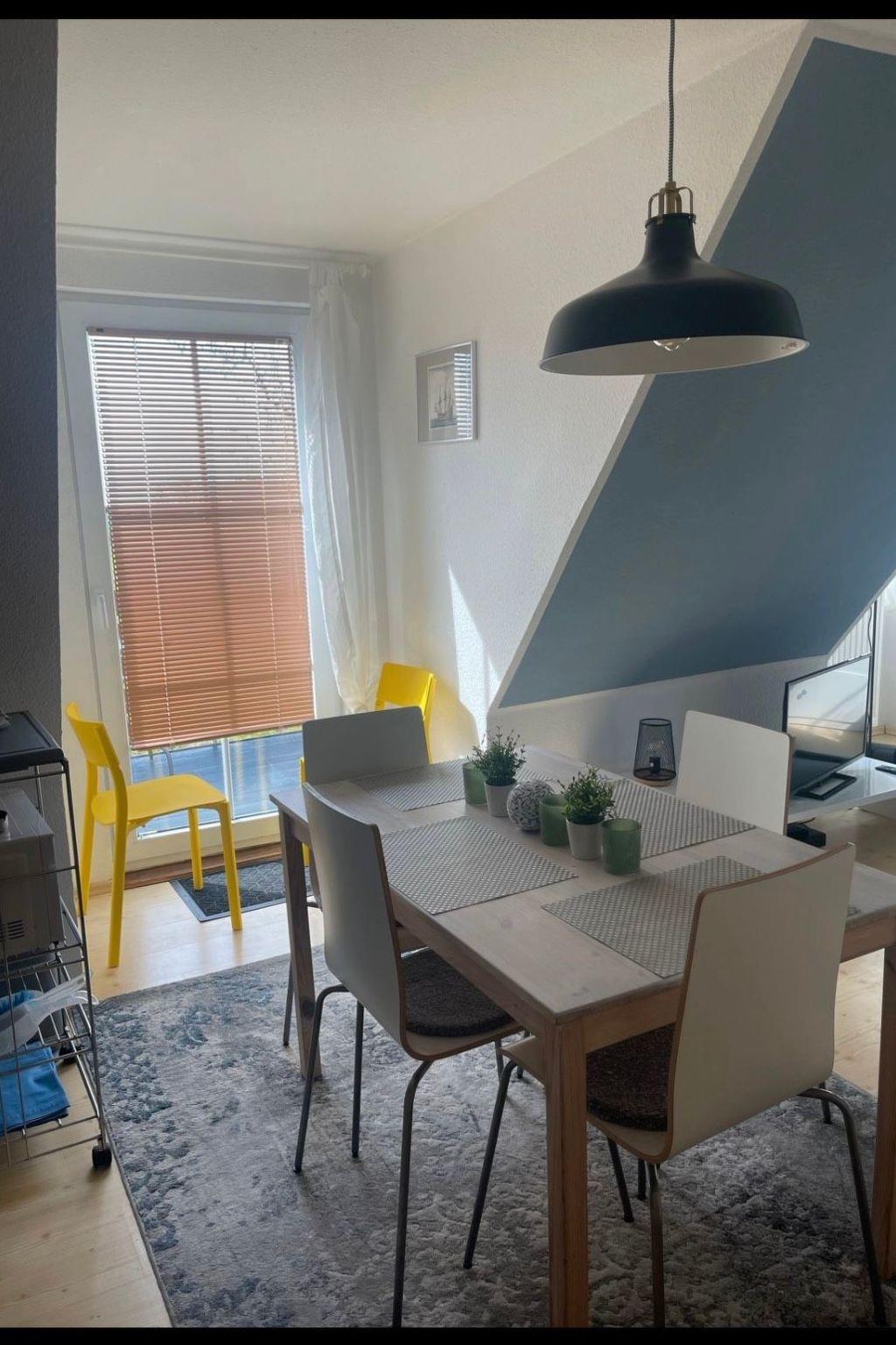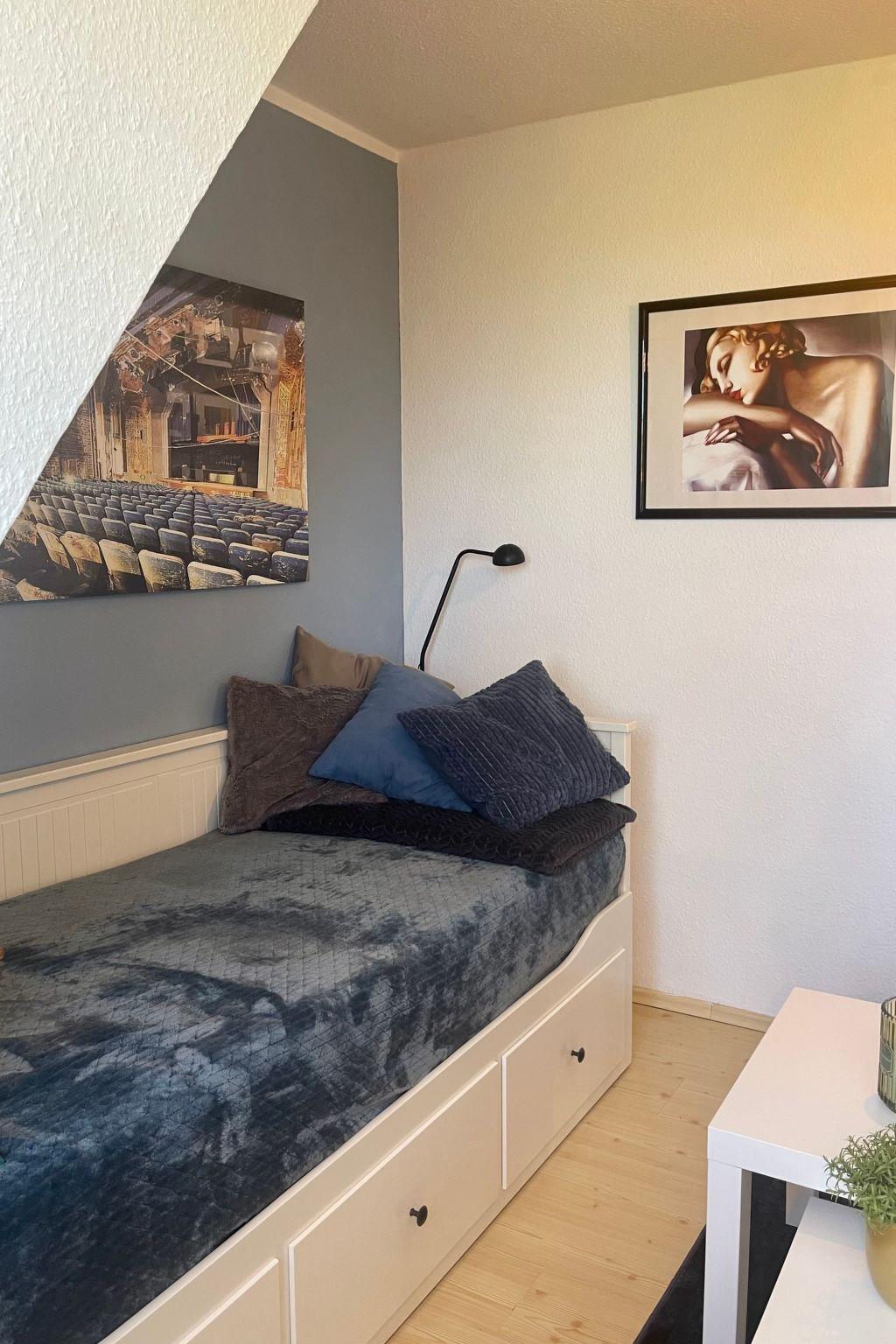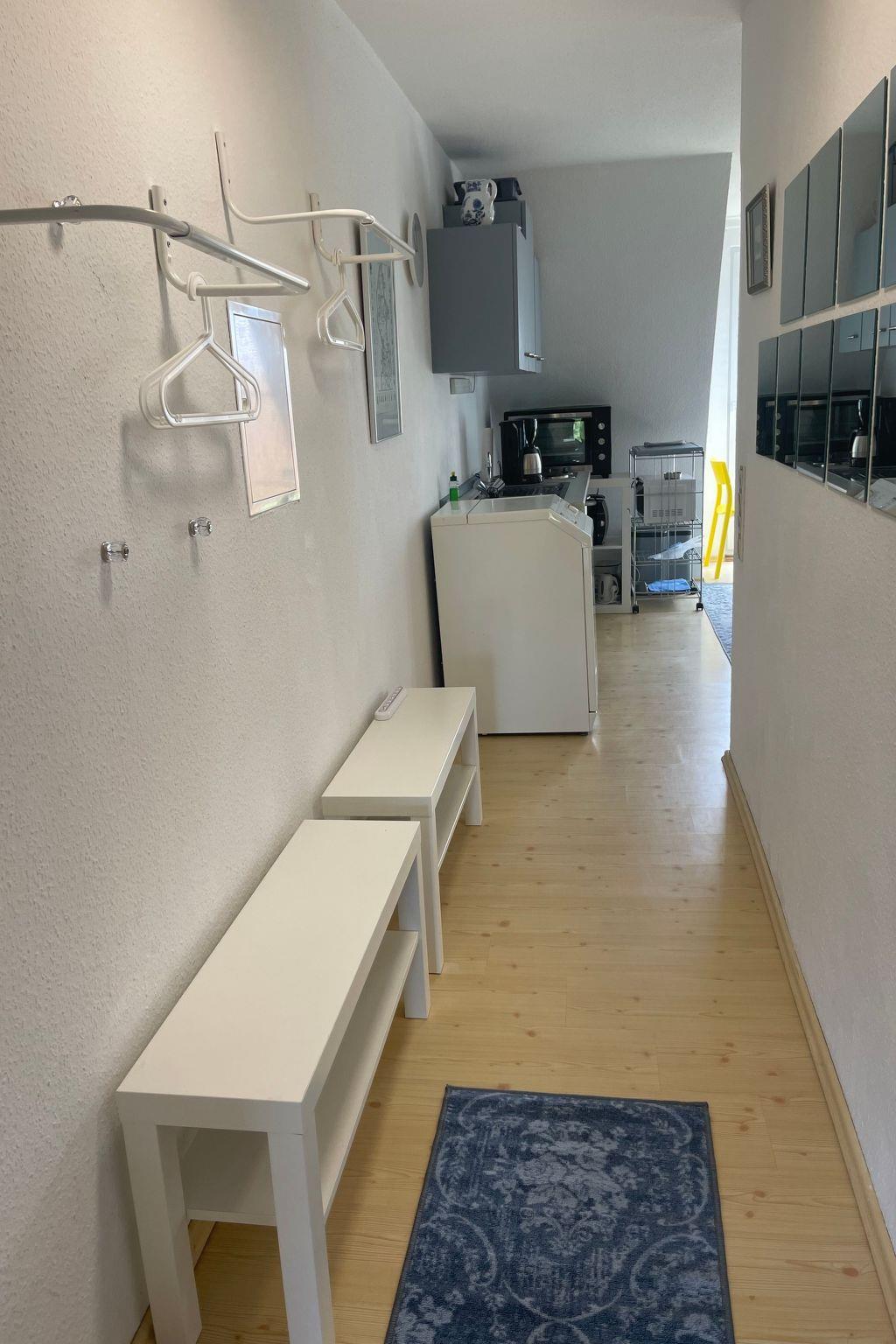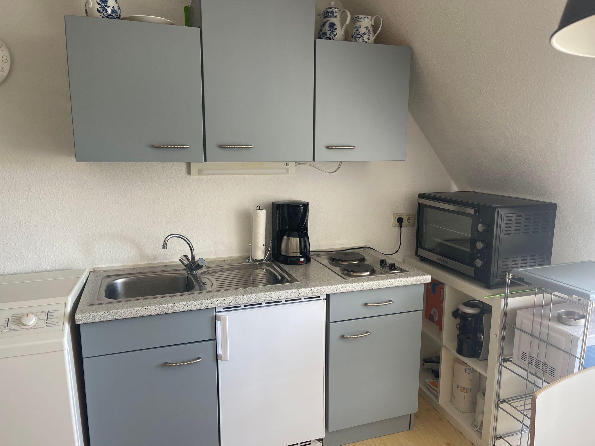 In the living area there is a day bed which can easily be pulled out into a double bed 1.60 x 2.00 metres. The bedding can be easily stored in the three bed drawers. There is another 1.60 x 2.00 m double bed in the bedroom. The flat is furnished for 4 people, there are two wardrobes for your clothes, in the kitchen there is a fridge, a cooker with 2 hotplates, a microwave and a small oven as well as a coffee machine, kettle and toaster. There is also a bathroom with WC and shower. The flat has a south-facing balcony.