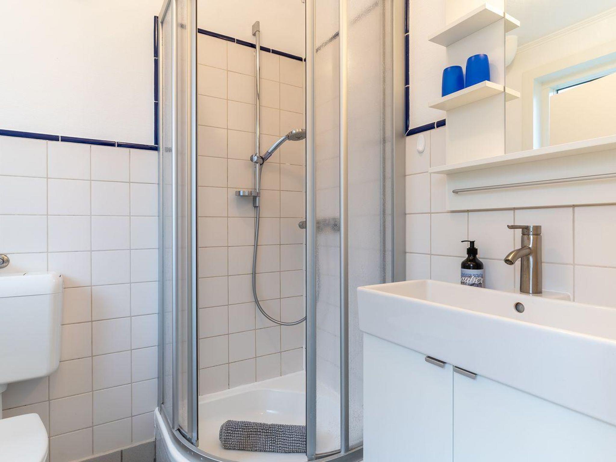 Das kleine Badezimmer bietet alles, was Sie benötigen, darunter eine Dusche, einen Waschtisch mit Fön und ein WC.
