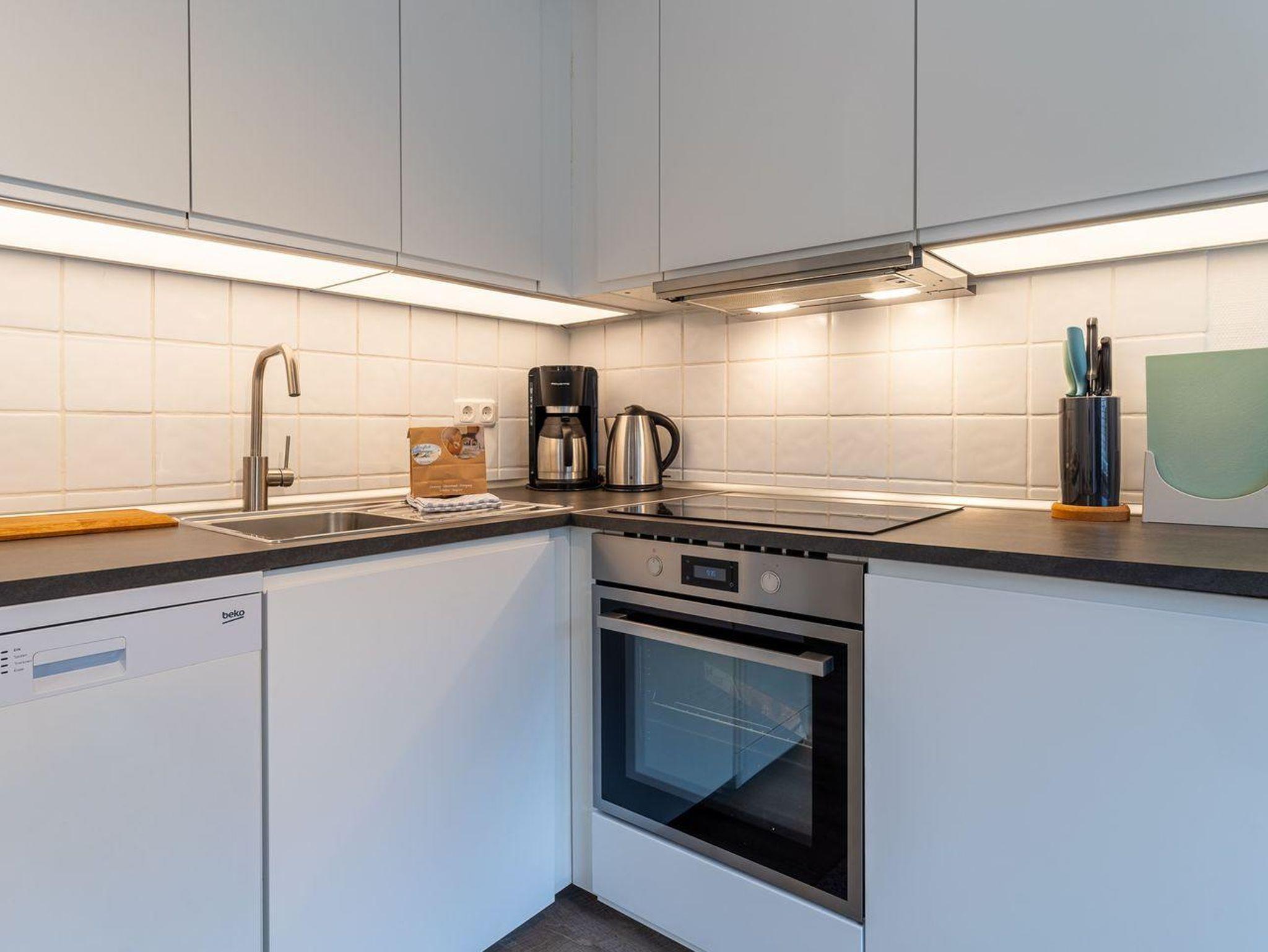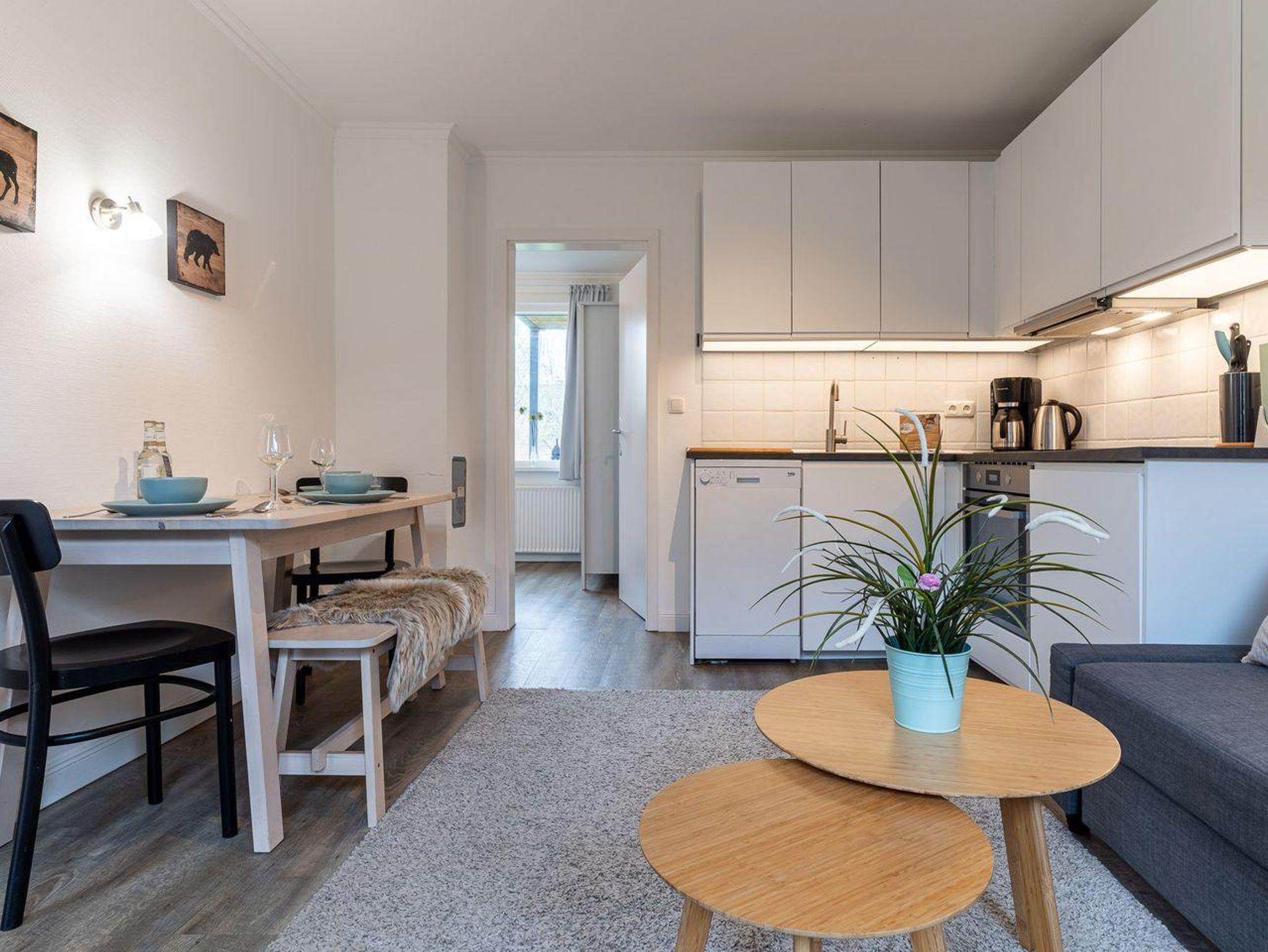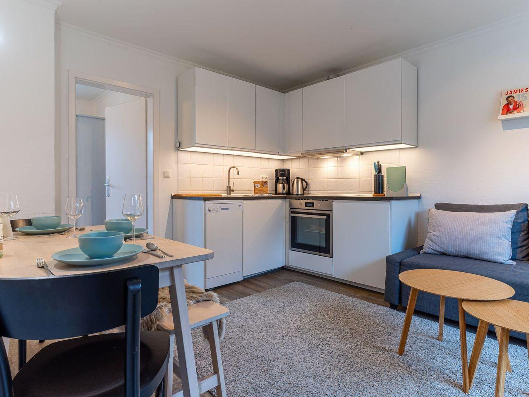 Der Wohnraum ist der ideale Ort zum Entspannen und Verweilen. Hier finden Sie einen Esstisch, eine bequeme Couch, eine TV-Anrichte und eine gut ausgestattete Küchenzeile. Die Küche ist mit einer Spülmaschine, einem Backofen, einer Kaffeemaschine, einem Toaster und reichlich Geschirr ausgestattet, um Ihre Mahlzeiten bequem zuzubereiten.