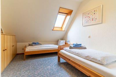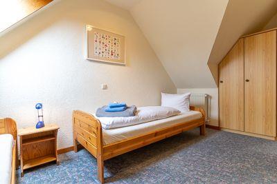 Über eine Holztreppe gelangen Sie in das 2. Obergeschoss, wo sich die Schlafräume befinden. Hier können Sie sich nach einem ereignisreichen Tag in bequemen Betten entspannen und eine erholsame Nacht verbringen. Das Schlafzimmer ist mit einem Doppelbett (1,80 x 2,00m) ausgestattet, während das zweite Schlafzimmer mit zwei Einzelbetten eingerichtet ist.