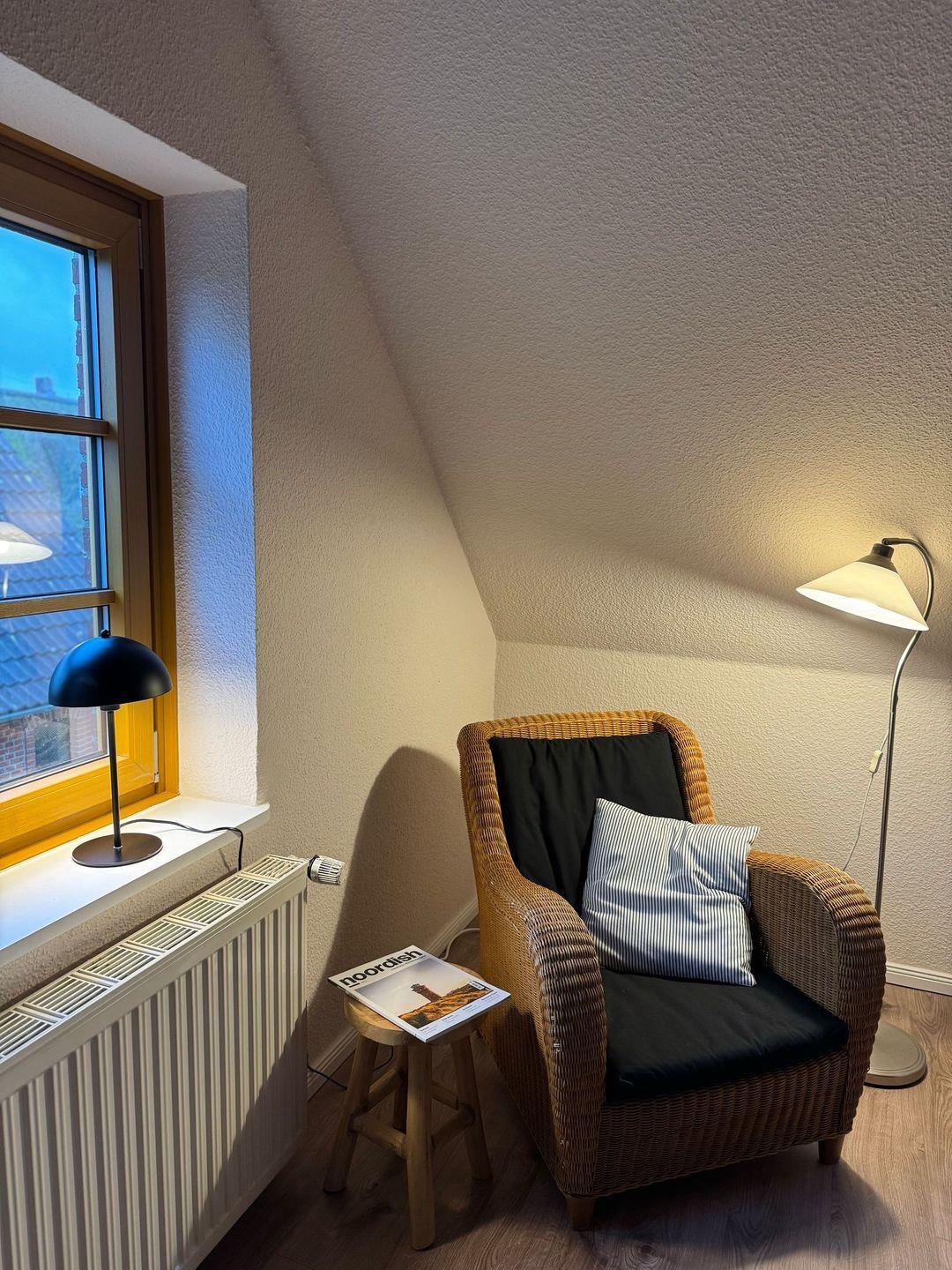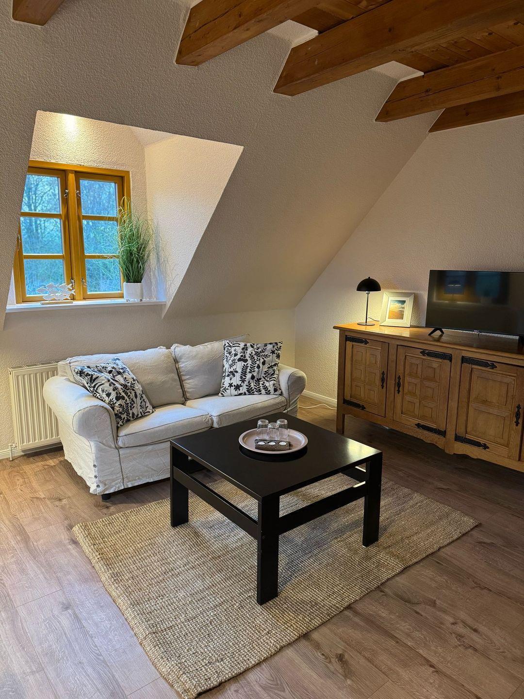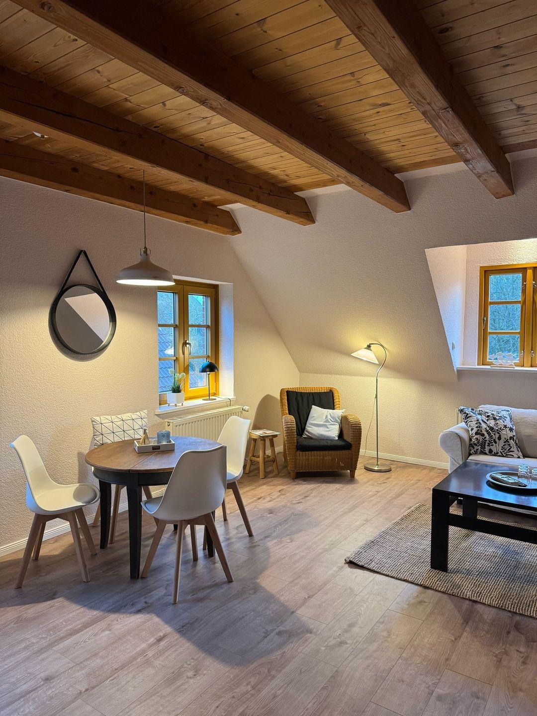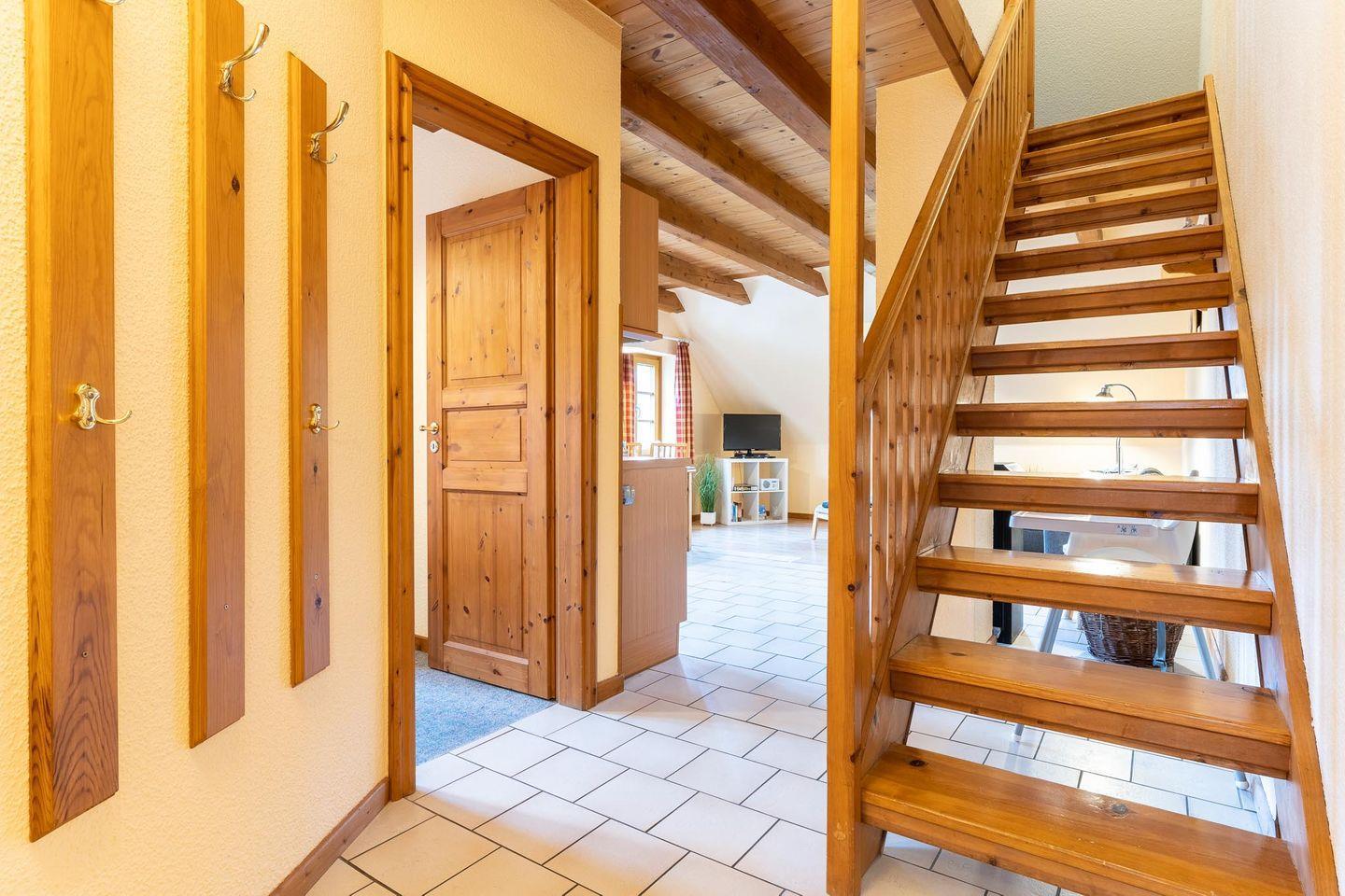 Die ca. 60qm große Wohnung befindet sich im 1. OG des Hauses und bietet Platz für 4 Personen.in der ersten Etage befindet sich ein Schlafzimmer mit Doppelbett, ein geräumiges Duschbad und eine großzügige Wohnküche mit Kamin.Über eine Holztreppe gelangen Sie in das 2. Obergeschoss und in ein weiteres Schlafzimmer mit zwei Einzelbetten.