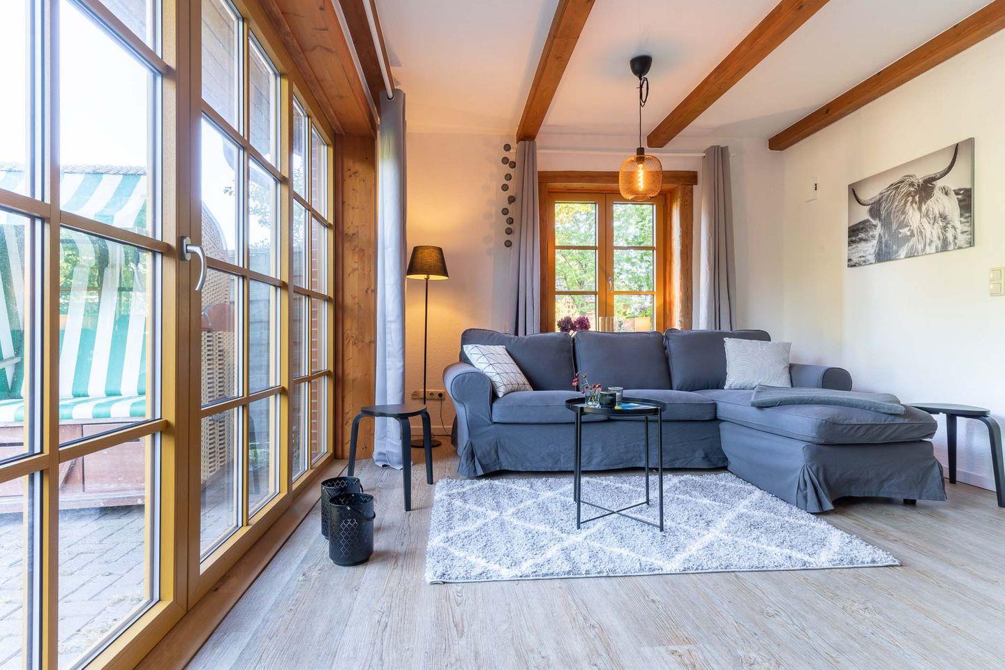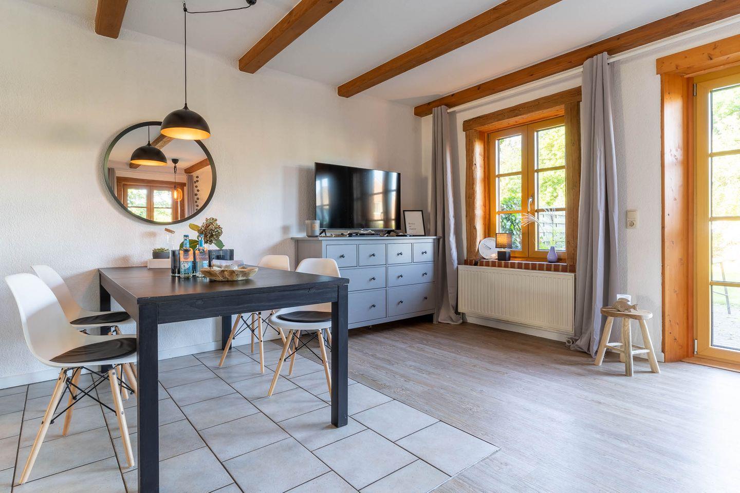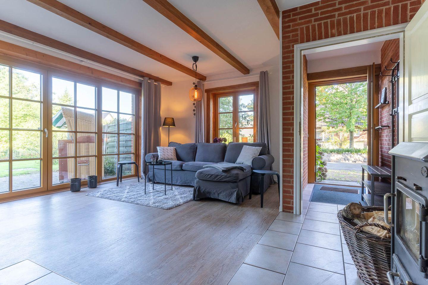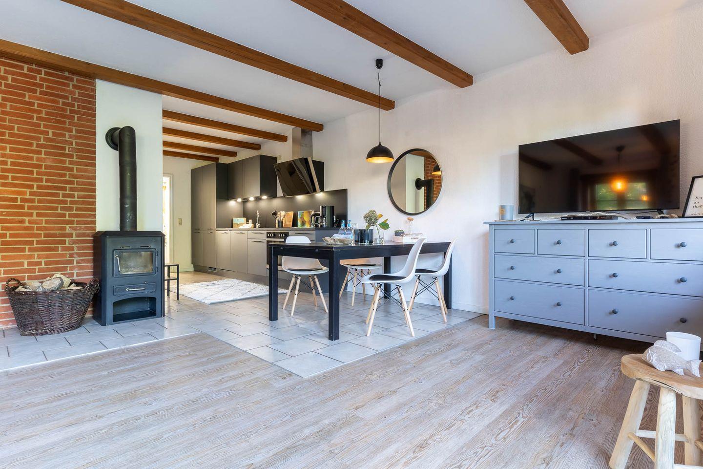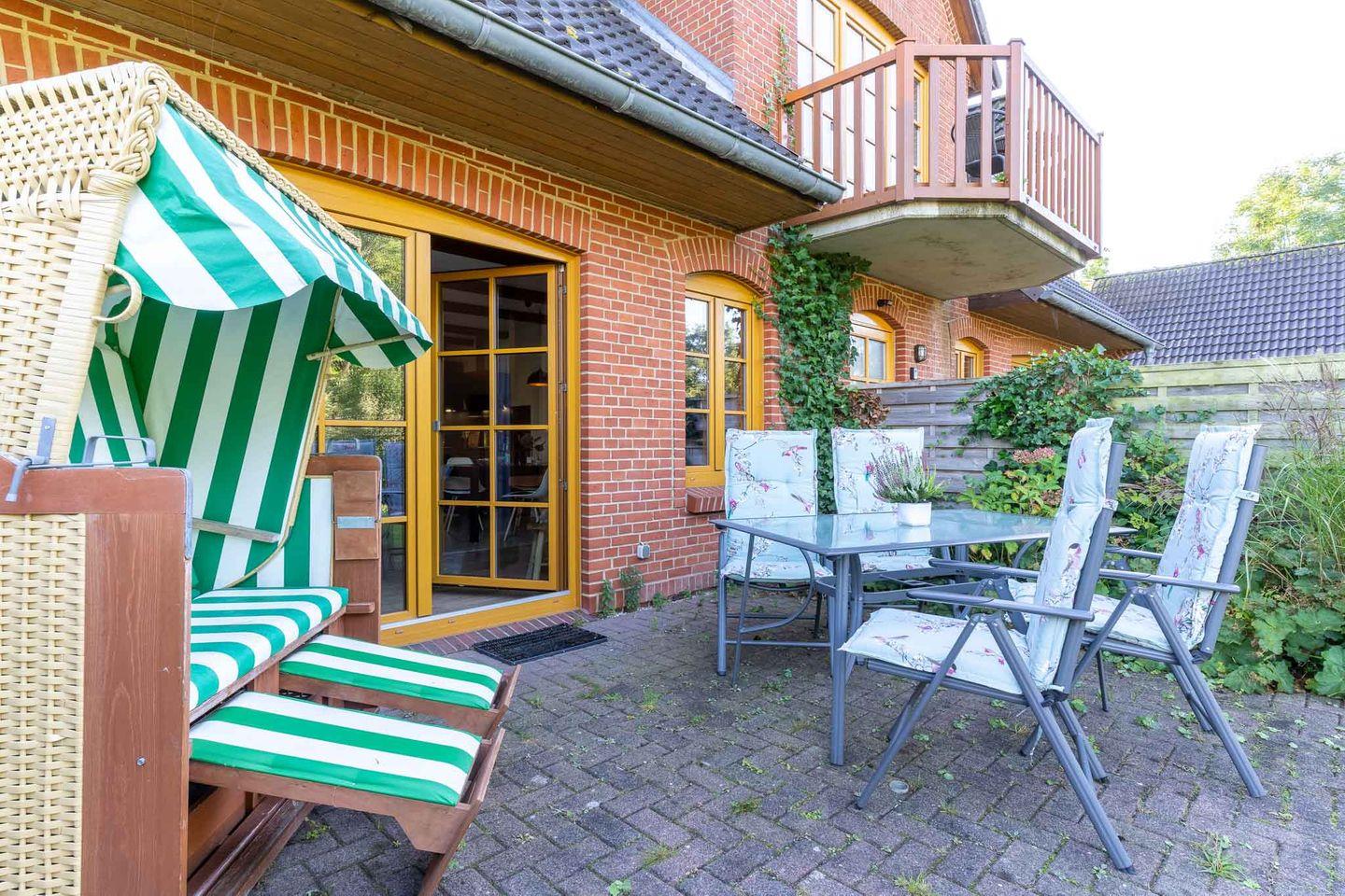 Die großzügige Wohnküche ist das Herzstück der Wohnung und bietet Ihnen alles, was Sie für einen gemütlichen Aufenthalt benötigen. Hier finden Sie nicht nur eine voll ausgestattete Küche, sondern auch einen Kamin, der an kühlen Abenden für eine angenehme Wärme sorgt. Vom Essbereich aus haben Sie direkten Zugang zur möblierten Terrasse mit Strandkorb. Hier können Sie die frische Luft genießen und den Blick in den großen Garten schweifen lassen.