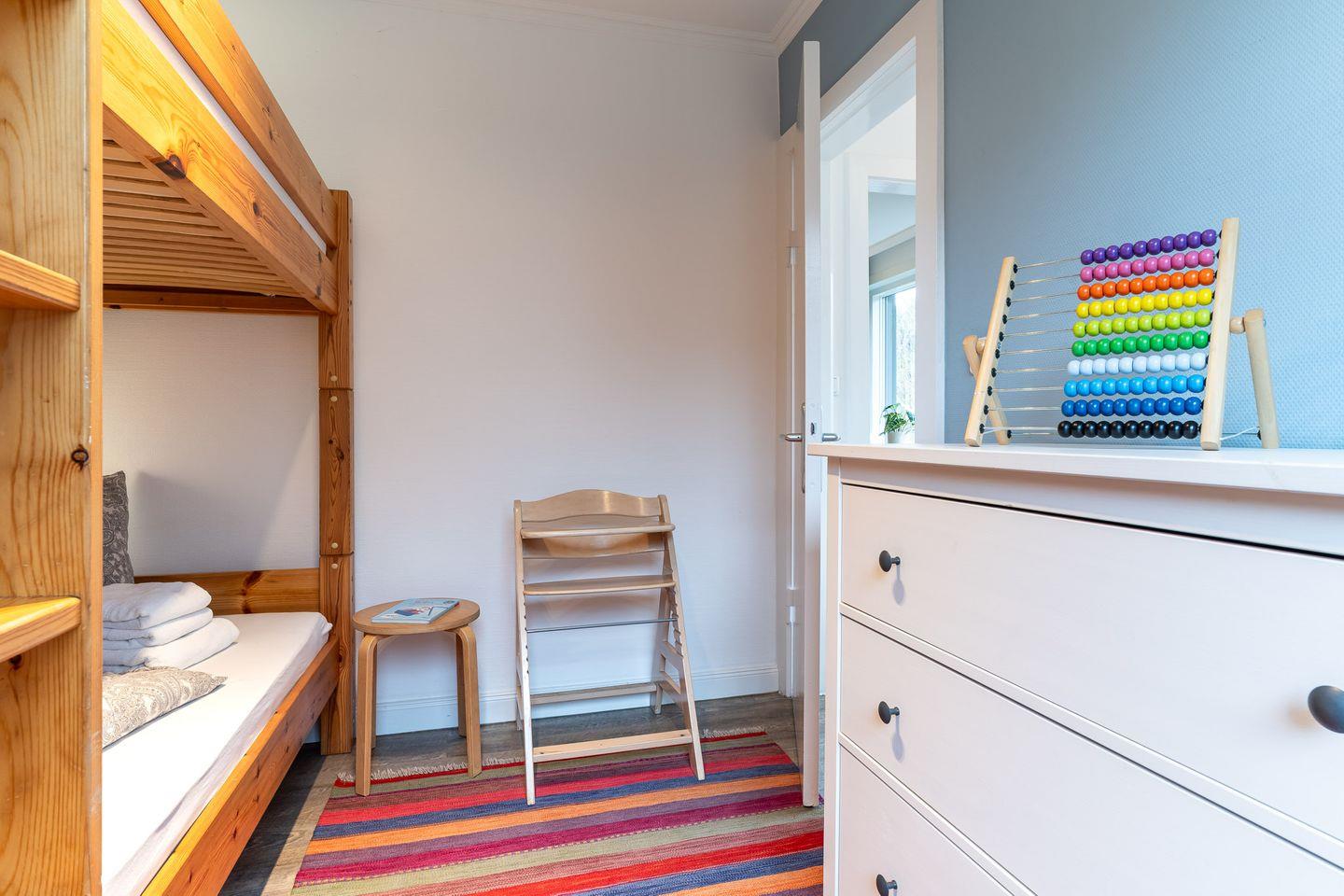 Das kinderfreundliche Schlafzimmer ist mit einem Doppelstockbett und einer Kommode ausgestattet, ideal für junge Gäste.
