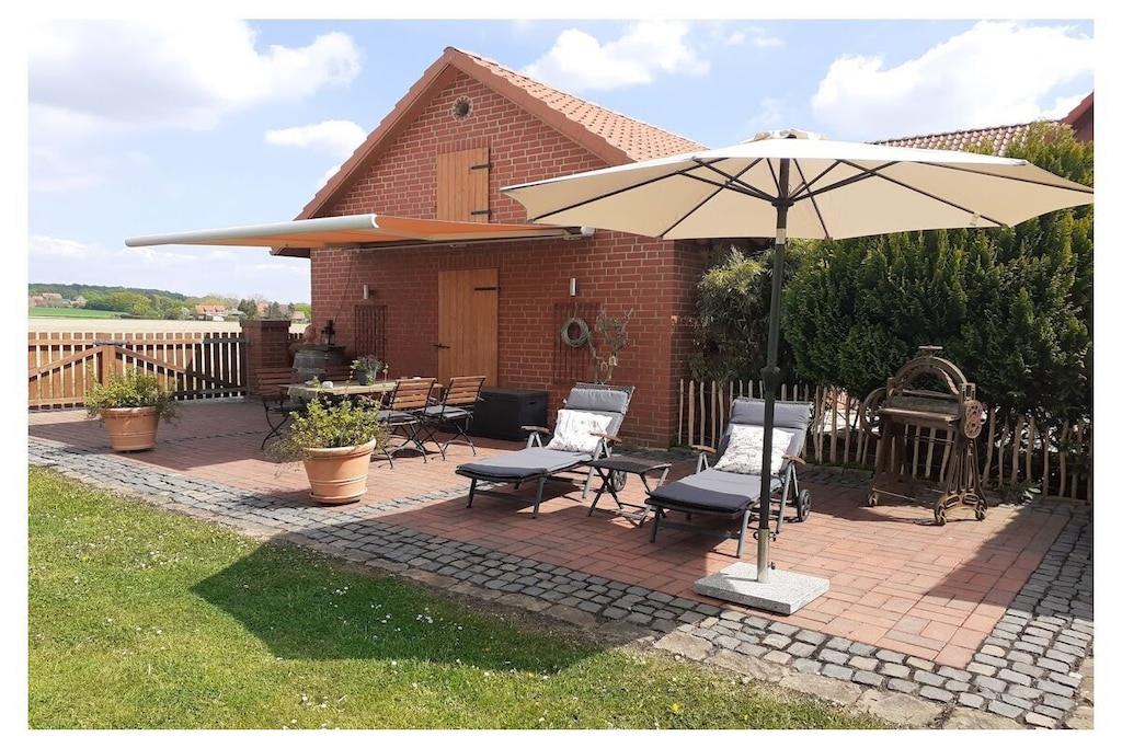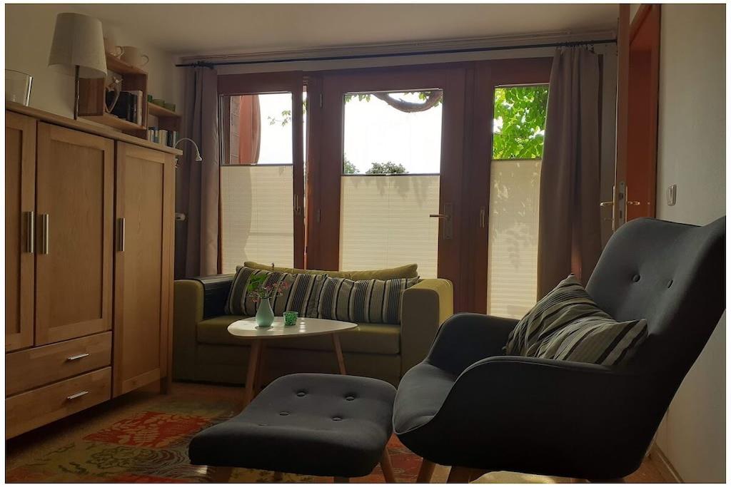 Das Apartment ist geeignet für zwei Personen. Die Wohnung beinhaltet eine Küche und ist komplett mit Geschirr und Kochgeschirr ausgestattet. Ausgestattet ist die Küche mit einem 4 Plattenkochherd und Backofen, Mikrowelle, Kaffeemaschine, Spülmaschine etc.. Der Wohnschlafbereich hat ein Doppelbett, eine Sitzecke, Fernsehen, Radio/CD - Player und WLAN. Ein Kinderreisebett kann genutzt werden Das Badezimmer ist ebenerdig und hat eine Dusche. Vor dem Haus befindet sich eine Sitzgelegenheit. Außerdem ist eine Gartennutzung und Sitzecke auf dem 2500 qm großen Grundstück vorhanden. Waschmaschine und Sauna auf Anfrage und Aufpreis. Fahrräder sind vorhanden und können genutzt werden. Eigene Fahrräder können sicher unter gestellt werden. Es gibt auch eine Wallbox zum Laden von Elektrofahrzeugen (zum aktuellen Tageskurs)