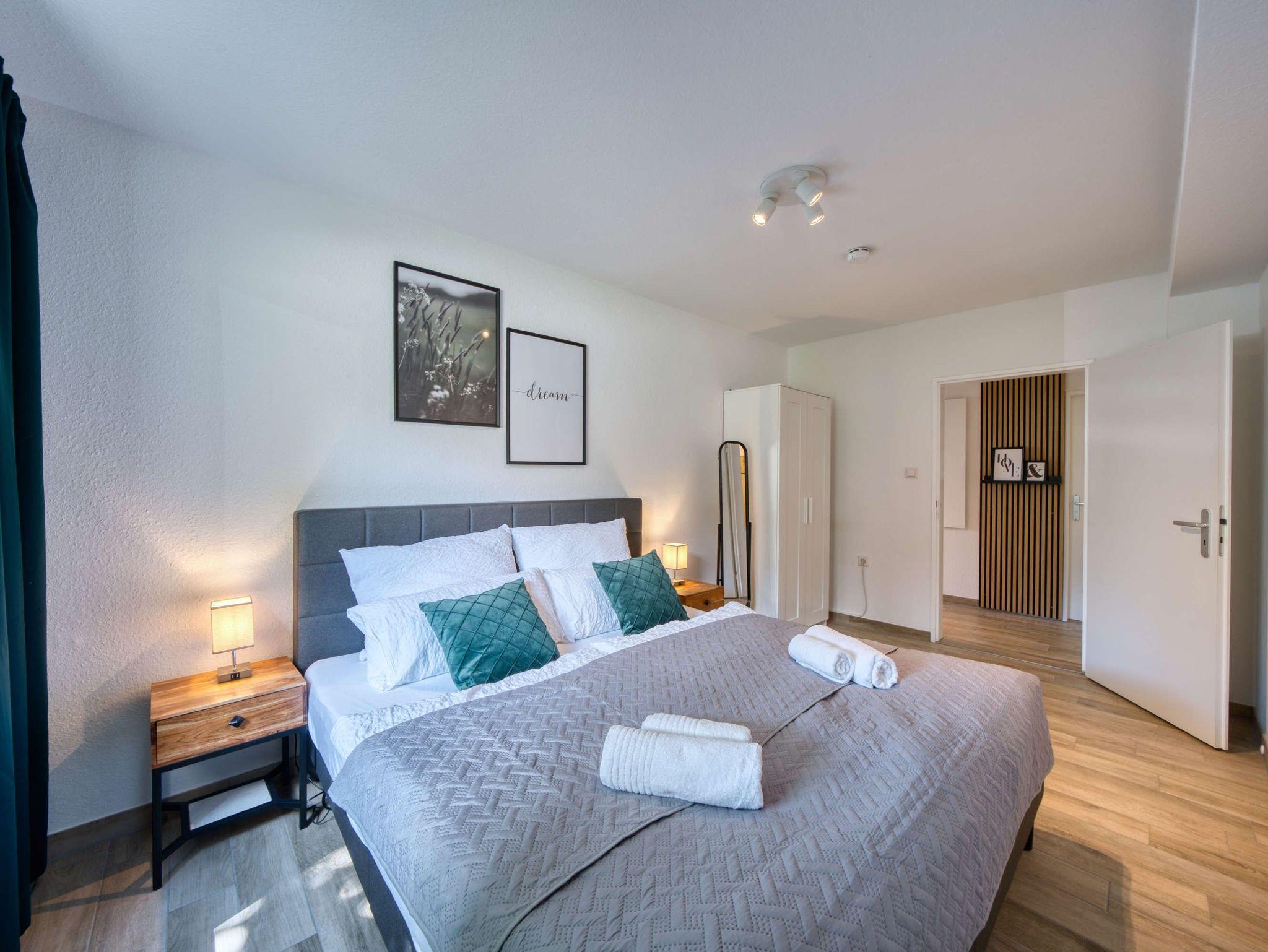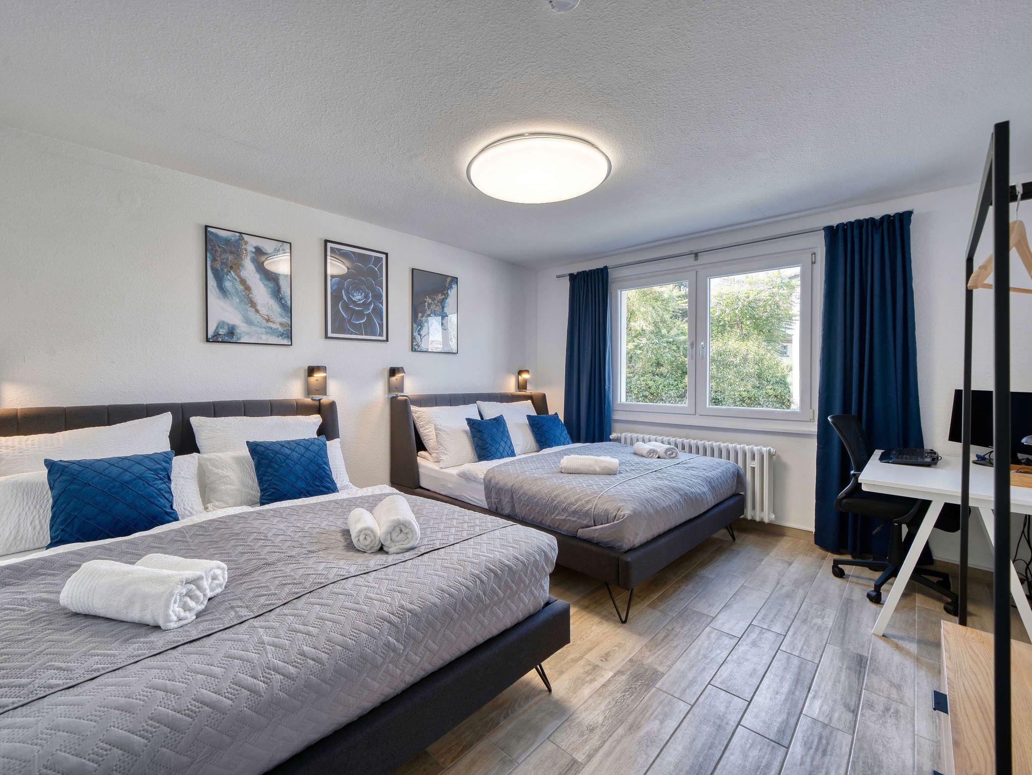 - 2 Schlafzimmer: 2x Queensize Doppelbetten, Spiegel, Kleiderschrank, Handy Ladekabel, Schreibtisch mit Stuhl, Bildschirm, Tastatur und Maus