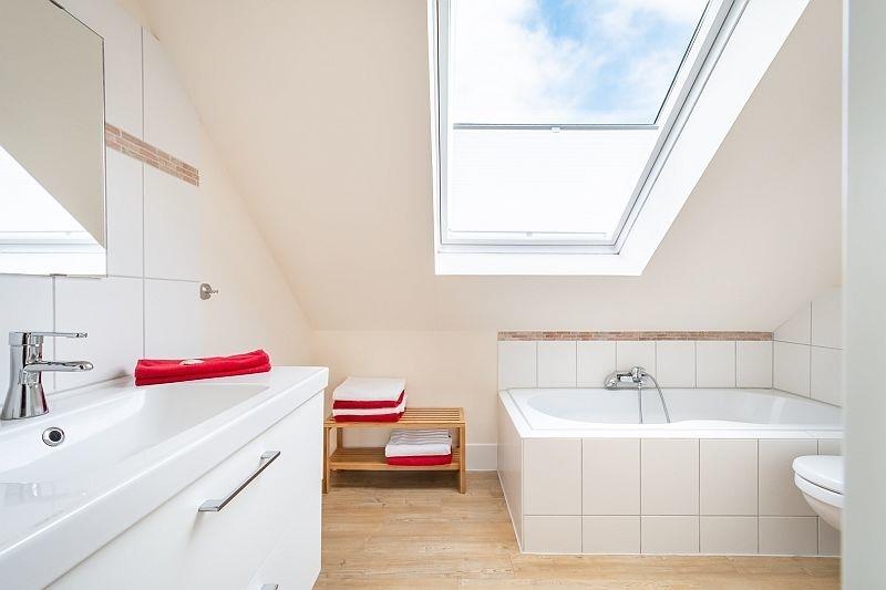 Der geräumige Wohn-/Essbereich mit integrierter und komfortabel ausgestatteter Einbauküche bietet sehr viel Platz zum geselligen Beisammensein mit Familie oder Freunden. Die beiden separaten Schlafzimmer mit Doppelbett und Kleiderschrank geben Raum zum Ausruhen und Zurückziehen. Als Highlight verbirgt sich über den beiden Schlafzimmern ein Alkoven als Schlafmöglichkeit für zwei weitere Personen, der über eine Leiter vom Wohnzimmer aus erreichbar ist. Von hier können Sie sogar das Meer sehen. Das Badezimmer mit großem Fenster ist mit Dusche und Badewanne ausgestattet.