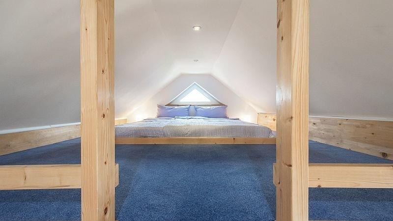Die Ferienwohnung "Möwe" liegt im 1. Obergeschoss des 2012 neu erbauten Holzhauses "Himmelblau" und bietet für 2 bis max. 6 Personen ein modernes Ambiente im mediterranen Stil. Die offene Balkenlage verleiht dieser Wohnung ihren besonderen Charakter.