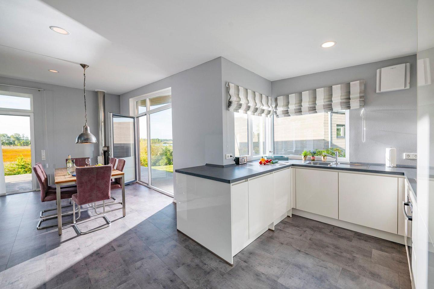 Die offene, hochwertig ausgestattete Küche geht fließend in den Essbereich mit massivem Esstisch über.