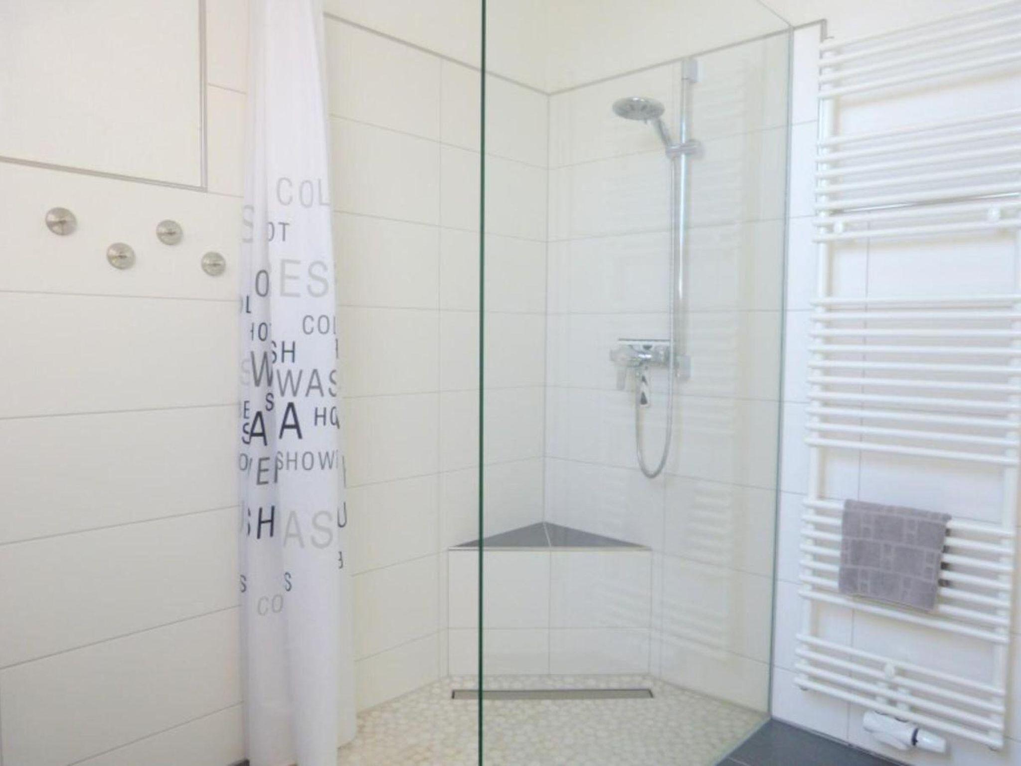 Das Highlight im hellen Tageslichtbad ist die große bodenebene, verglaste Dusche mit rutscharmen Mosaik-Bodenbelag. Neben umfangreichen Ablageflächen sowie einer automatische Nachtbeleuchtung, sorgt ein Handtuchheizkörper für Behaglichkeit bei kühleren Temperaturen. Ebenso finden Sie hier einen Fön, einen beleuchteten Kosmetikspiegel, kuschelige Hand- und Duschtücher sowie für die kleine Wäsche zwischendurch eine Waschmaschine vor.