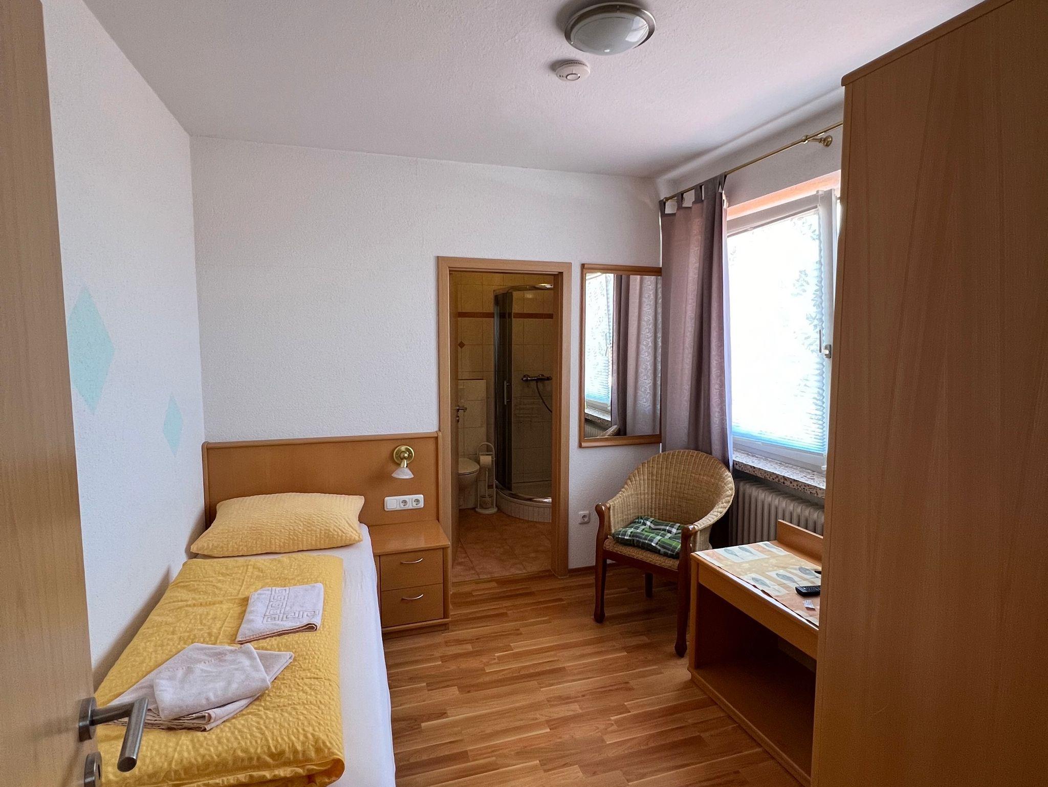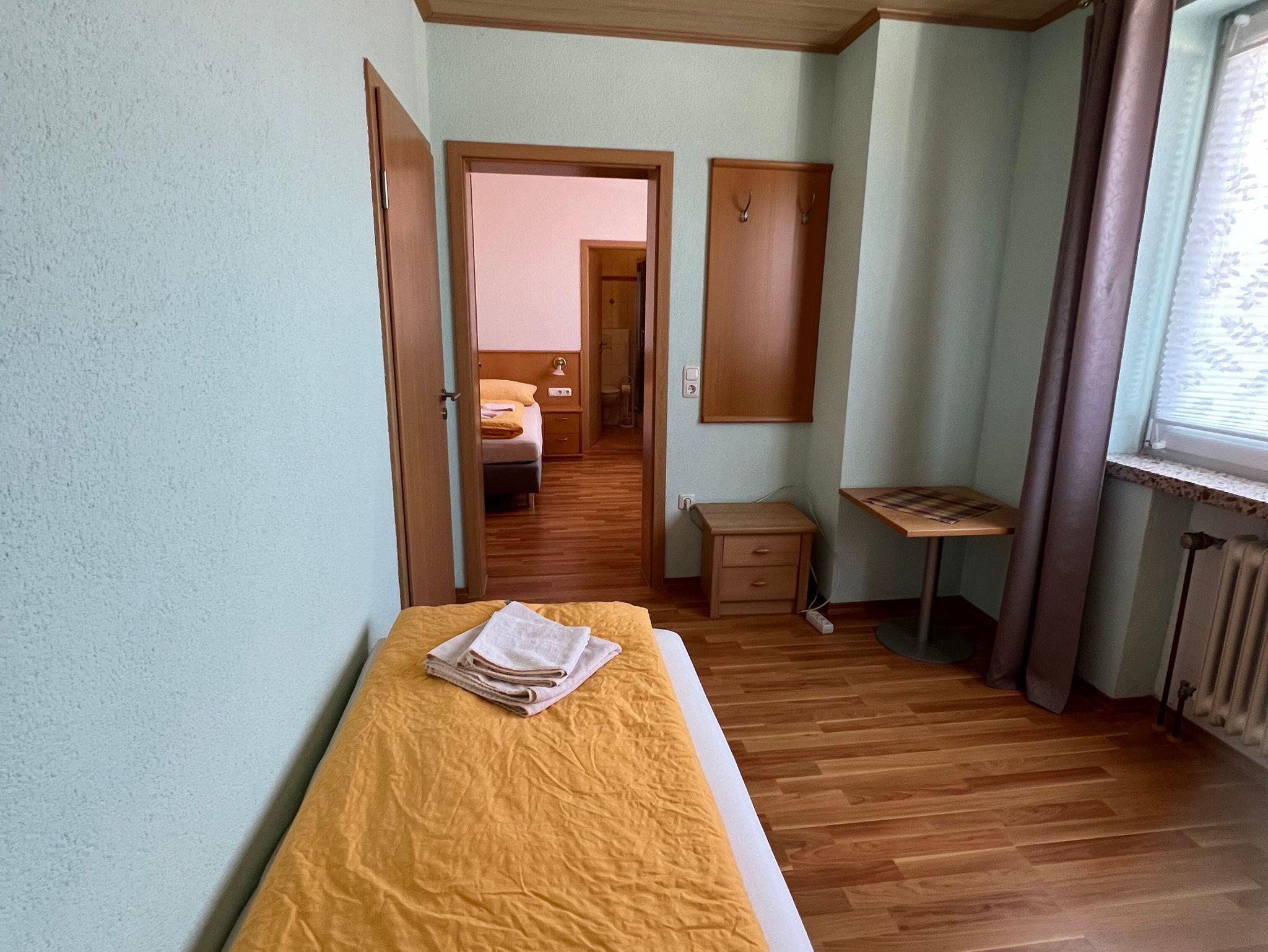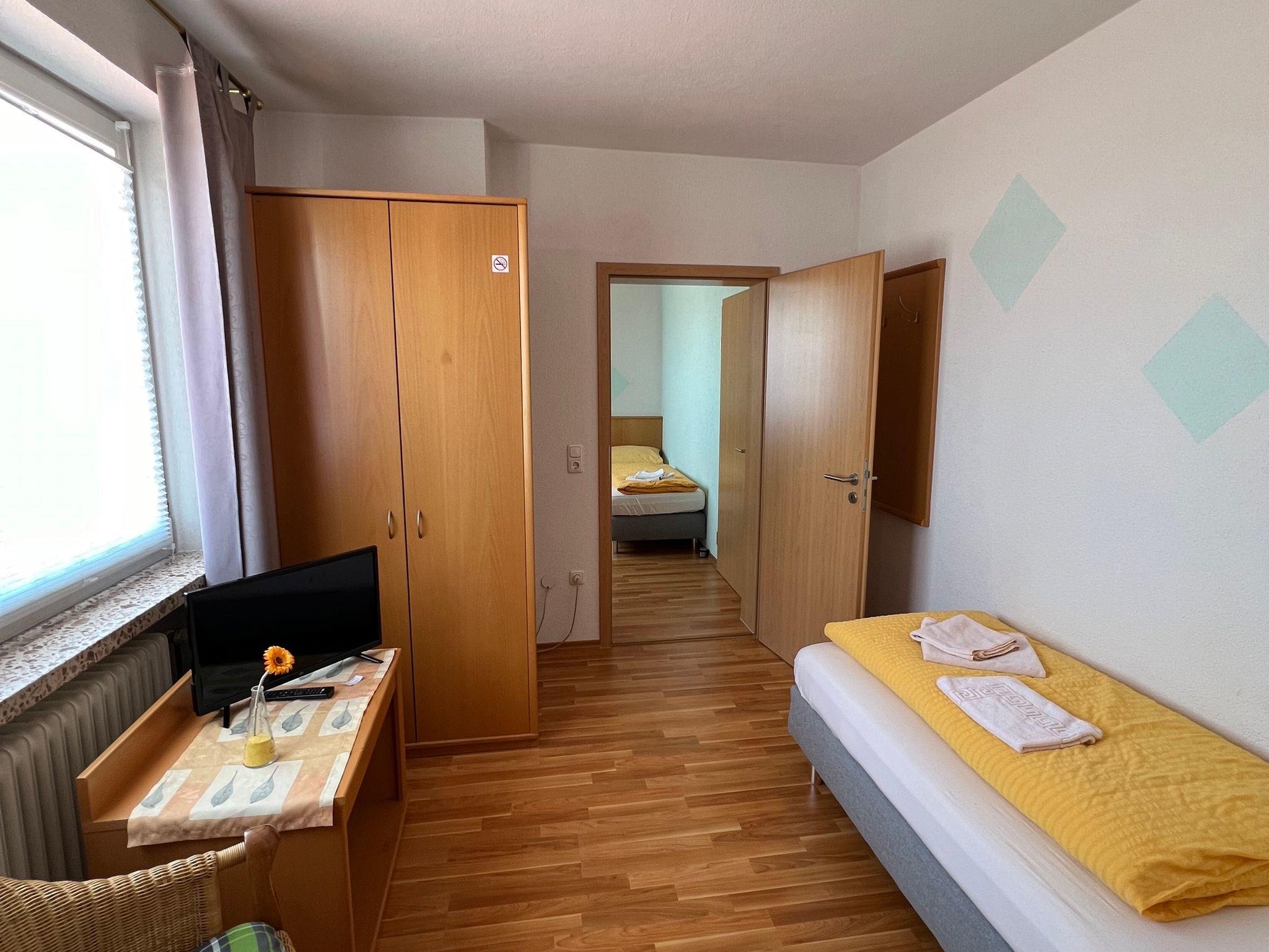 Das helle, freundliche Durchgangszimmer mit zusammen 18 qm verfügt über ein Schlafzimmer durch das ein weiteres Schlafzimmer erreichbar ist. Beide Zimmer verfügen über ein Einzel Boxspringbett und einen eigenen Flachbildfernseher sowie WLAN. Das Badezimmer befindet sich im Anschluss an eines der Zimmer und verfügt über Dusche und WC. Handtücher und Bettwäsche stehen zur Verfügung.