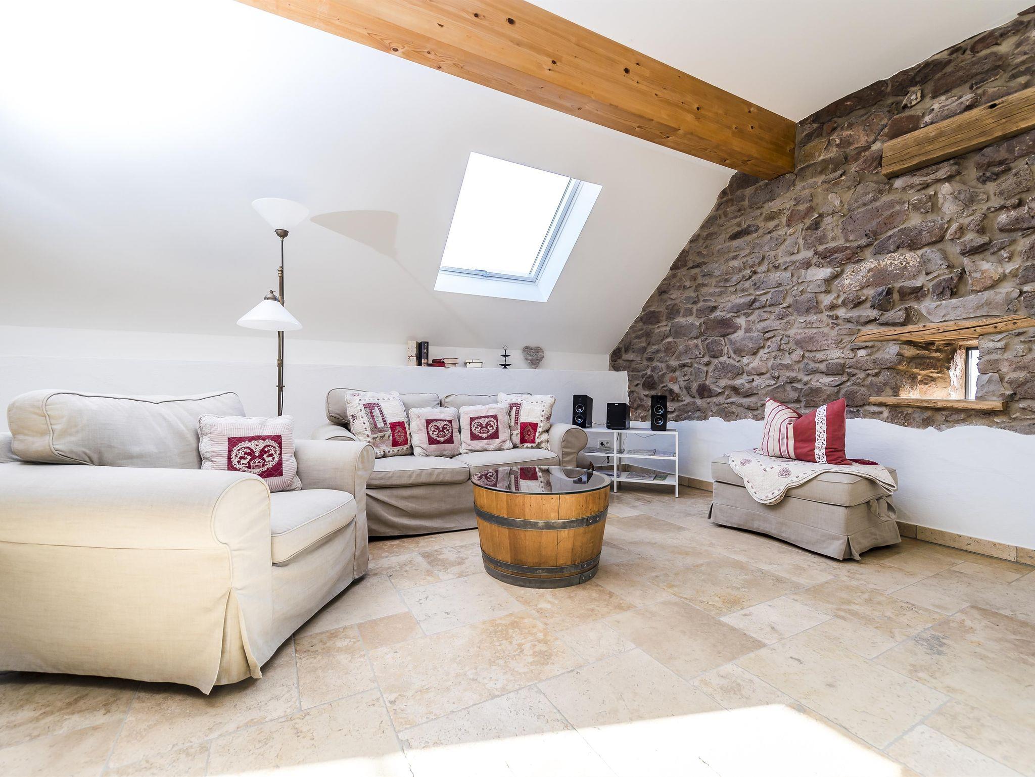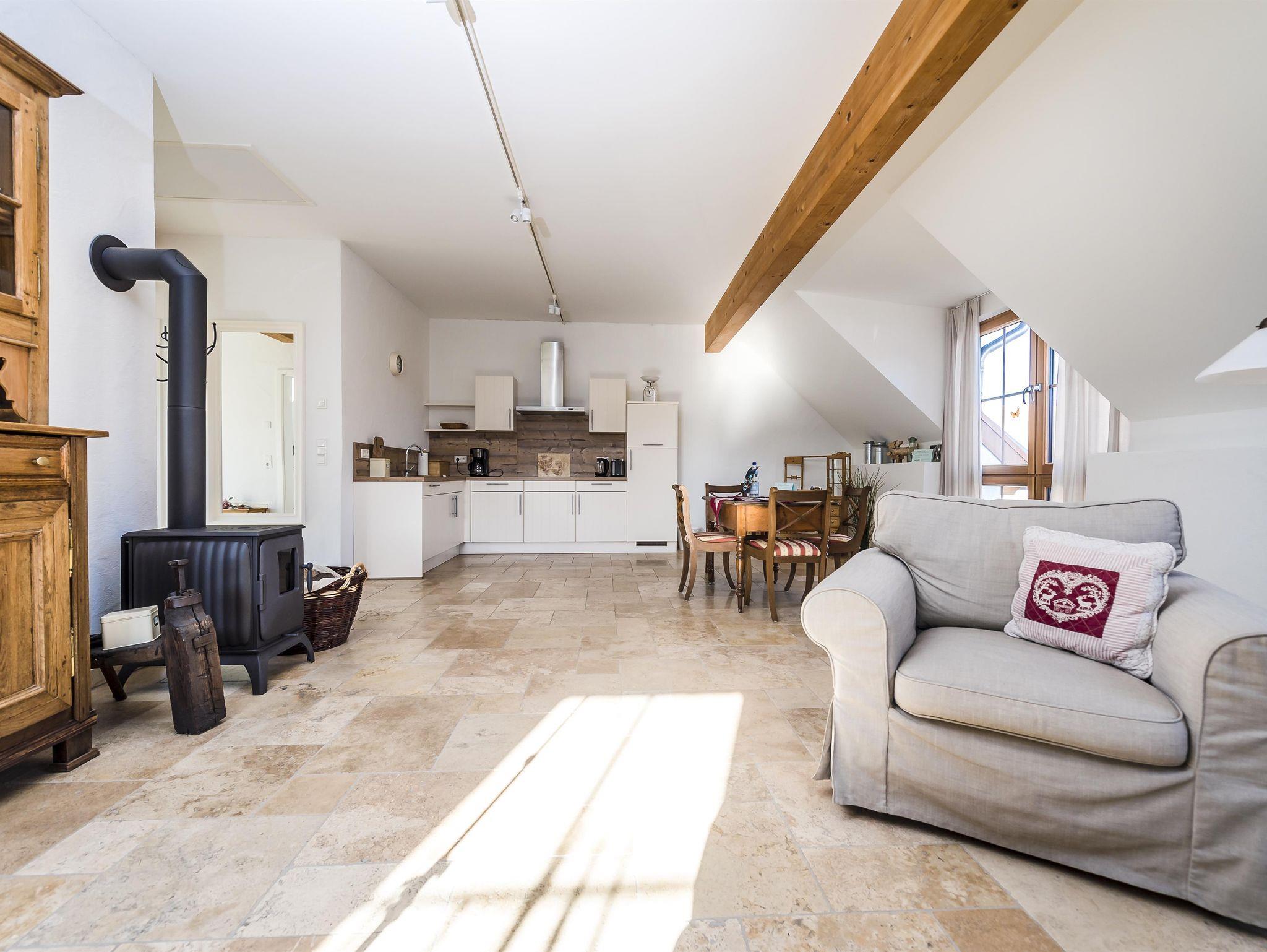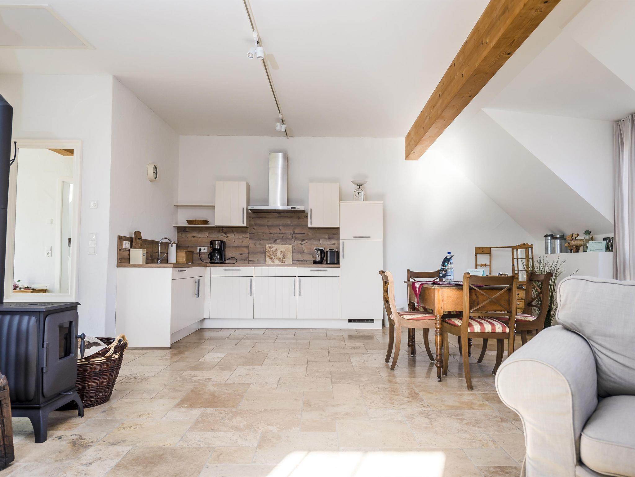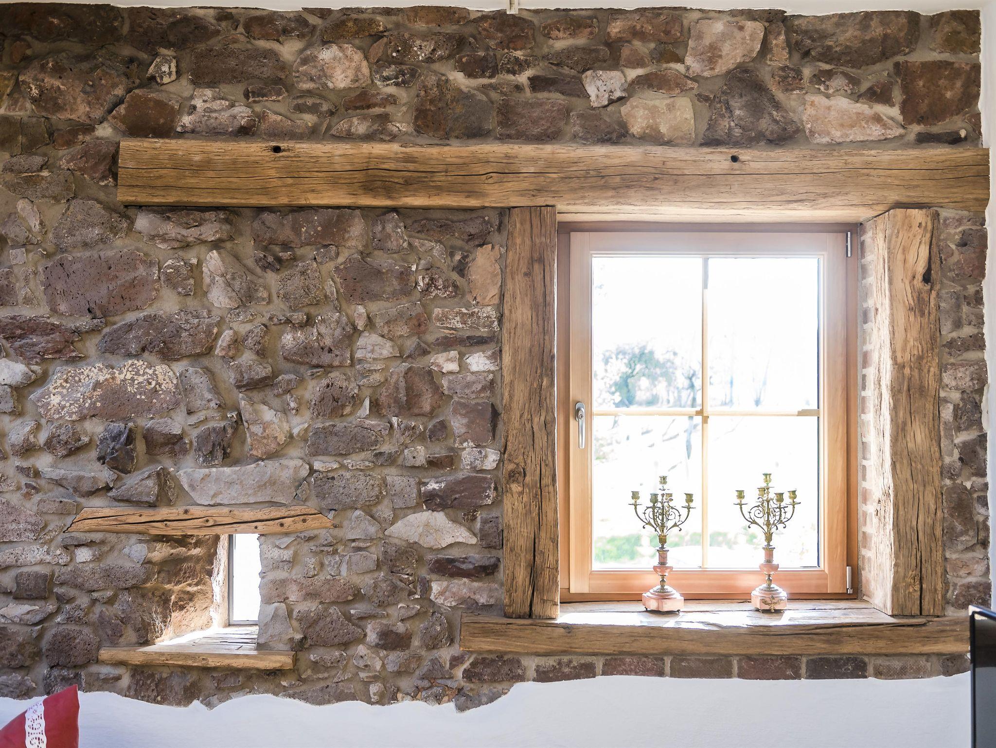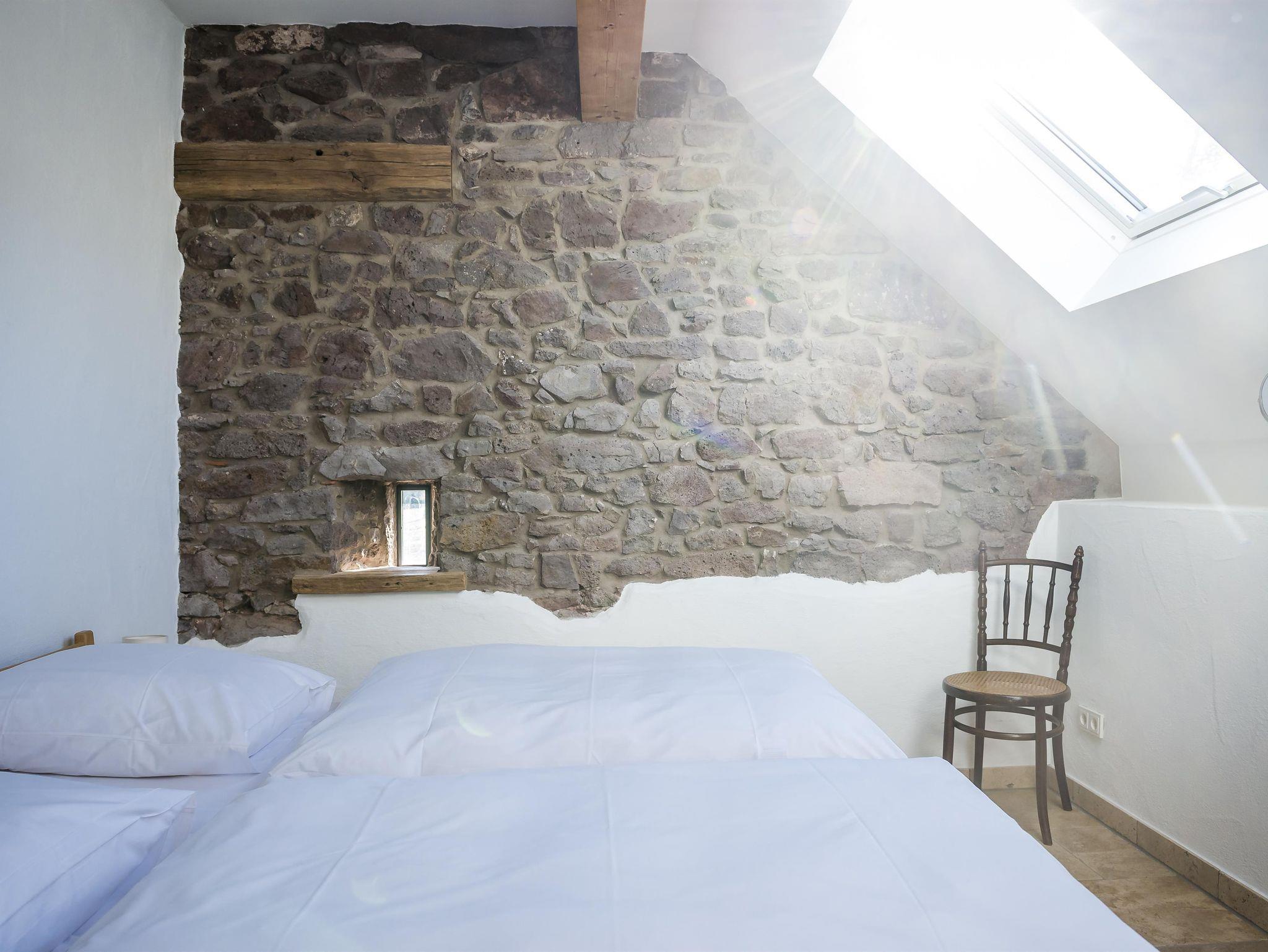 Lichtdurchflutet präsentiert sich Ihnen die großzügige Ferienwohnung „Hölzchen“. Im großen Wohn-Essraum verbringen Sie unbeschwerte Stunden zu zweit bei knisterndem Feuer aus dem Kaminofen, das sich im Bruchsteinmauerwerk reflektiert. Im Schlafzimmer mit Bruchsteinwand und Kronleuchter schlafen auch Sie wie einst Graf und Gräfin in einem Schloss.