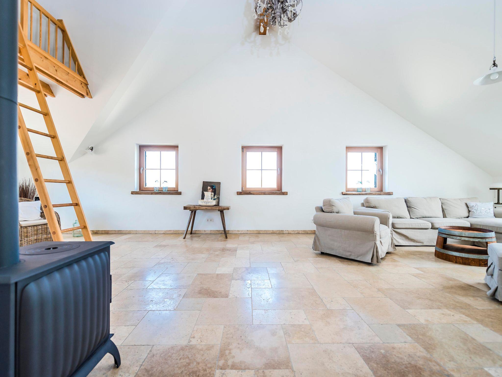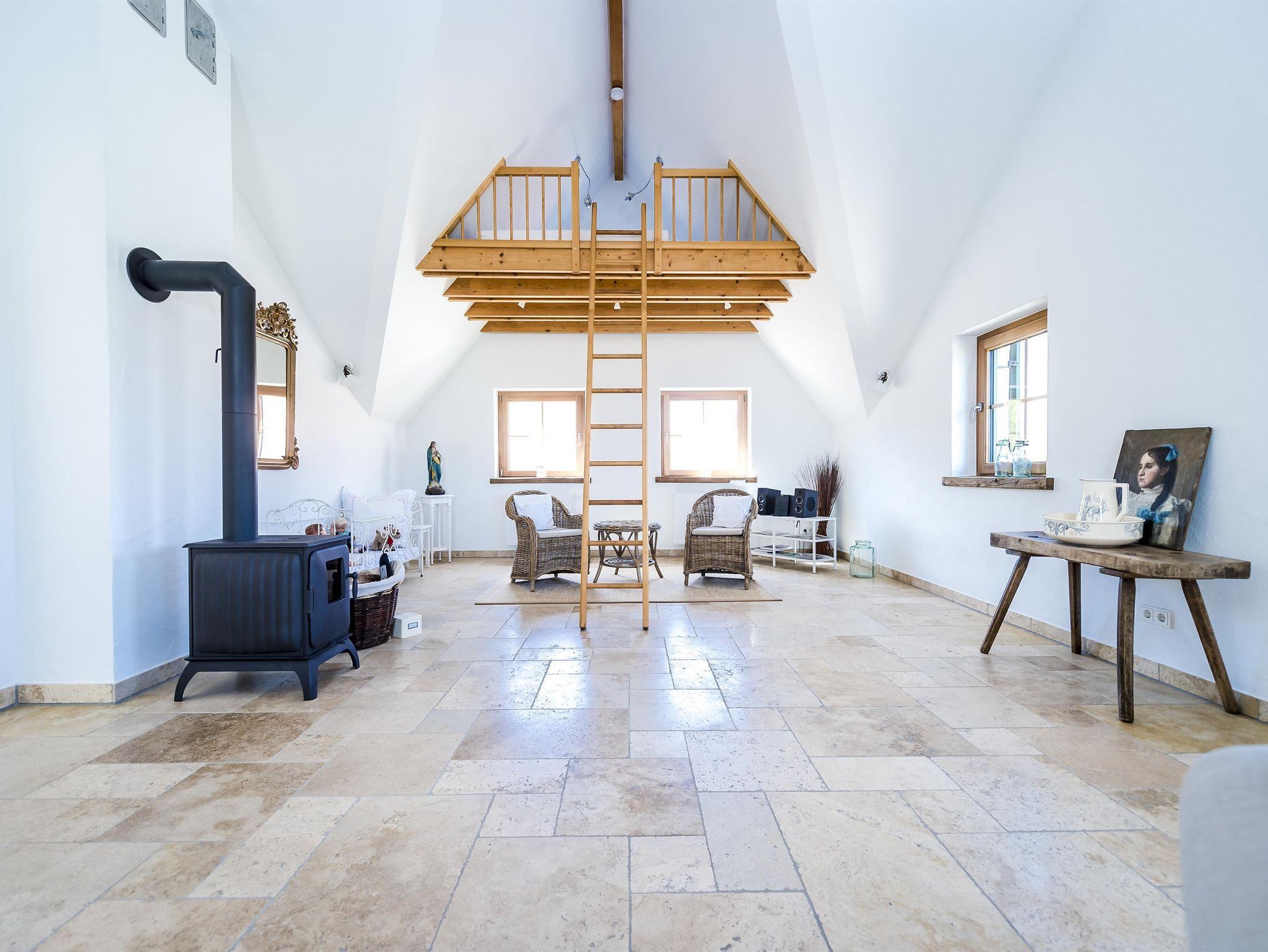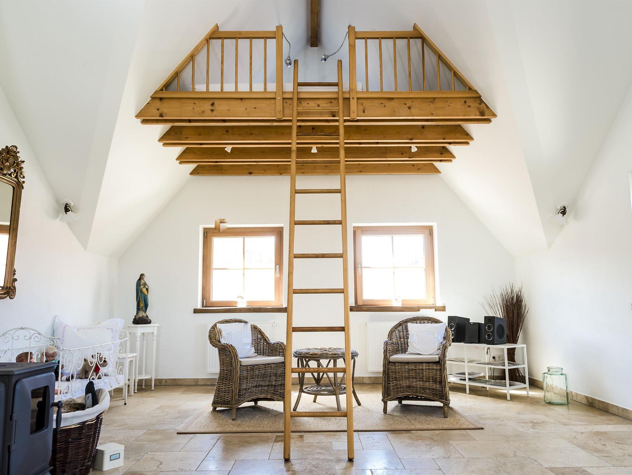 Ihr Blick schweift beim Betreten des Wohraumes rundum aus den Sprossenfenstern in die Ferne über Wiesen und Wald in Richtung der alten keltischen Fliehburg „Schwarzenburg“. Genießen Sie die Großzügigkeit und das Raumangebot unserer größten Ferienwohnung. Als besonderes Highlight ist der Wohnraum bis in den Dachstuhl offen, mit Kronleuchter und stilechtem Kaminofen sowie einer kuscheligen Wohlfühlempore ausgestattet.