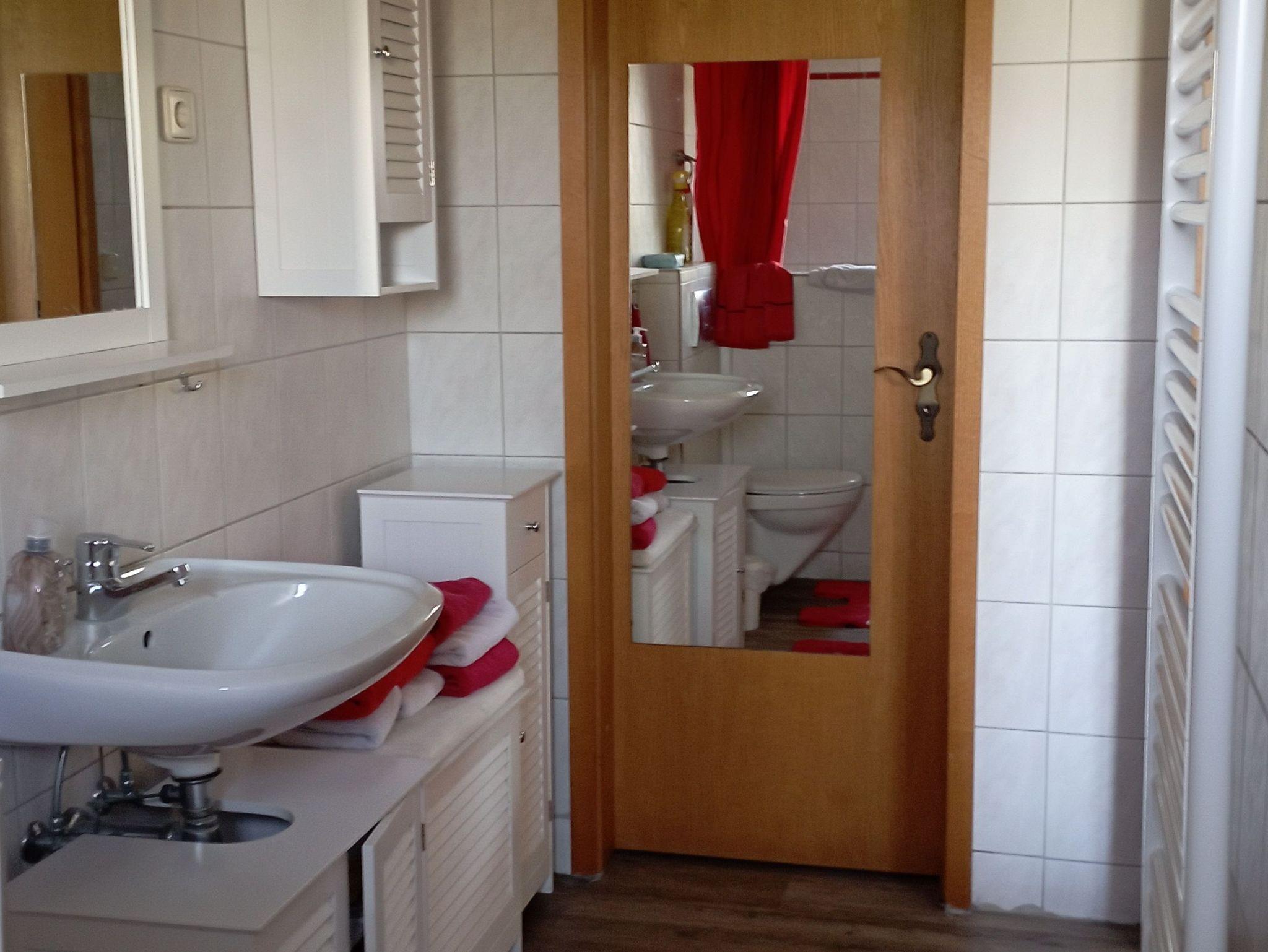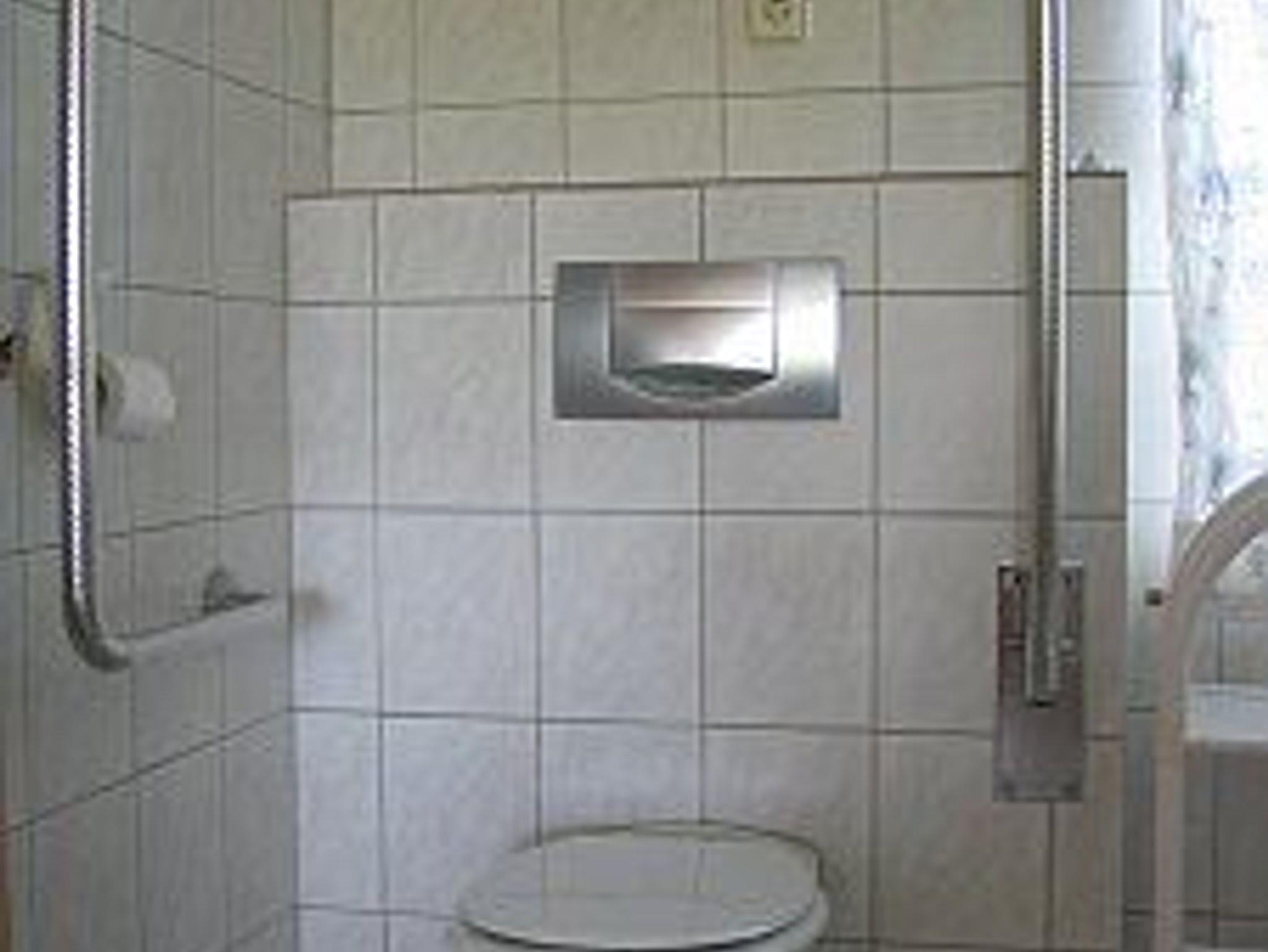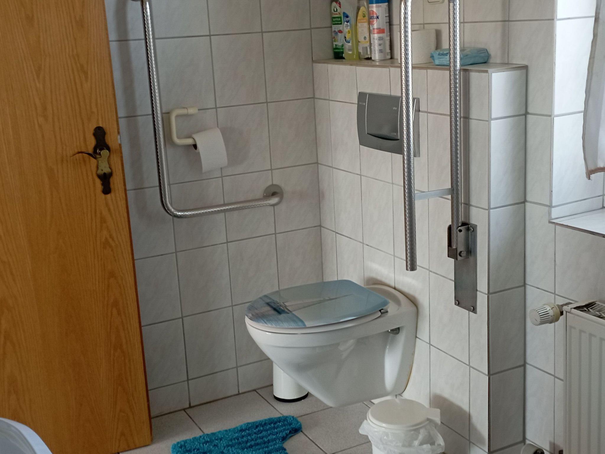 Im Obergeschoß ,über die Terrasse zu erreichen, ist ein Badezimmer mit behinderten gerechter Dusche und WC. Im Wohnzimmer bietet ein Schlafsofa noch zwei weitere Schlafmöglichkeiten.