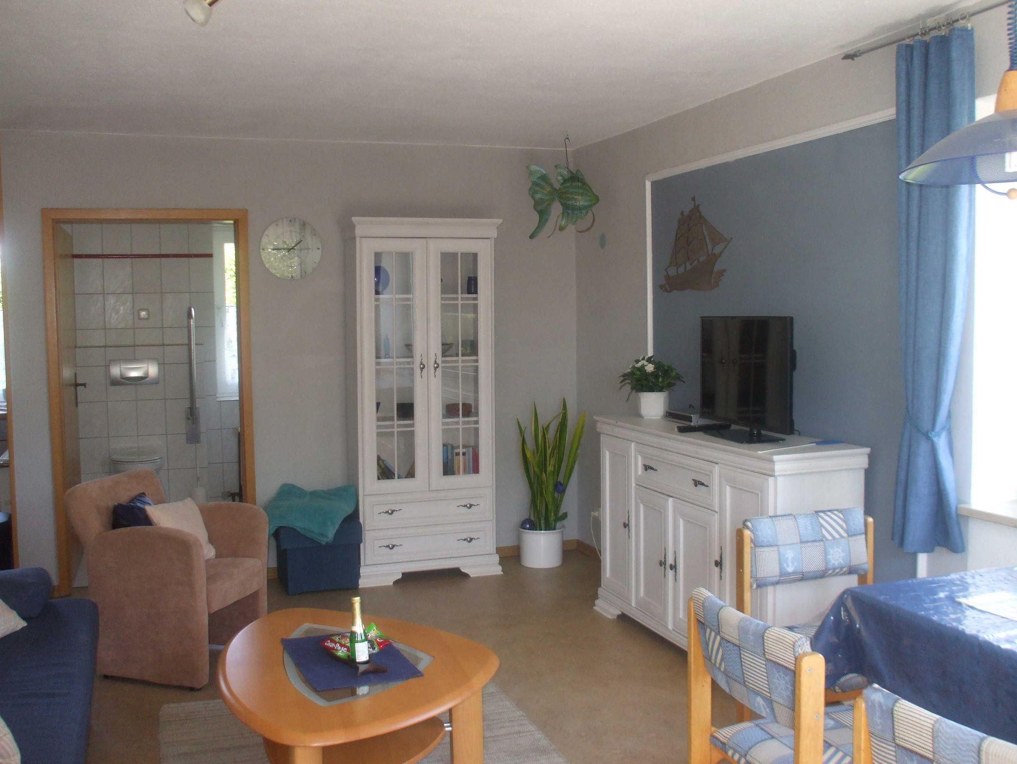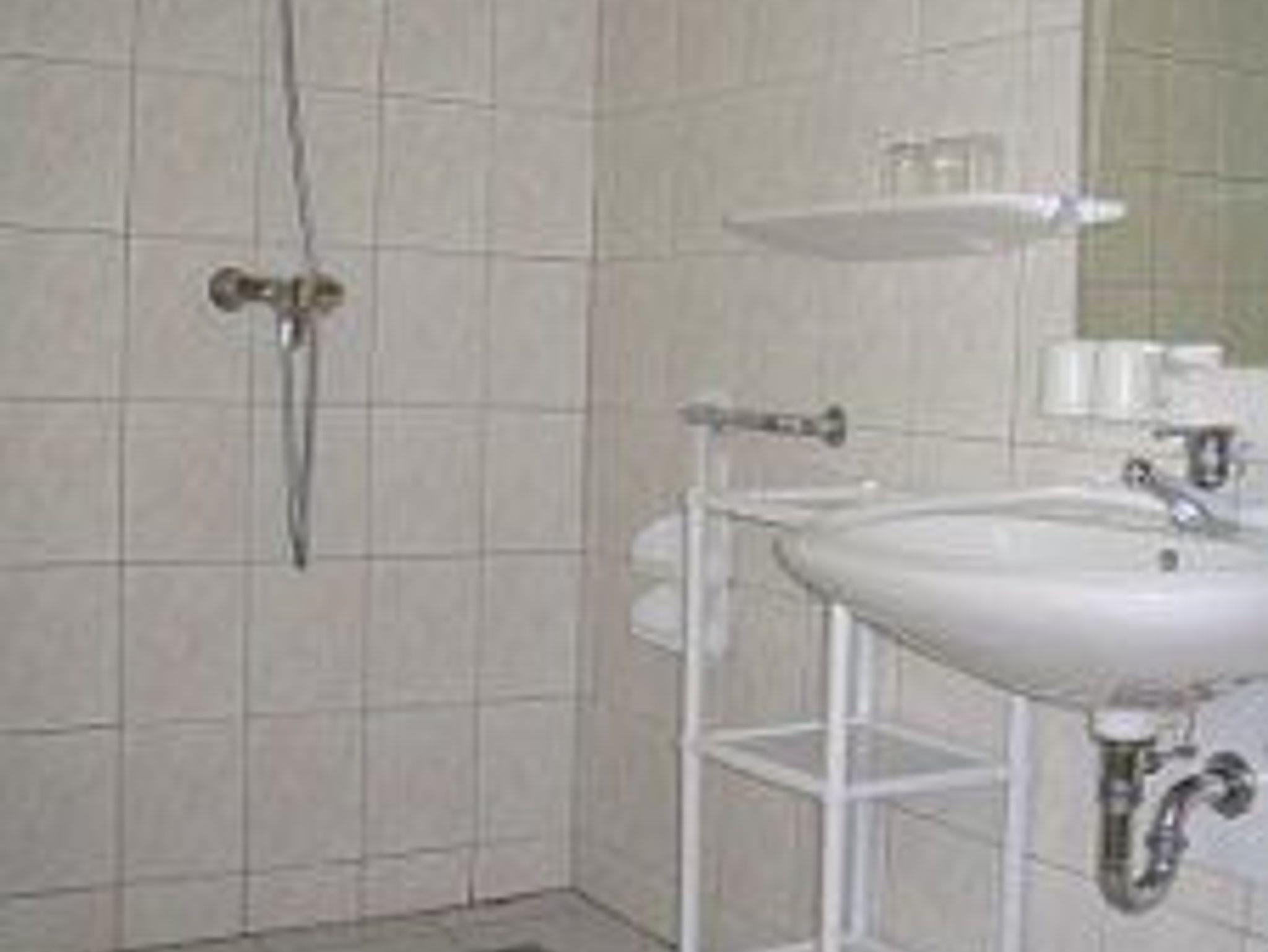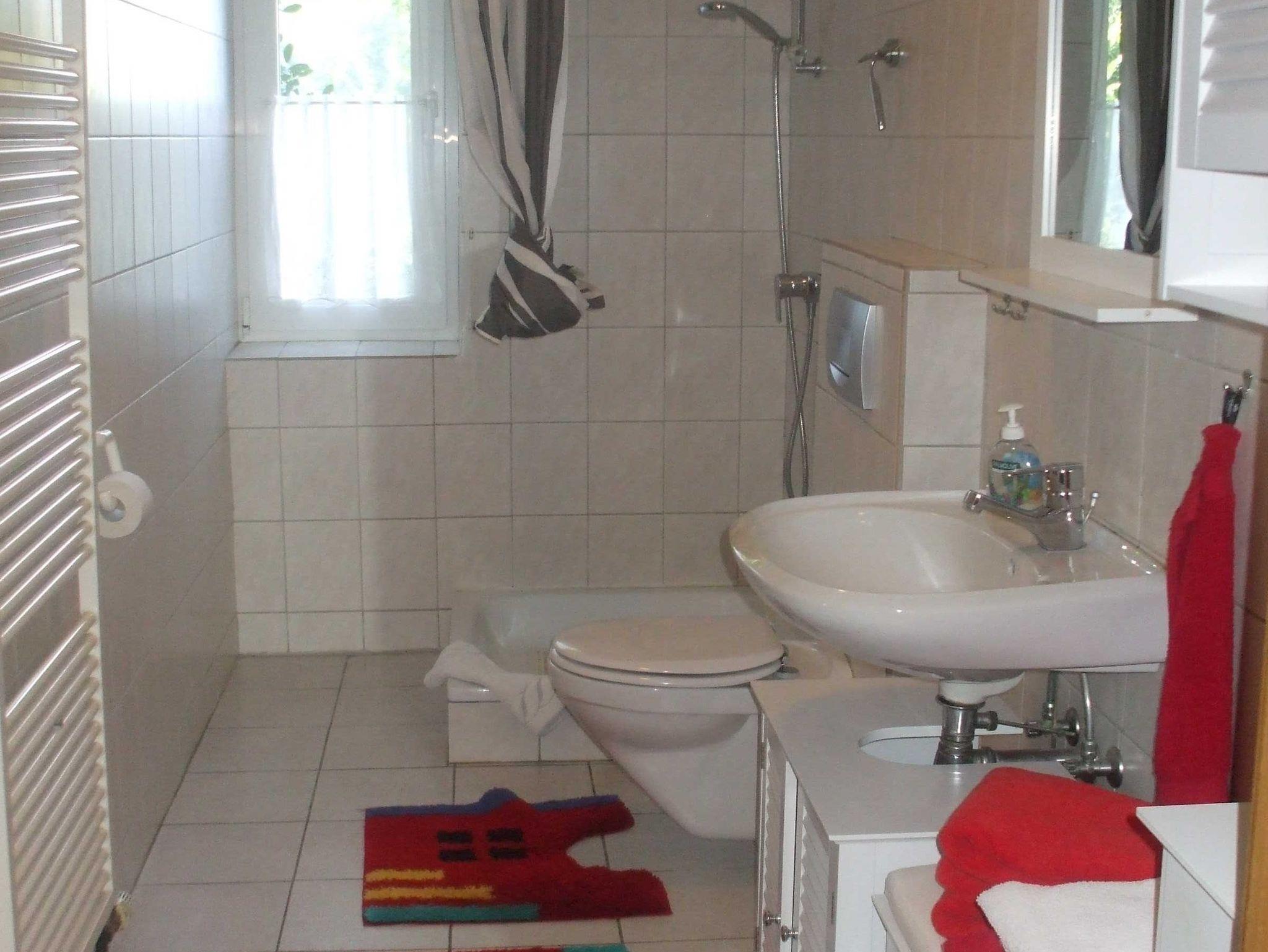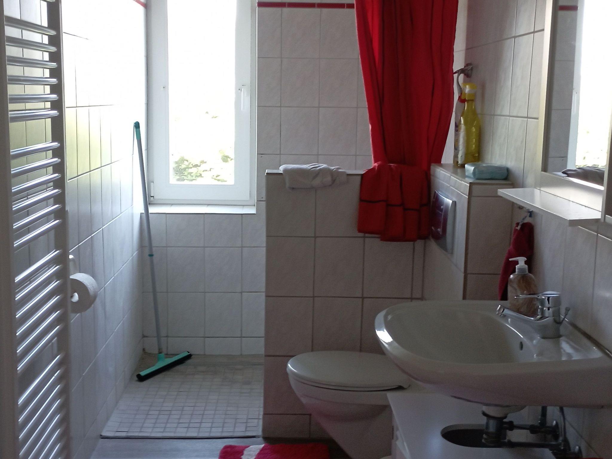 Im Obergeschoß ,über die Terrasse zu erreichen, ist ein Badezimmer mit behinderten gerechter Dusche und WC. Im Wohnzimmer bietet ein Schlafsofa noch zwei weitere Schlafmöglichkeiten.