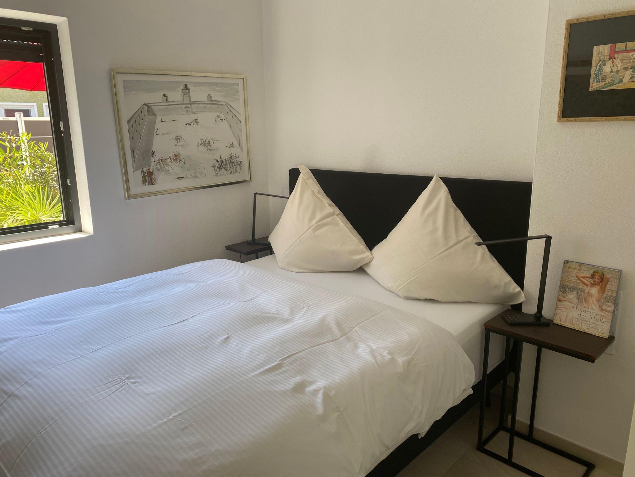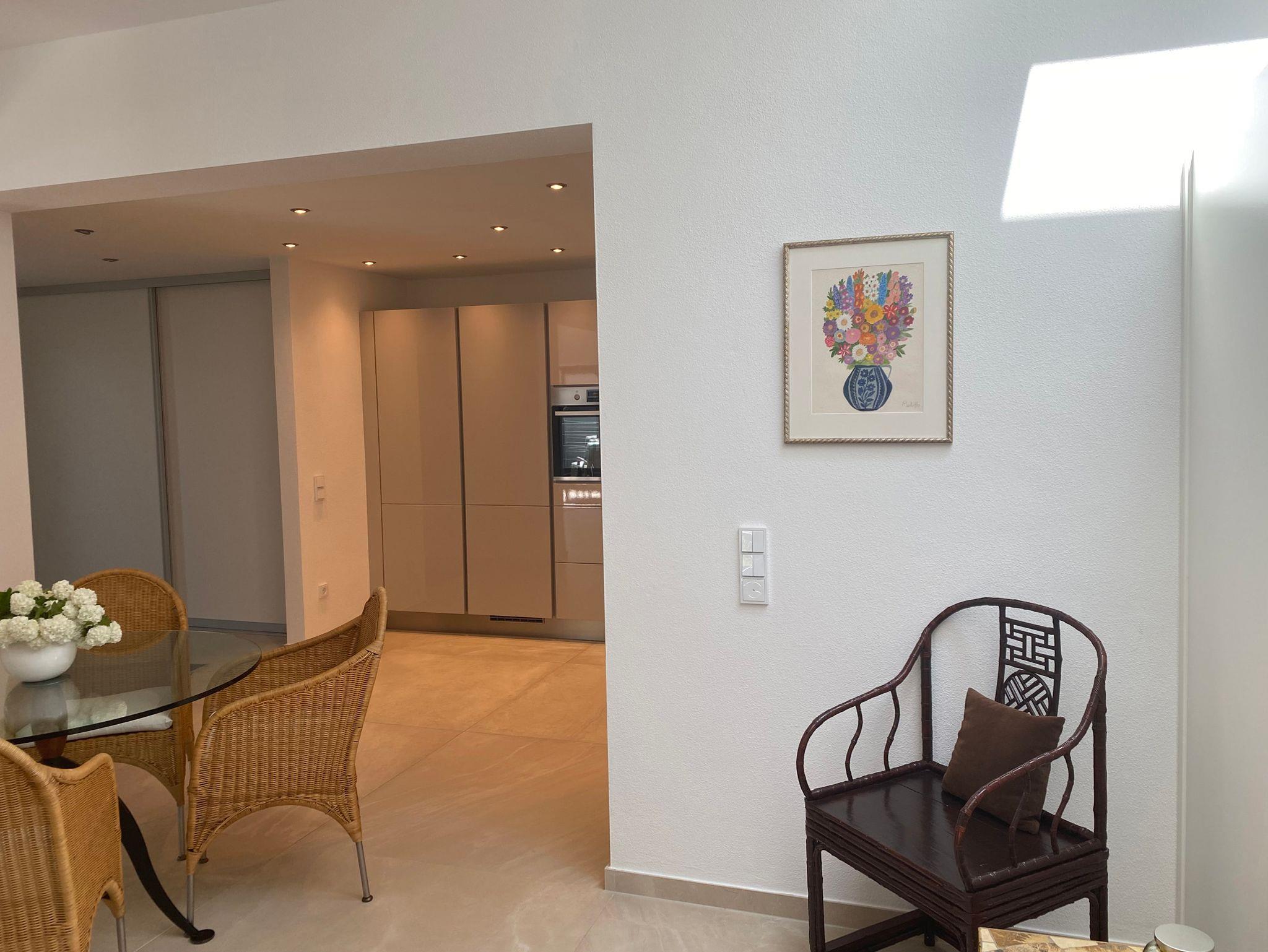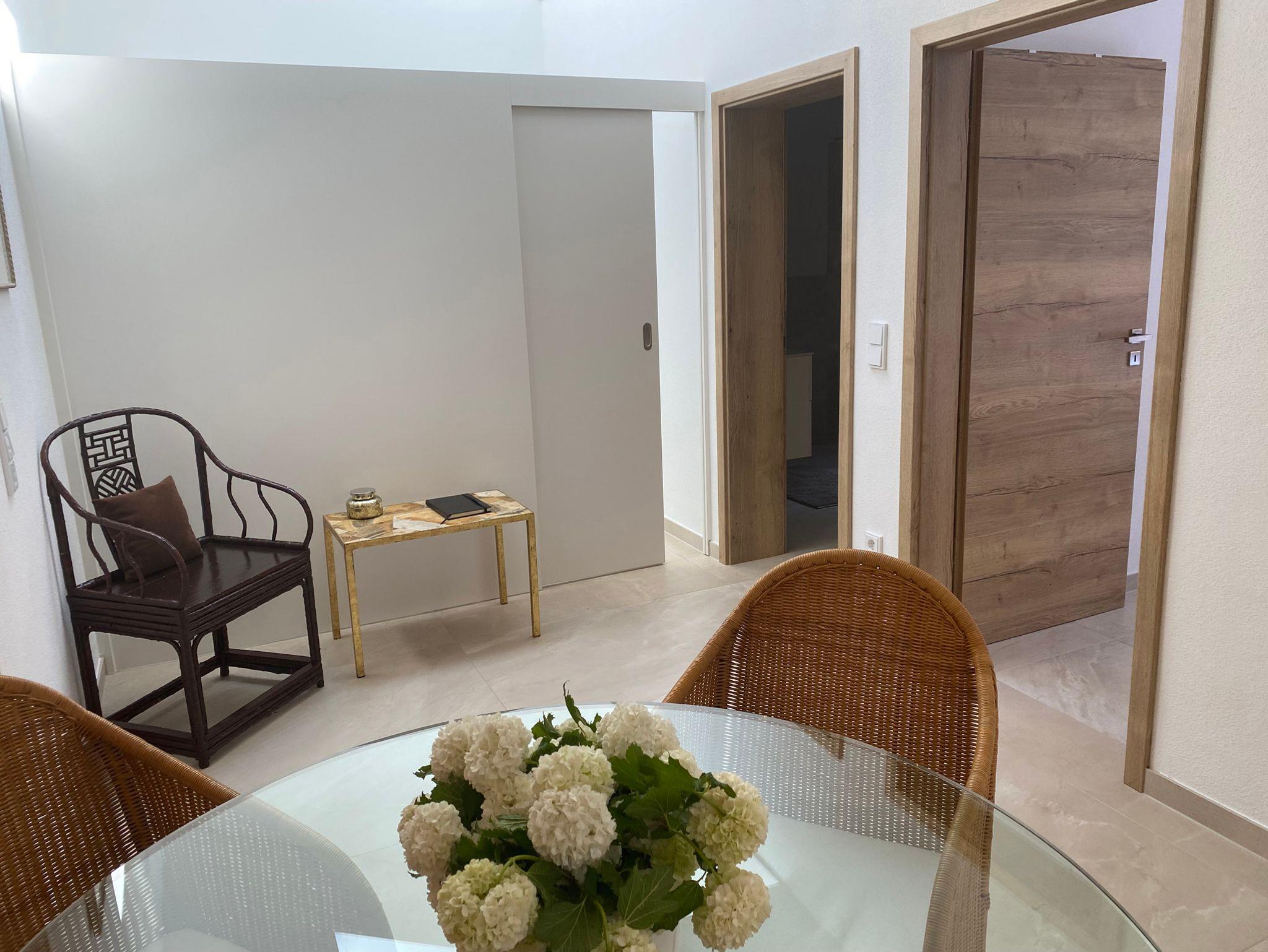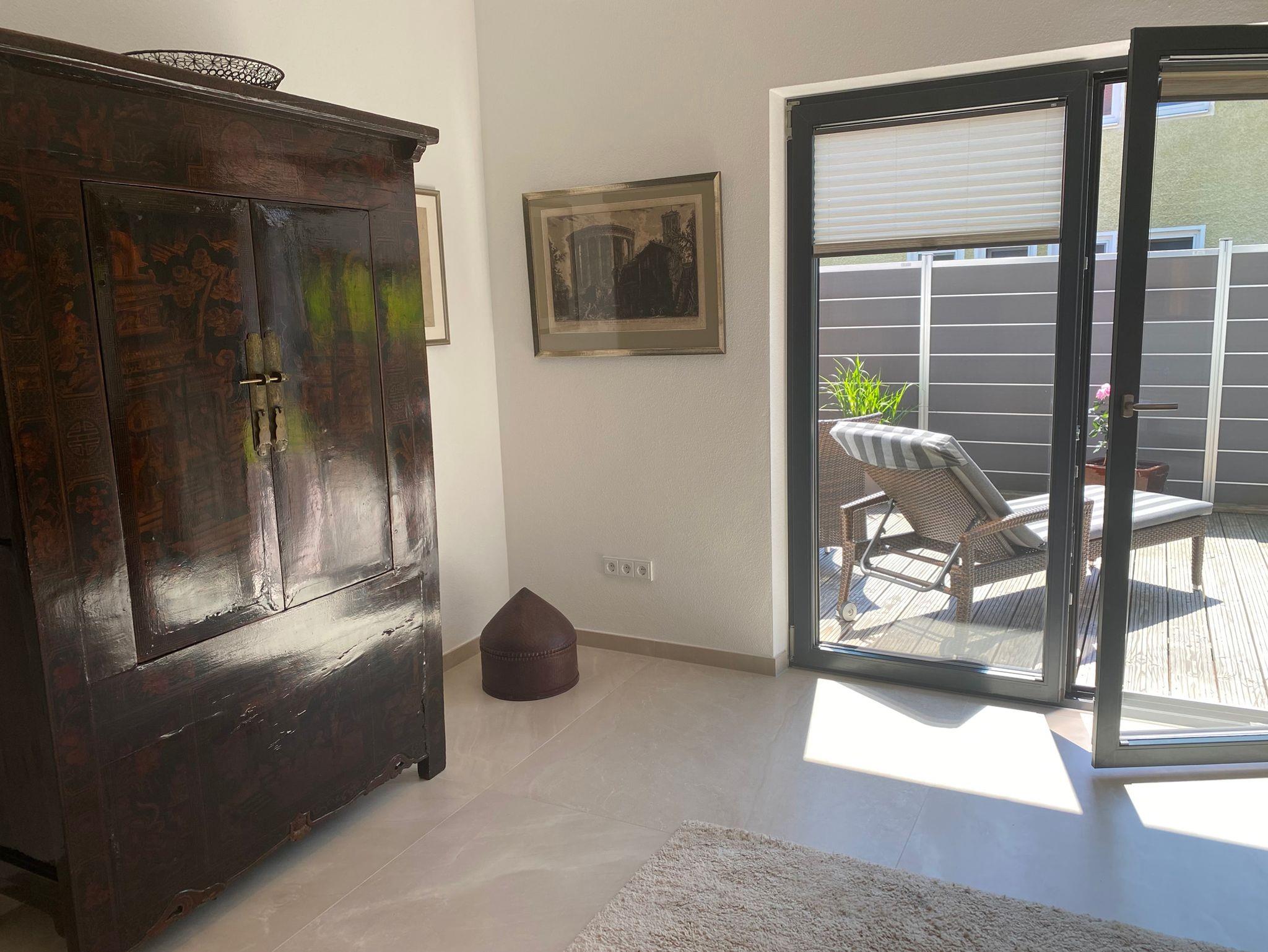 Hochwertig ausgestattete Ferienwohnung für 2 Personen, die Wohnung liegt im Erdgeschoss und ist 90 m² groß und behindertenfreundlich, weil sie ebenerdig liegt und keinerlei Schwellen verbaut sind. Sie verfügt über ein Schlafzimmer mit Flachbild-TV, ein großzügiges Badezimmer mit Rainshower-Dusche und Handtuchtrockner, einen großen offenen Wohnraum mit komplett ausgestatteter Küchenzeile, einen Esstisch, eine Leseecke, eine gemütliche Wohnlandschaft mit Flachbild-TV und eine Terrasse mit Gartenmöbeln und Liege.