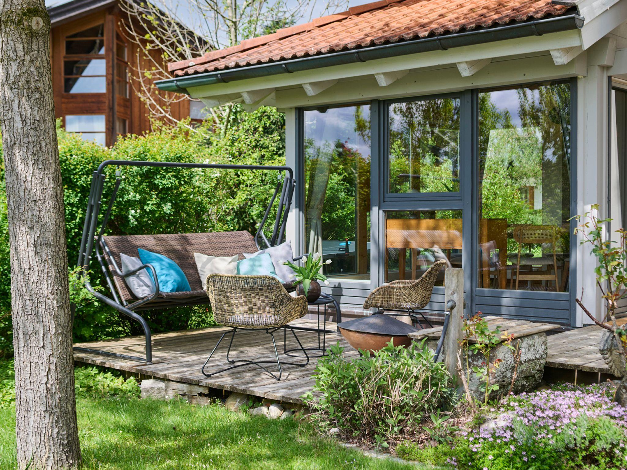 Im Garten gibt es einen grossen ausziehbaren Esstisch, eine Hollywoodschaukel, Liege und Loungesessel, Grillmöglichlkeit, Feuerkorb und eine Tischtennisplatte.