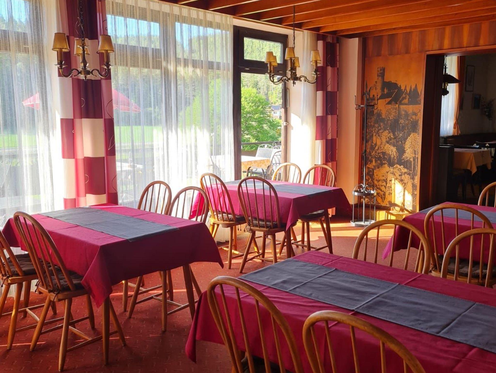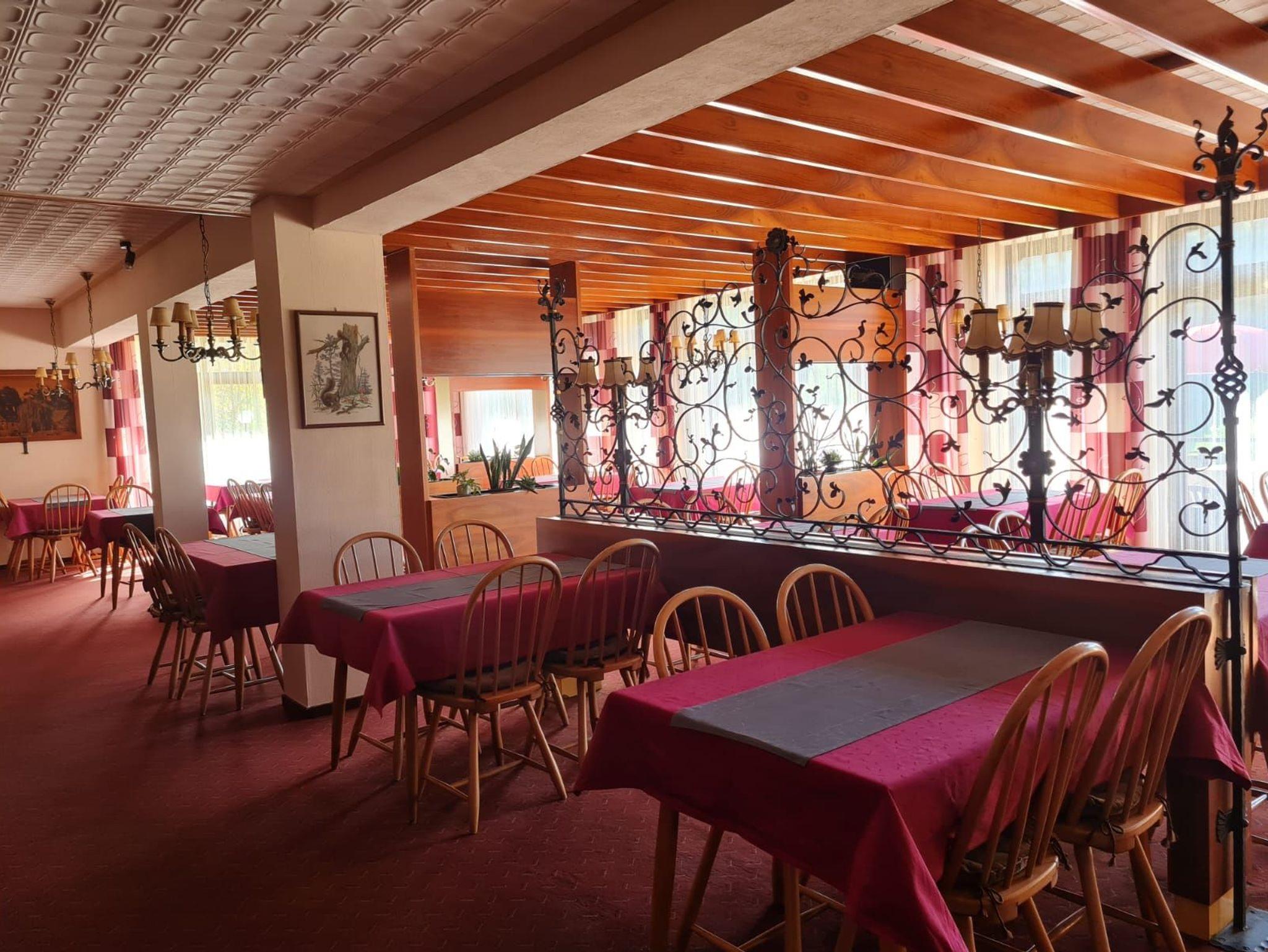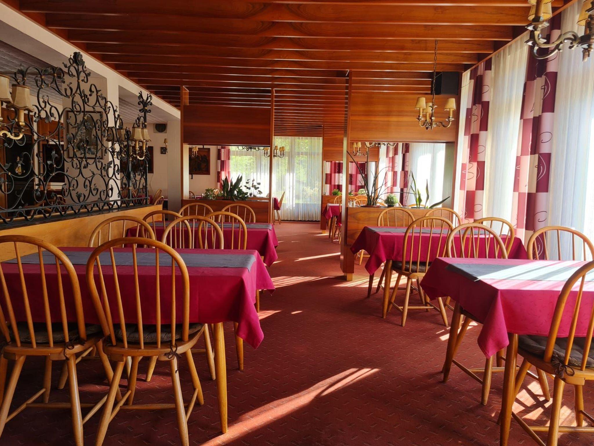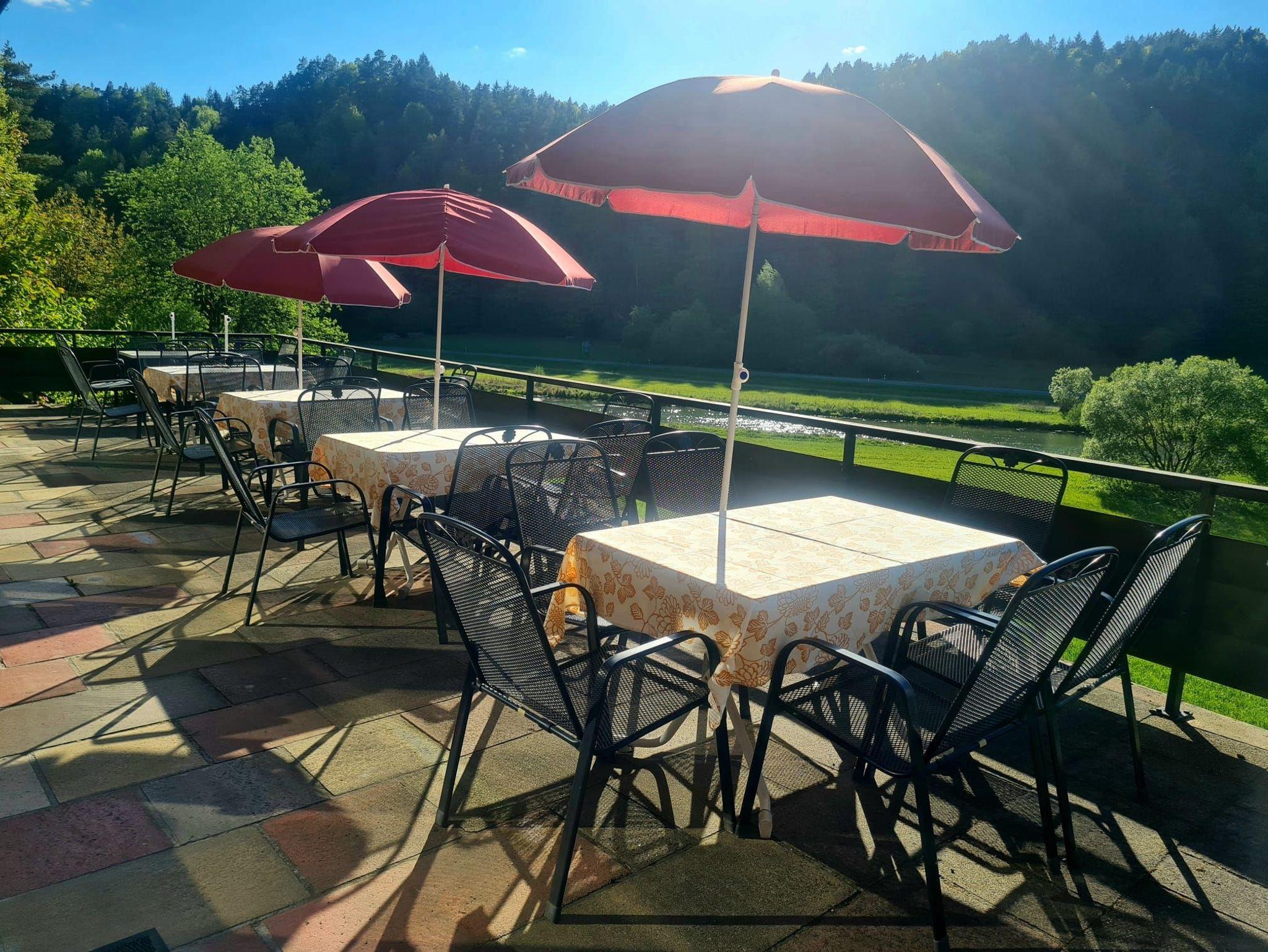 Im Parterre befindet sich das Restaurant. Hier können Sie zu jeder Tageszeit eine entsprechende Mahlzeit einnehmen. Morgens bedienen Sie sich selbst am reichhaltigen Frühstücksbuffet, nachmittags können Sie auf unserer Sonnenterrasse frische Torten und Kuchen aus eigener Herstellung genießen und abends wählen Sie aus der Karte, die Speisen aus der guten fränkischen Küche, sowie fangfrische Forellen und Wildgerichte umfasst. In unserem Kaminzimmer finden Sie immer ein beschauliches Plätzchen in wohliger Atmosphäre.