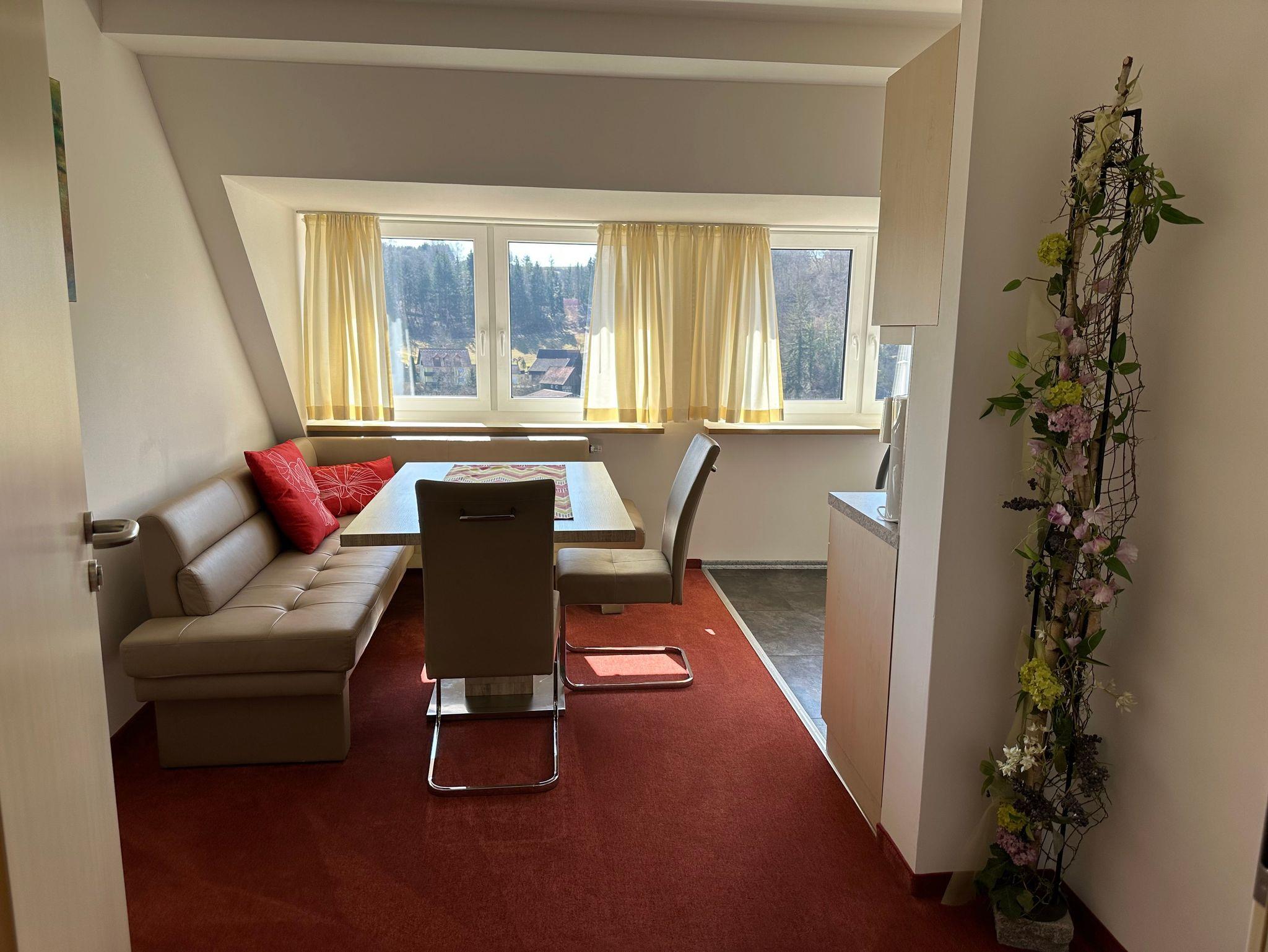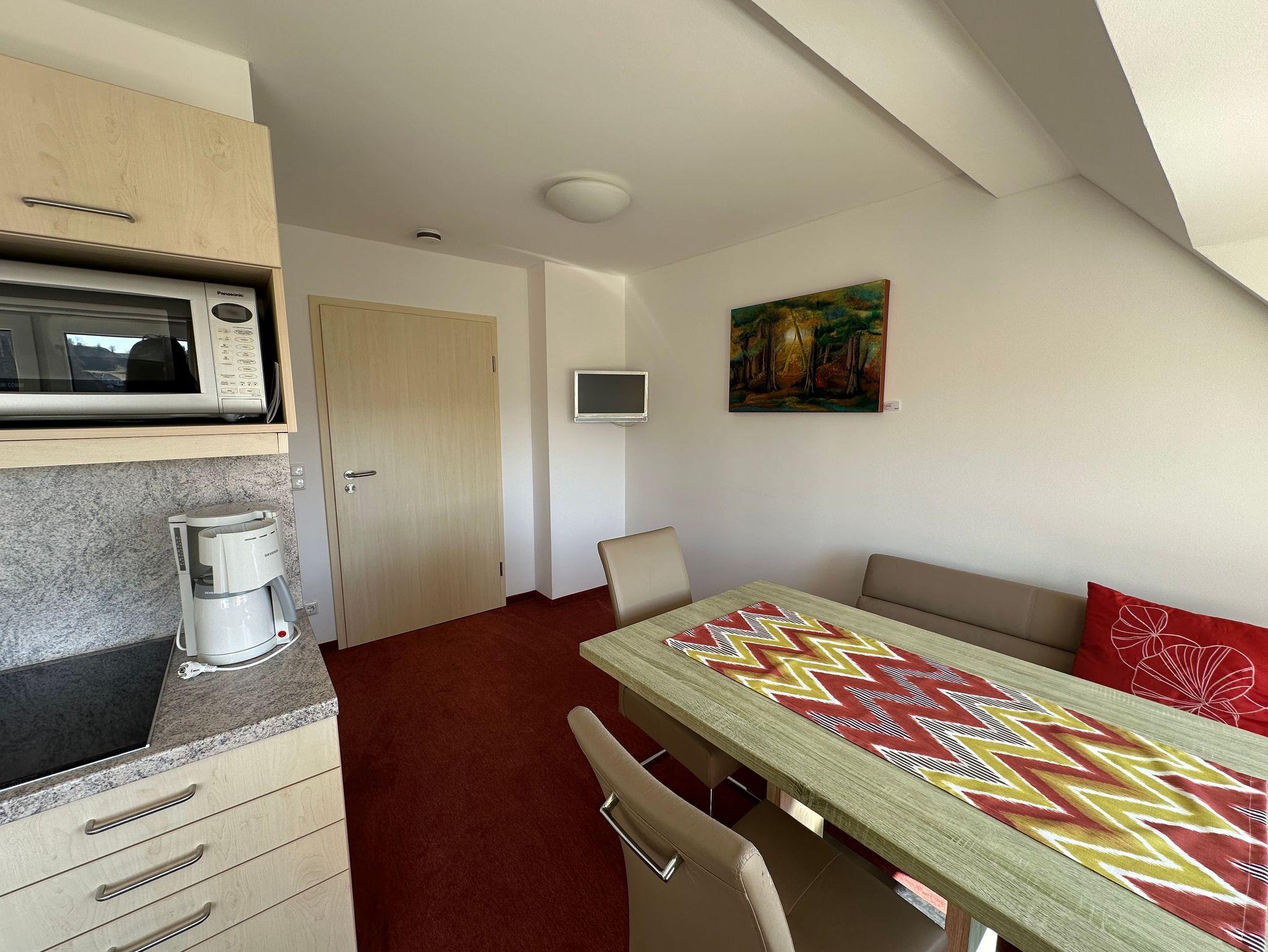 Eine gemütliche Sitzecke mit Esstisch und Flachbildfernseher lädt zum Verweilen ein. Hier finden Sie Raum für Erholung vom Alltag, individuelle „Workation“-Tage oder entspannte Seminaraufenthalte; immer begleitet von der ruhigen Naturkulisse rund um das GER-Haus.