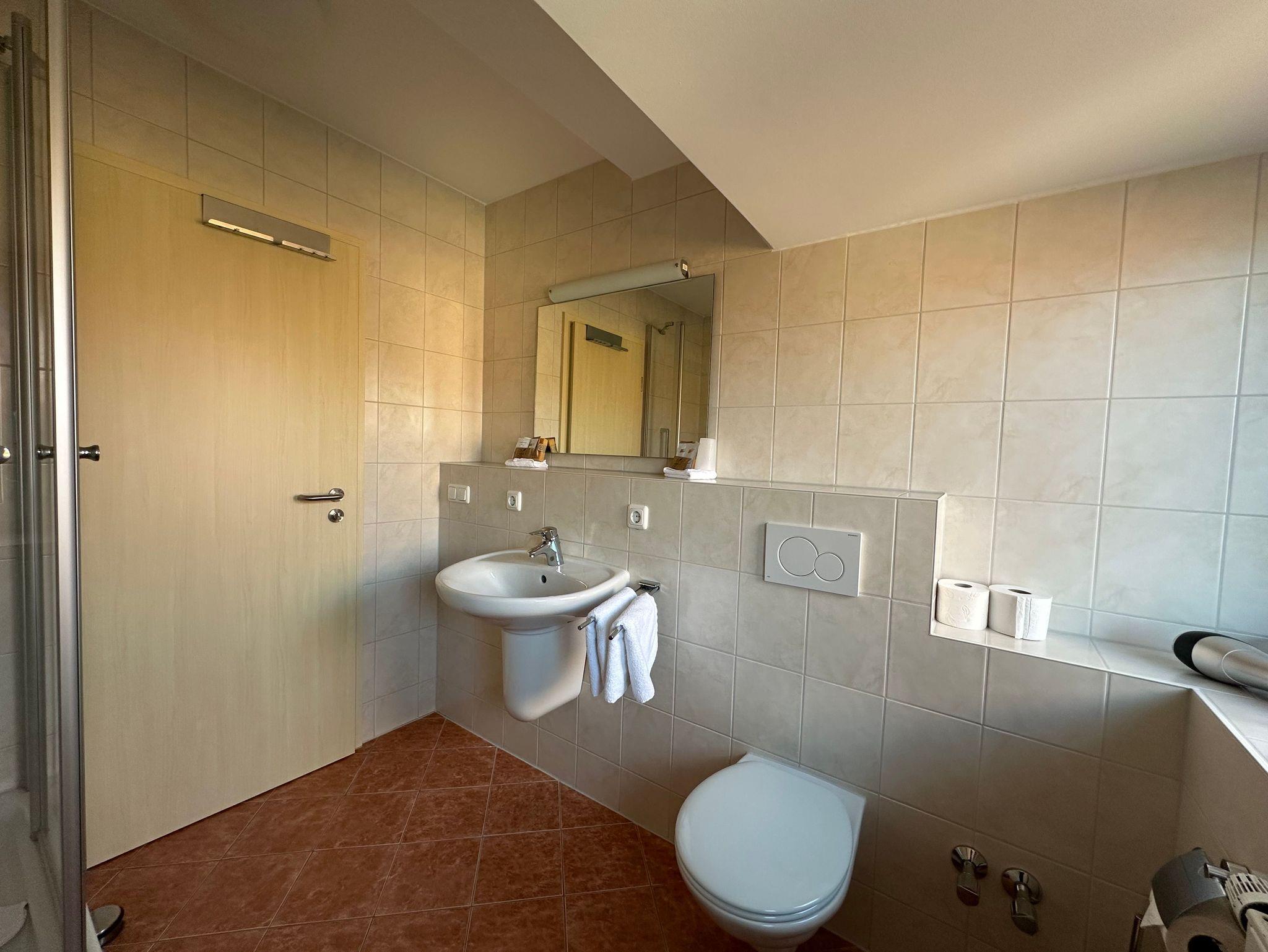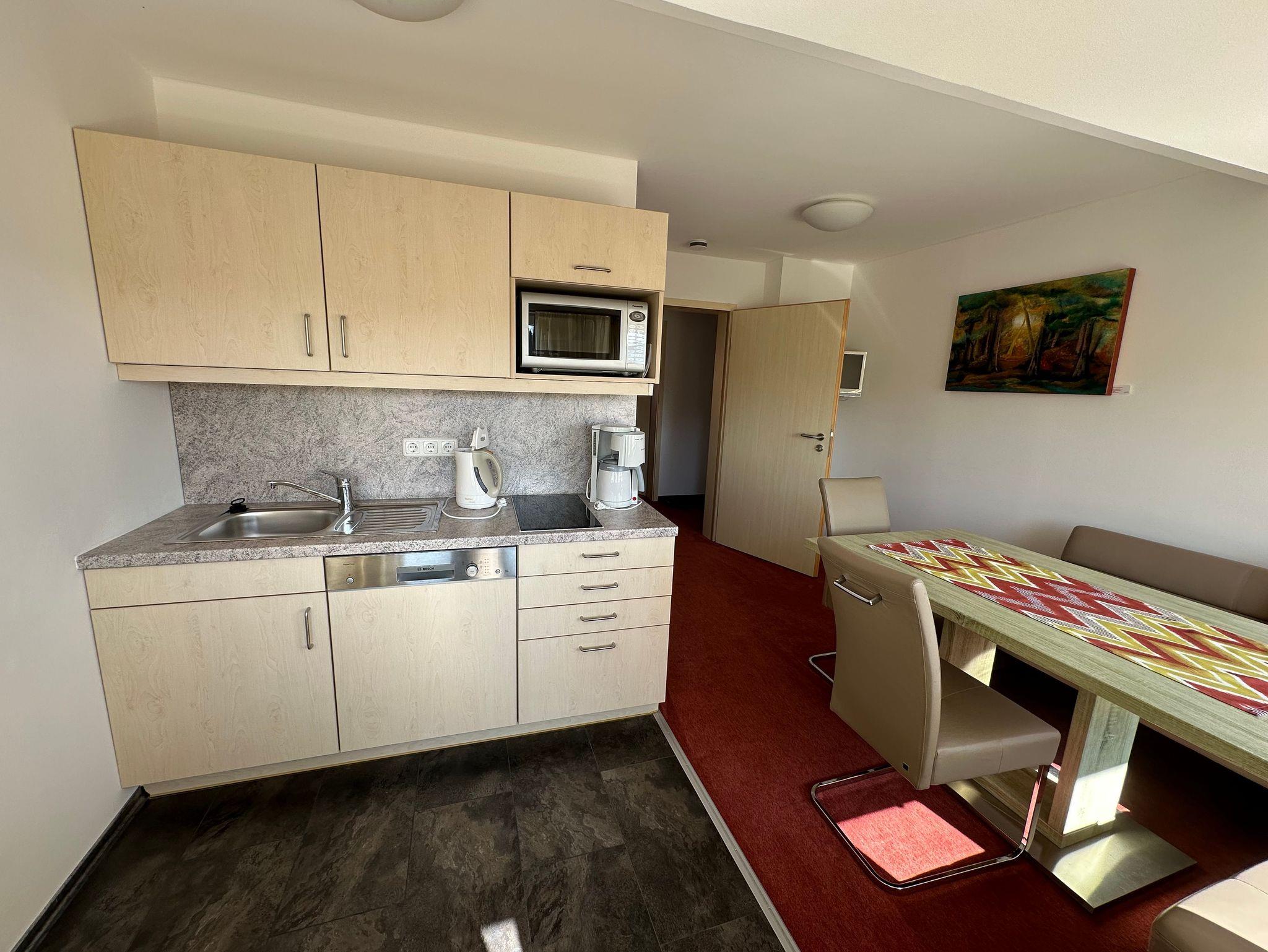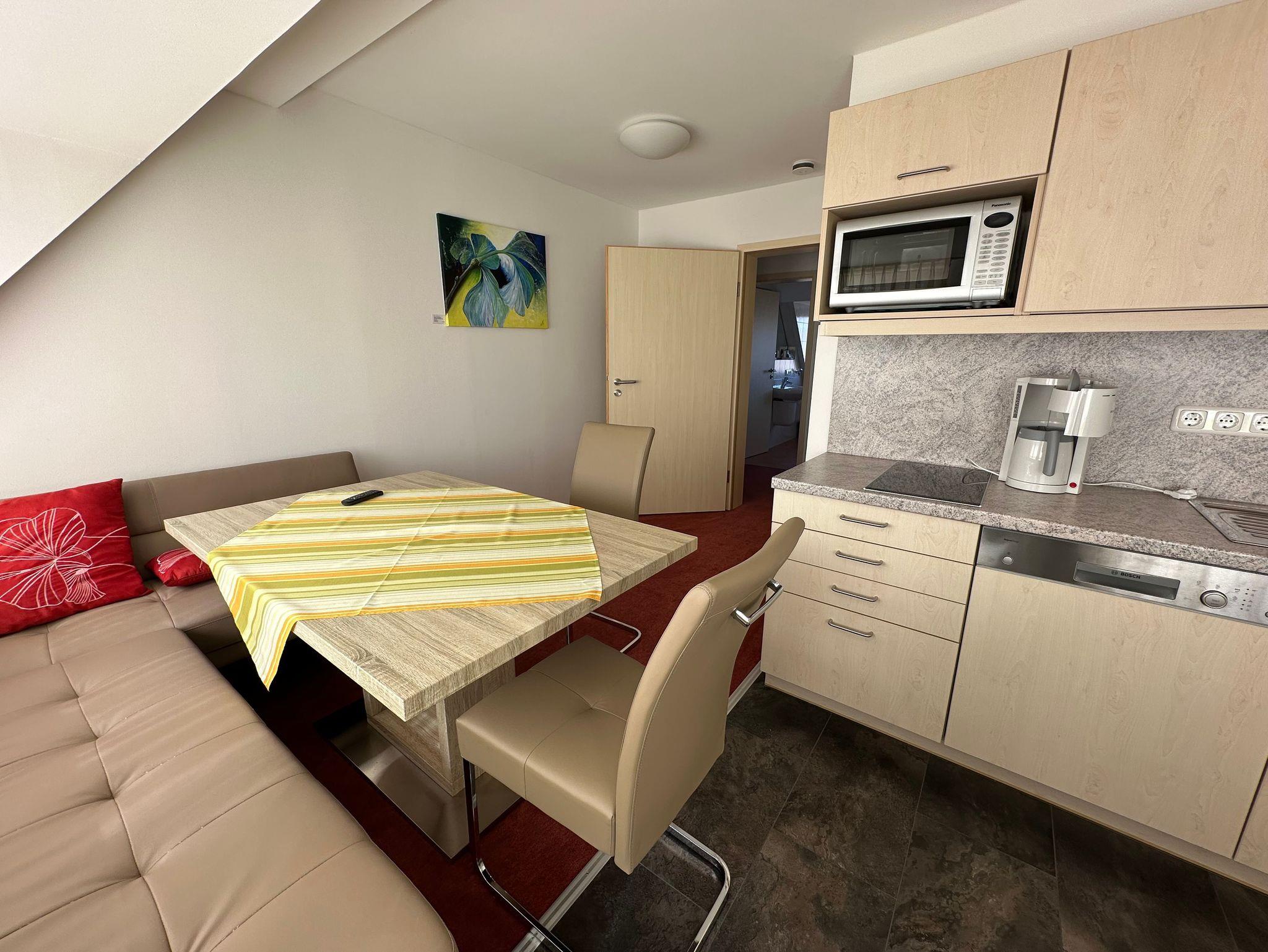 Das großzügige Badezimmer überzeugt mit Dusche, WC, zwei Tageslichtfenstern und einer freundlichen, klaren Atmosphäre. Herzstück der Ferienwohnungen ist die helle Wohnküche mit Panoramablick auf Waischenfeld. Sie ist ausgestattet mit Küchenzeile, Spülmaschine, Cerankochfeld, Mikrowelle, Kaffeemaschine, Wasserkocher, Toaster, Kühlschrank mit Gefrierfach sowie ausreichend Geschirr; perfekt für Selbstversorger.