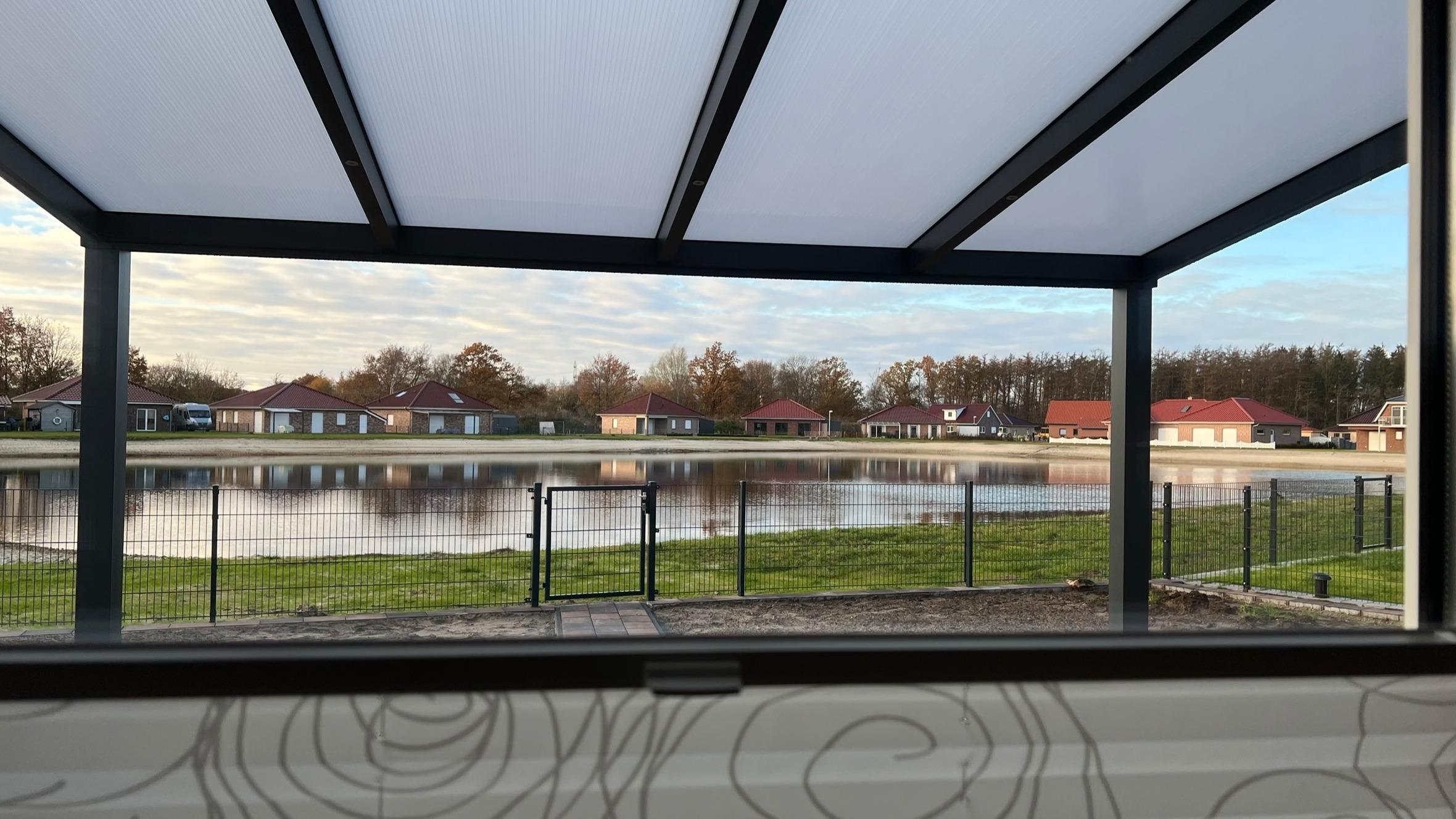Die Terrasse ist durch eine Überdachung mit einer Größe von 15 qm gegen Regen und Wind geschützt.