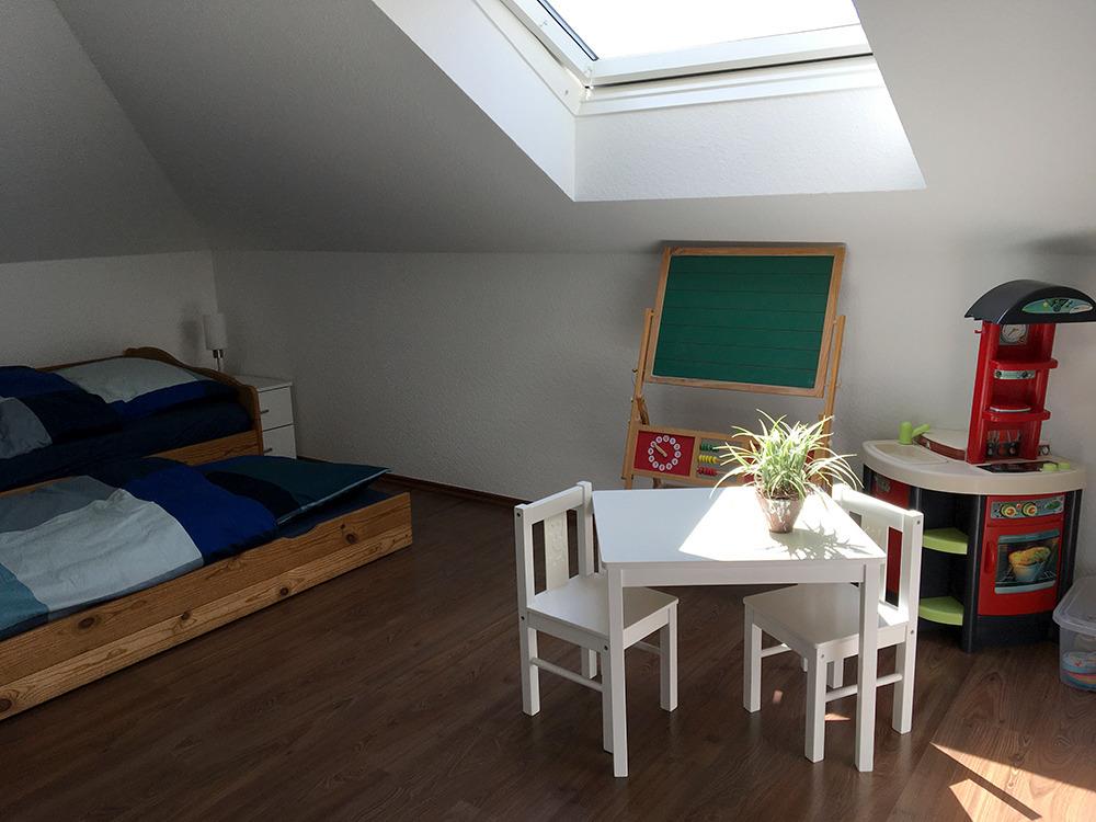Im geräumigen OG-Raum befindet sich ein Doppelbett. Ferner auch ein Einzelbett, welches zu einem Doppelbett ausgezogen werden kann (bevorzugt geeignet für Jugendliche). Hier auch ein Kinderspielebereich mit einem Spielzeug und einer Tafel.