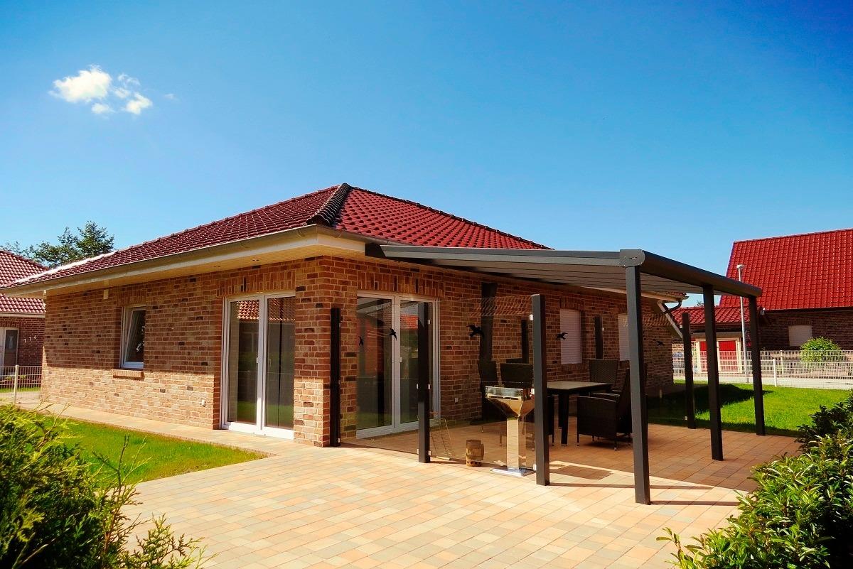 Die Terrasse ist durch eine Überdachung mit einer Größe von 15 qm gegen Regen und Wind geschützt.