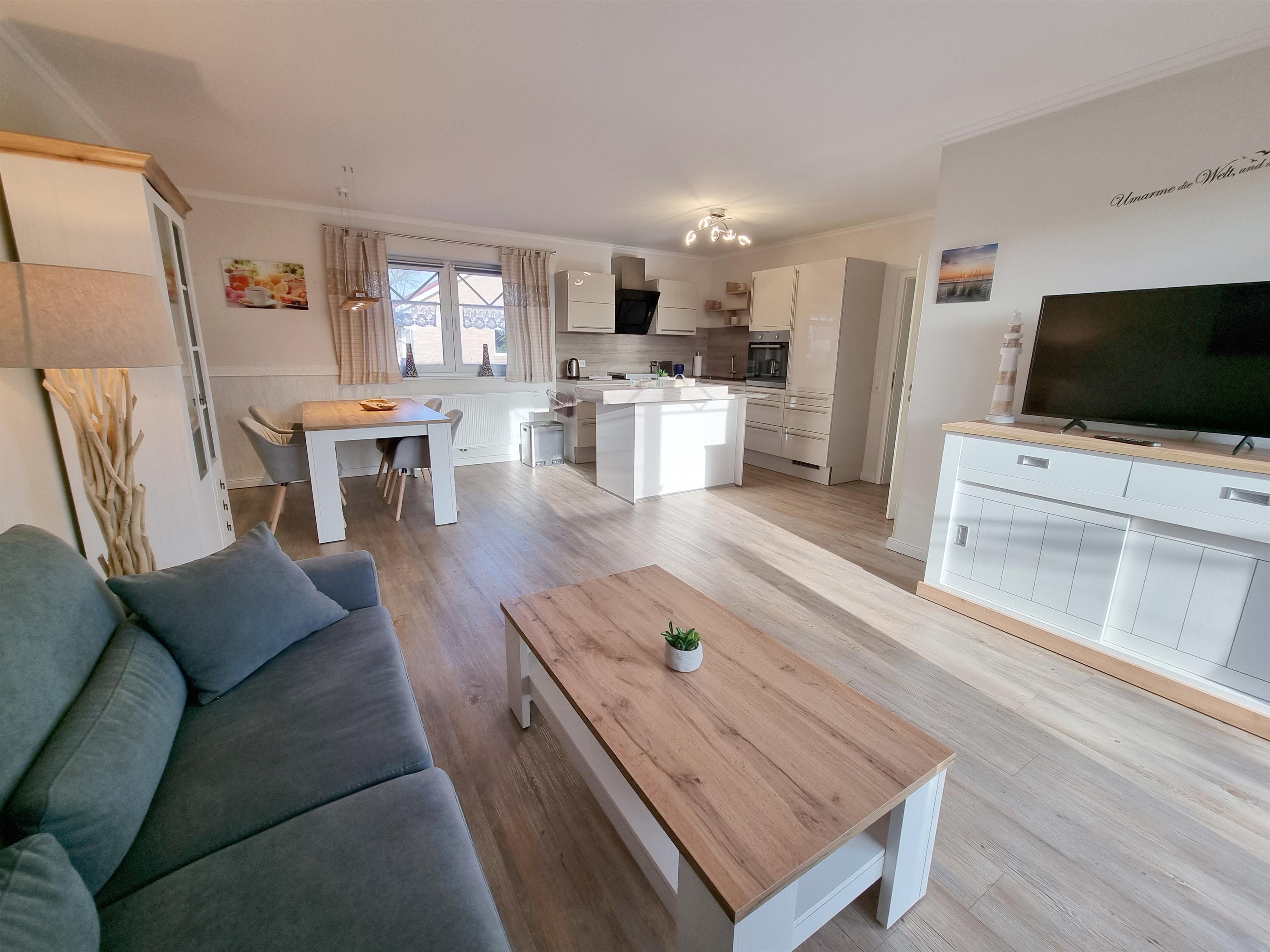 Das ebenerdige Ferienhaus verfügt über ein großes Wohnzimmer mit Essbereich und offener Küche. Vom Wohnzimmer aus schauen Sie in den Staudengarten mit Pavillon.