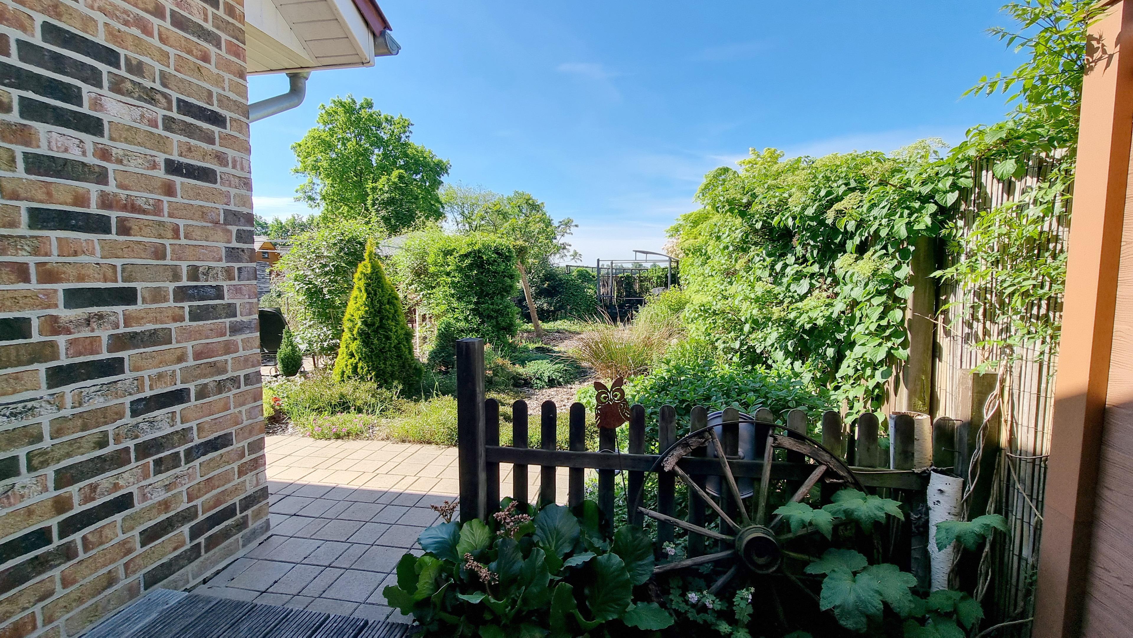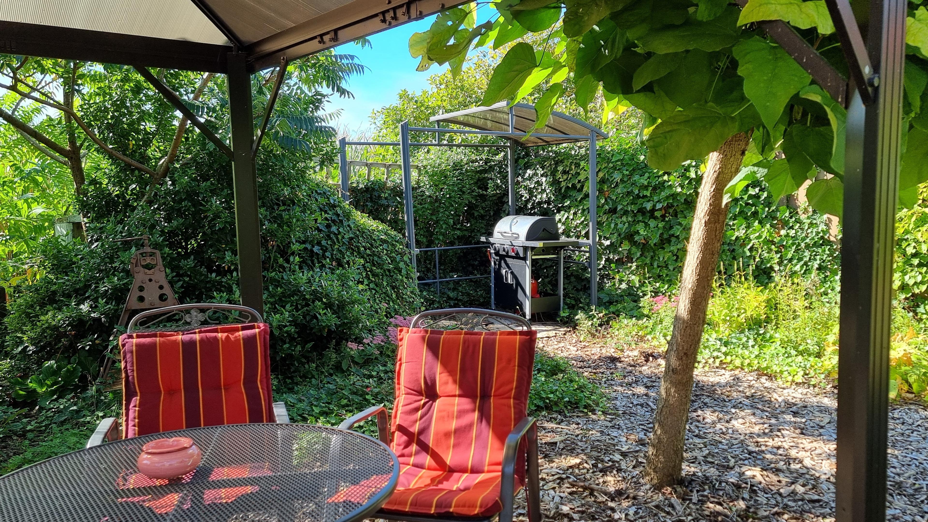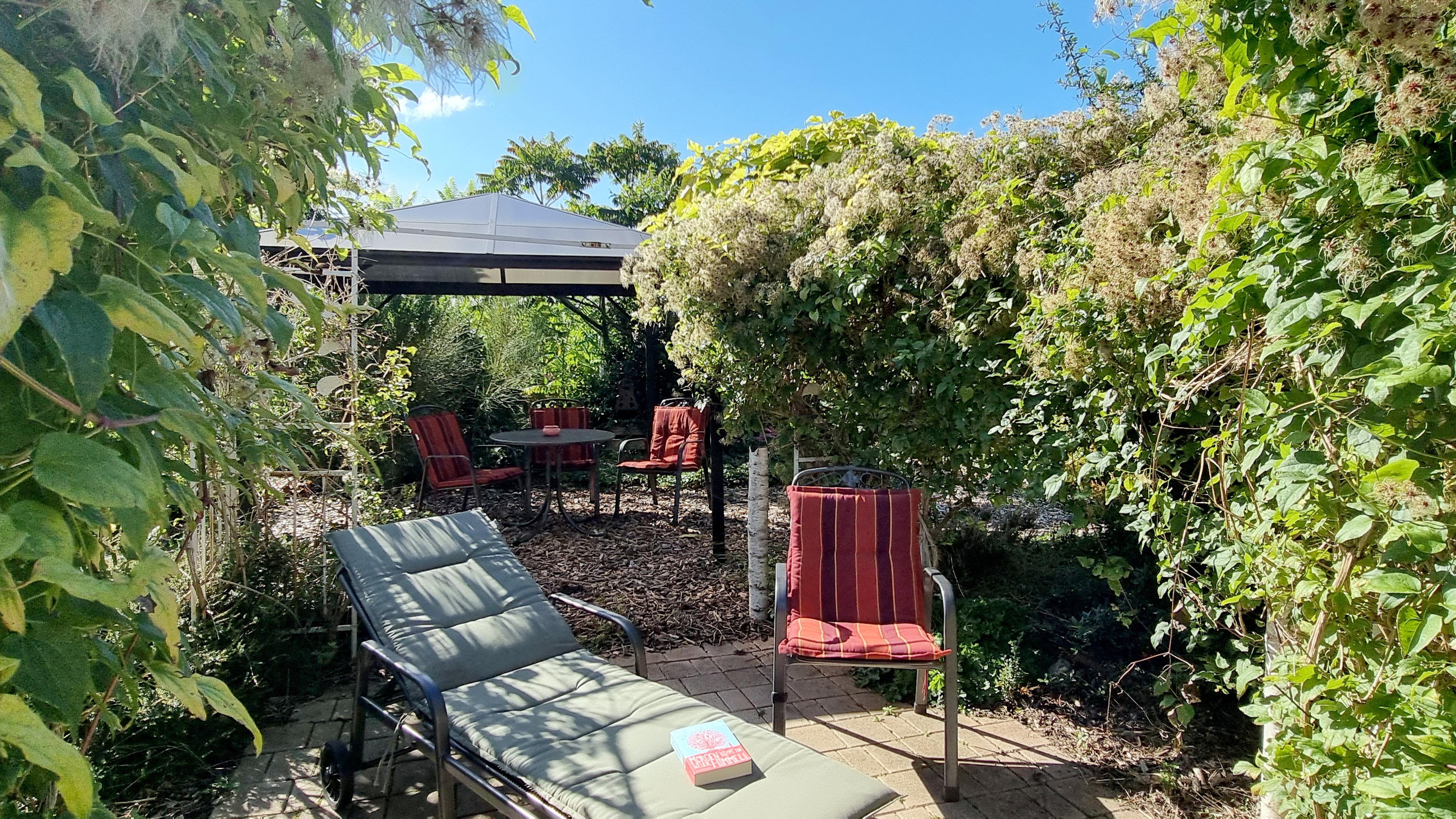 Im Garten erwartet Sie ein Pavillon und eine Panorama-Außensauna mit Blick in den idyllischen Staudengarten. Genießen Sie Ruhe und die schöne Gartenatmosphäre mit Blick über die Felder.