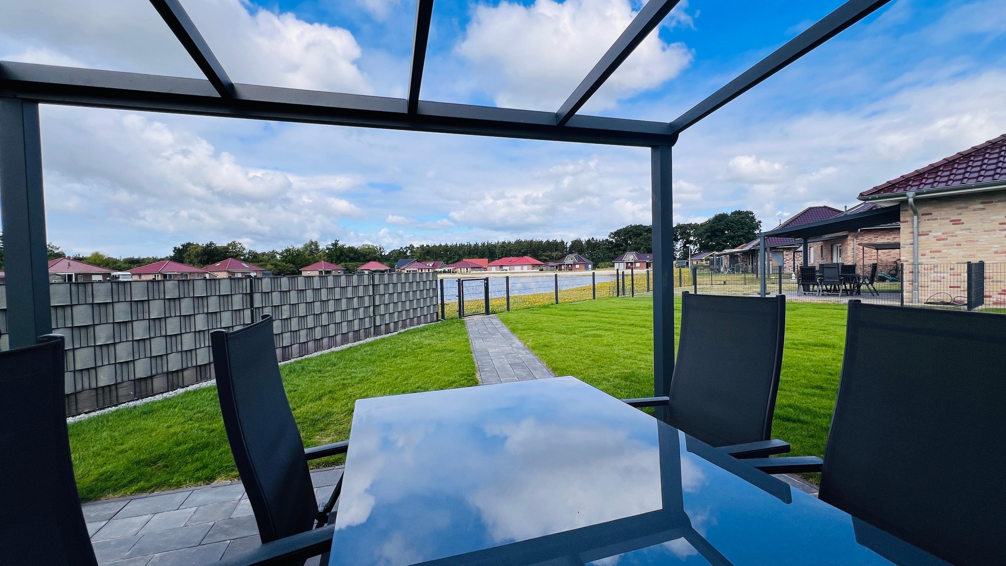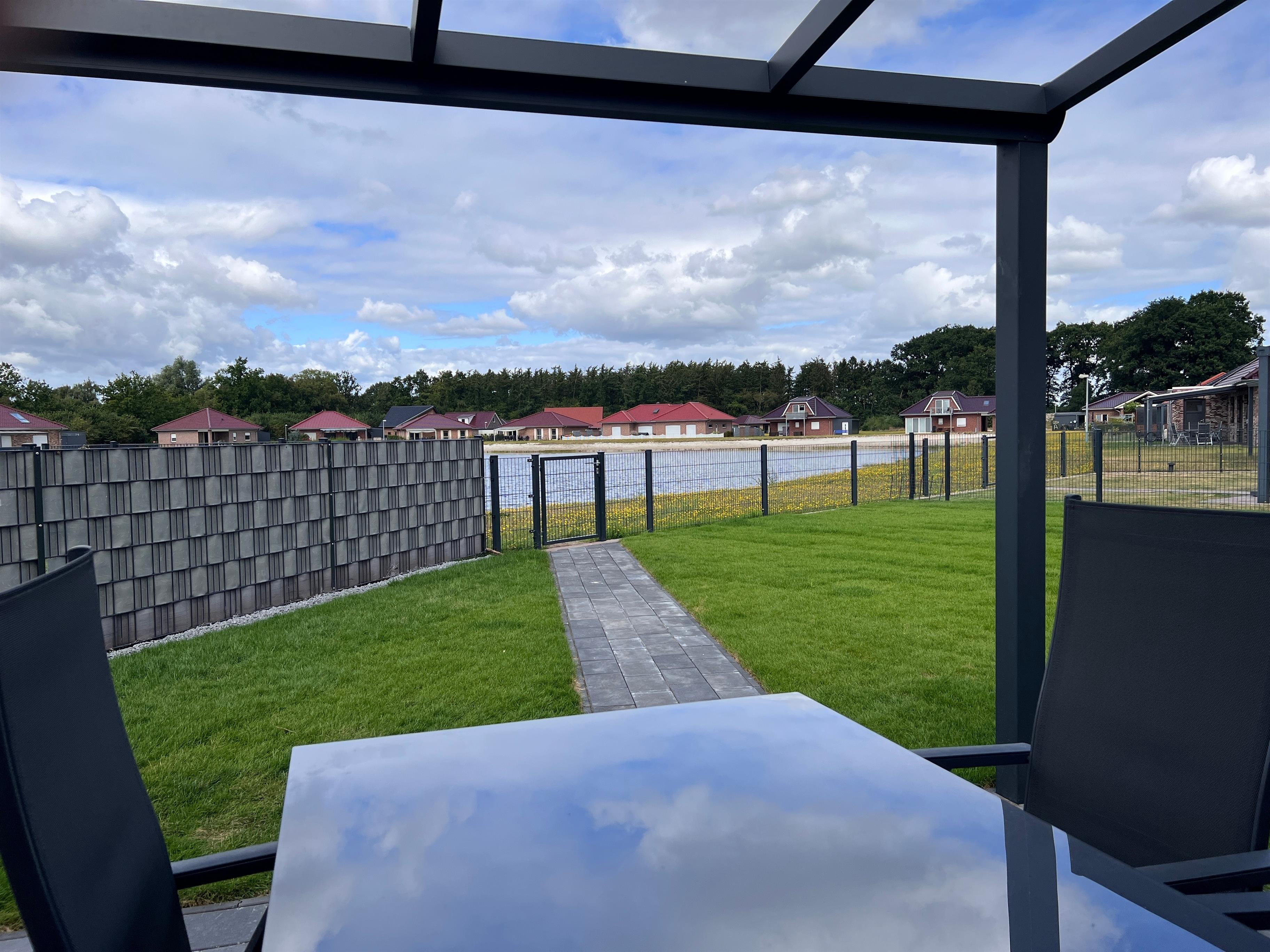 Die Terrasse ist durch eine Überdachung mit einer Größe von 15 qm gegen Regen und Wind geschützt.