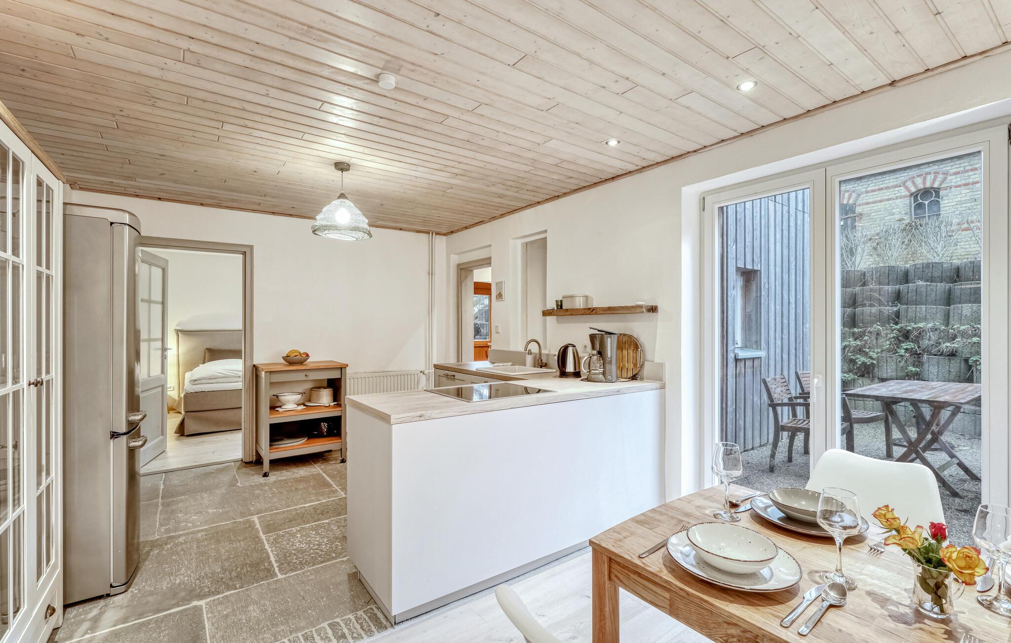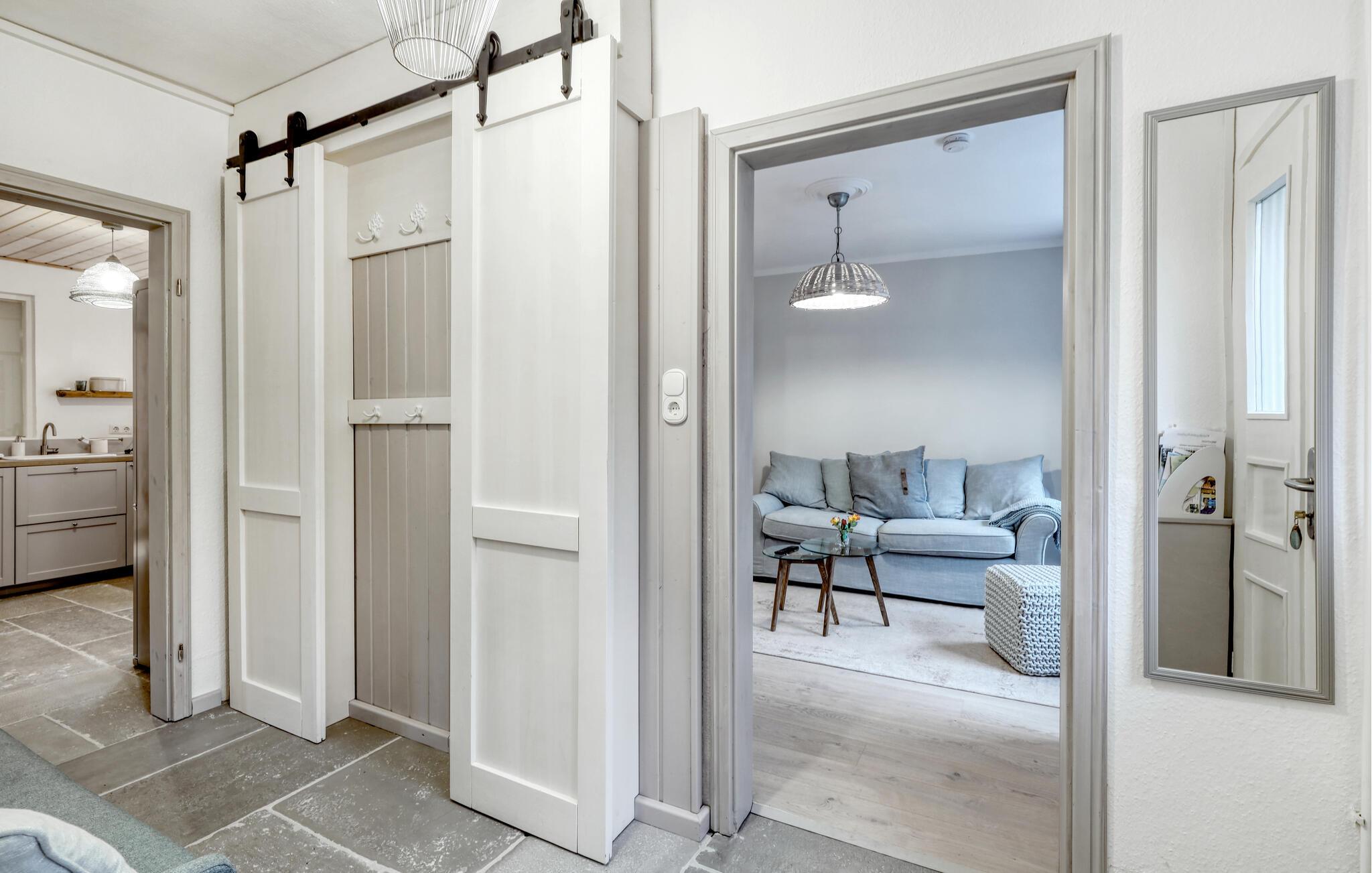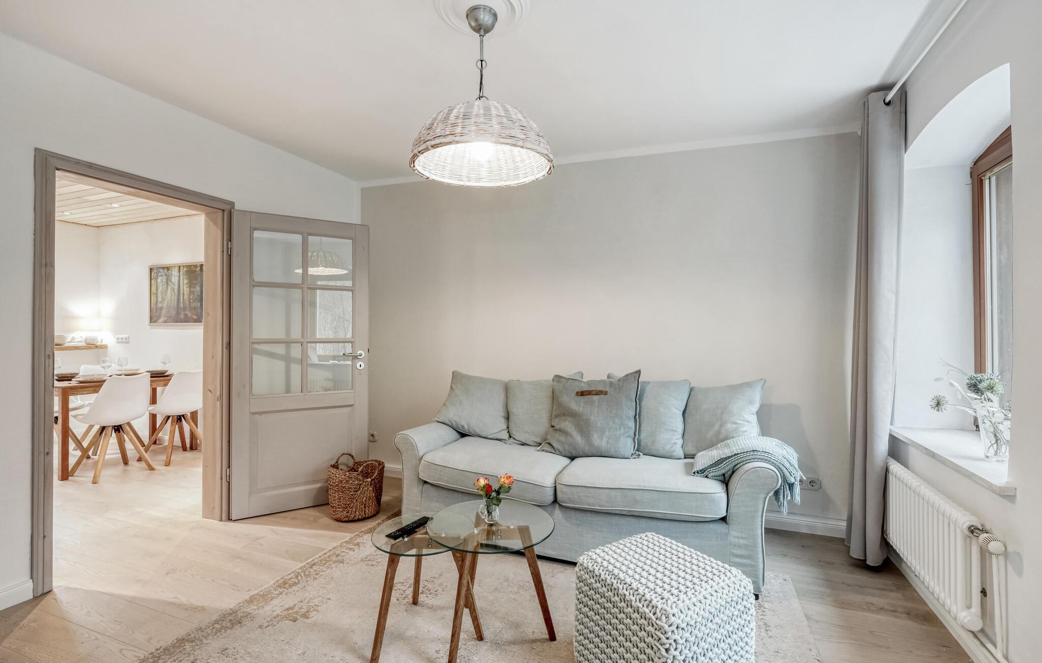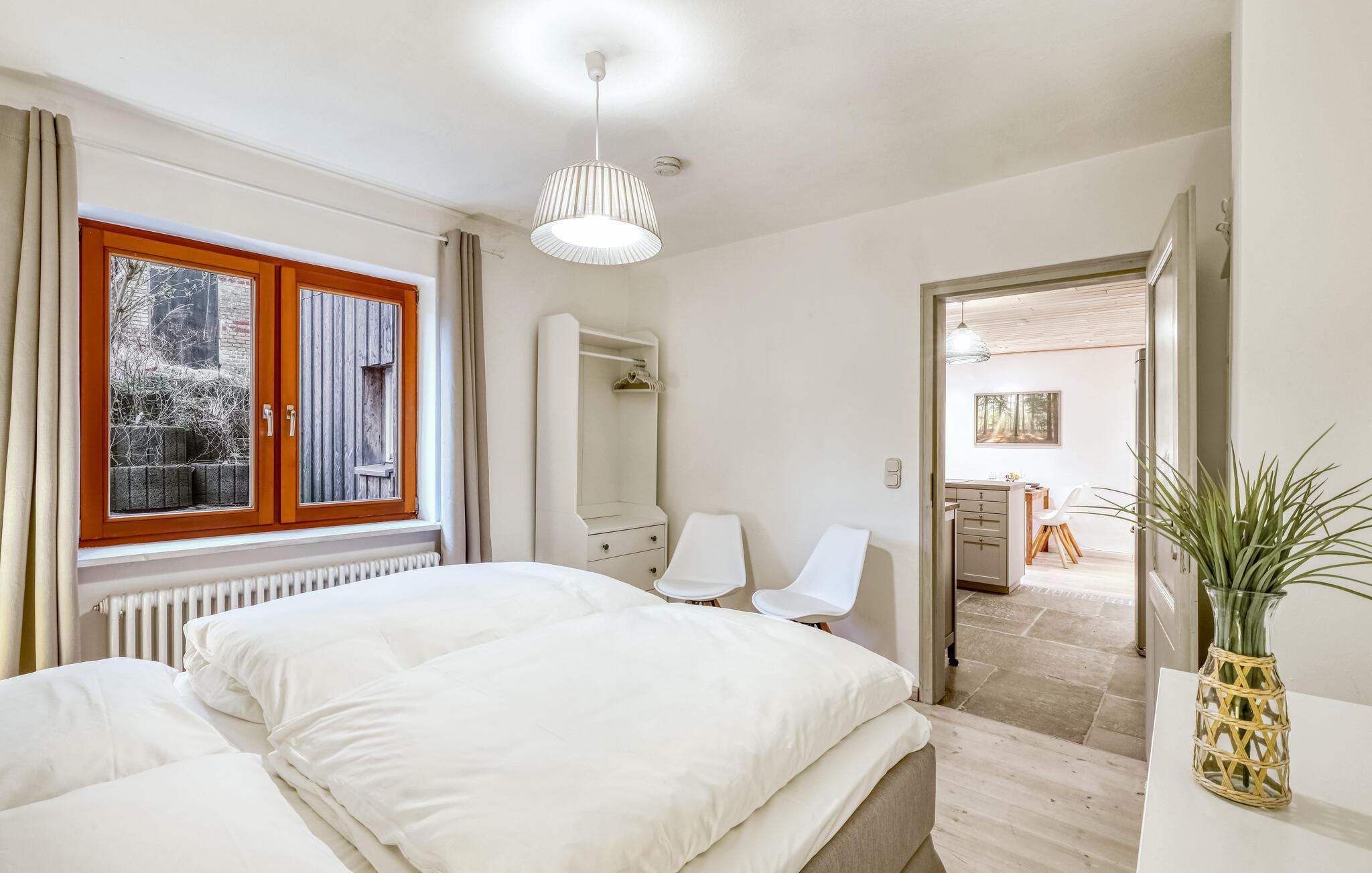 Tag en velfortjent pause og rejs som par eller med den lille familie til udkanten af Glücksburg, hvor I finder denne charmerende lejlighed i skønne, rolige omgivelser. Boligen er nydeligt indrettet med lyse træpaneler, gode møbler og et veludstyret køkken, hvor I kan tilberede jeres livretter efter en aktiv feriedag. Senere kan I rykke over i sofaen eller lænestolen med snacks og hver jeres bog, mens I lægger planer for de kommende dage.