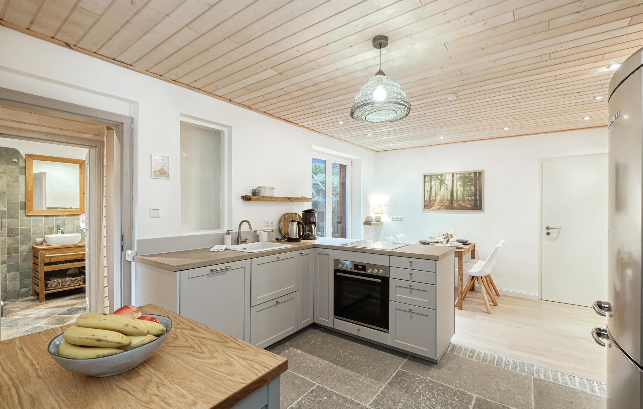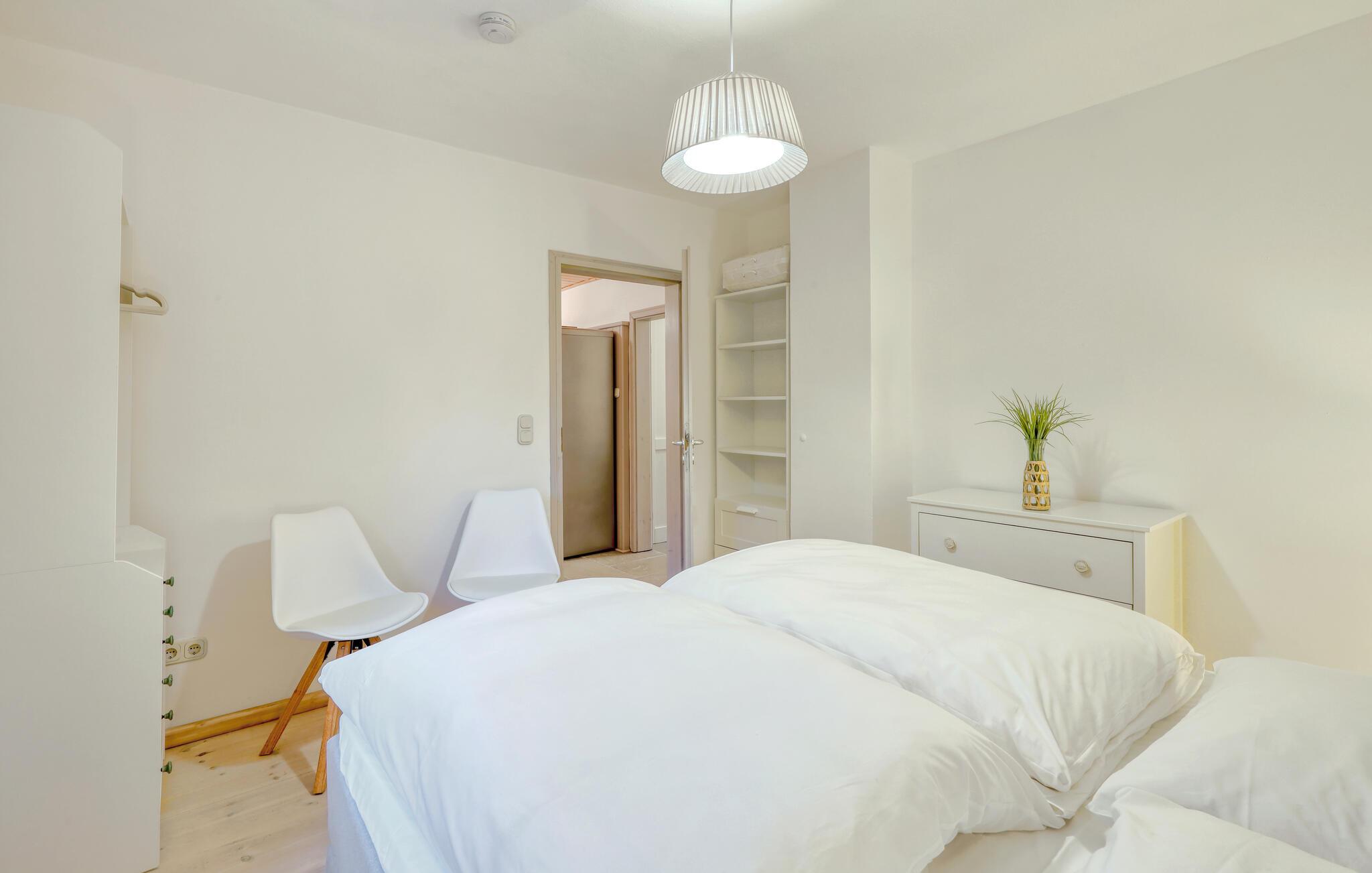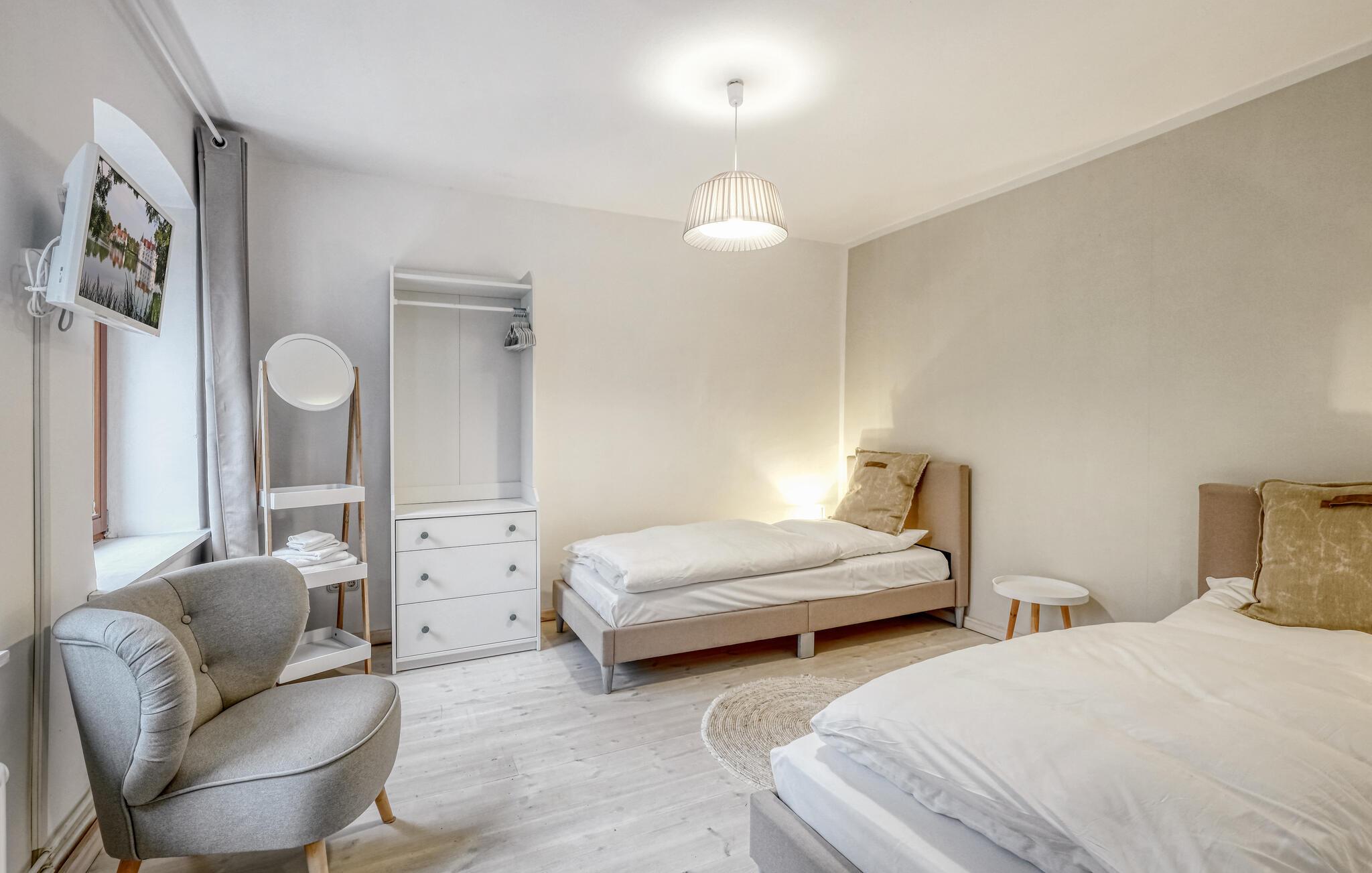 Tag en velfortjent pause og rejs som par eller med den lille familie til udkanten af Glücksburg, hvor I finder denne charmerende lejlighed i skønne, rolige omgivelser. Boligen er nydeligt indrettet med lyse træpaneler, gode møbler og et veludstyret køkken, hvor I kan tilberede jeres livretter efter en aktiv feriedag. Senere kan I rykke over i sofaen eller lænestolen med snacks og hver jeres bog, mens I lægger planer for de kommende dage.