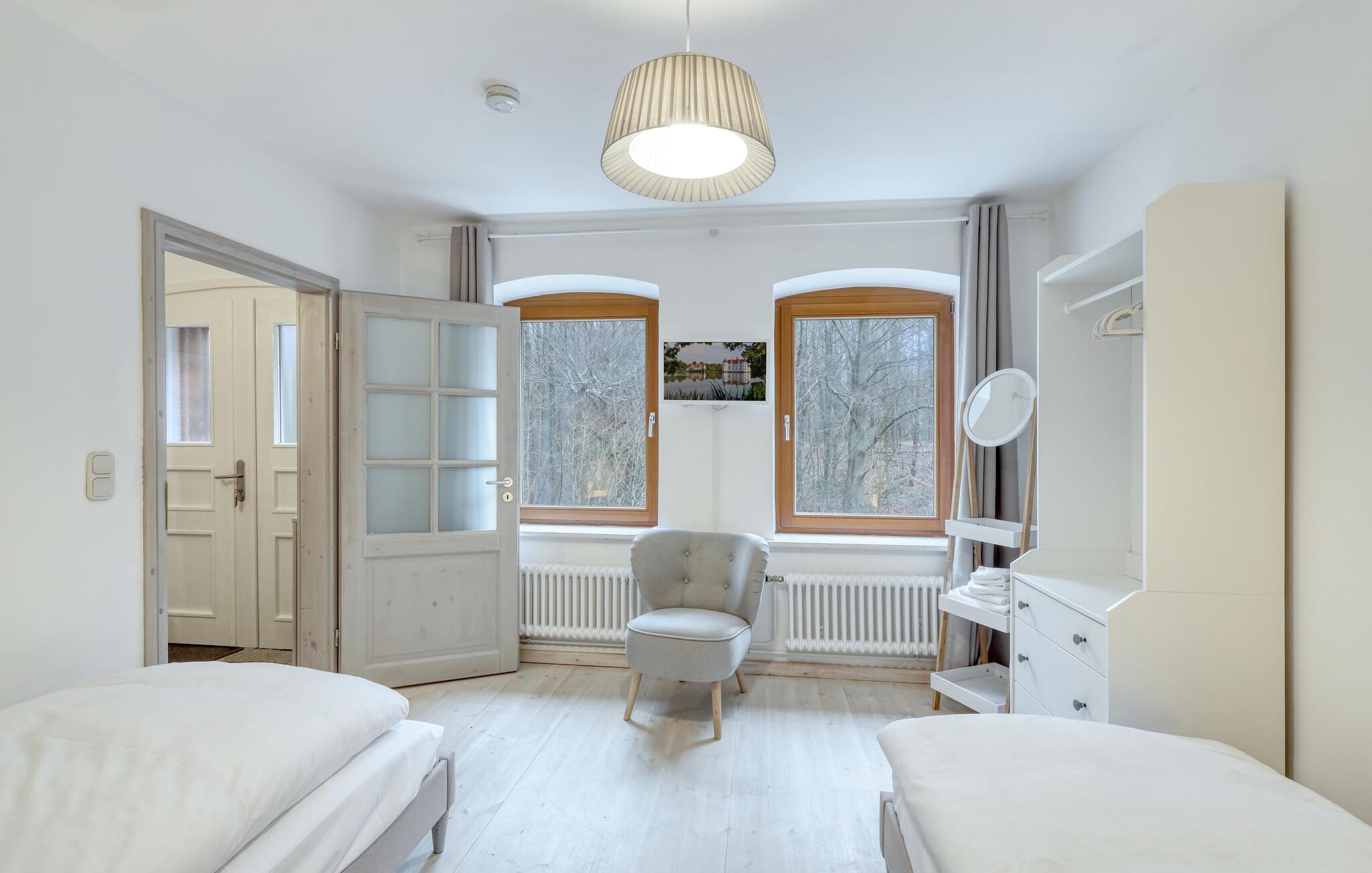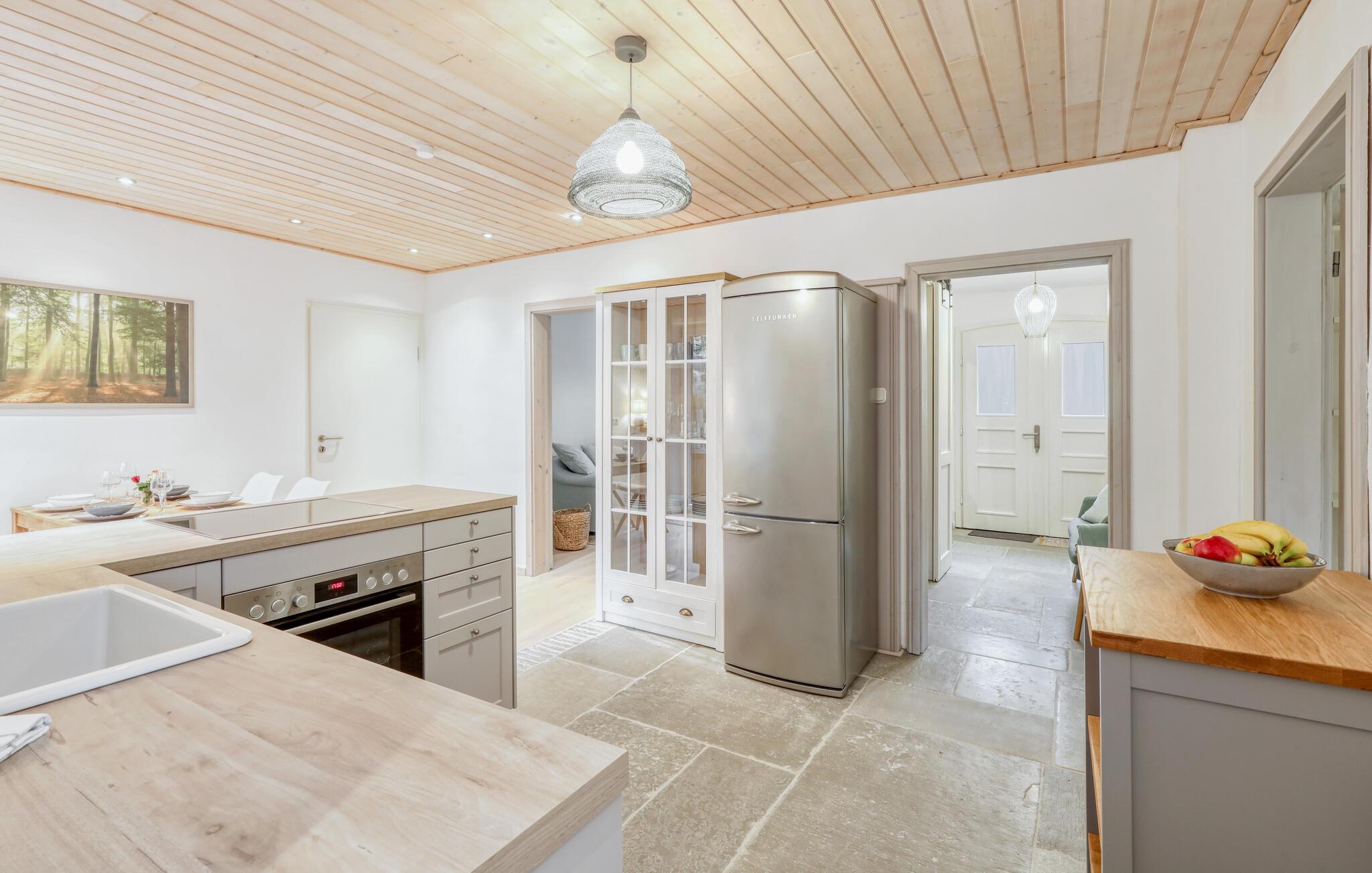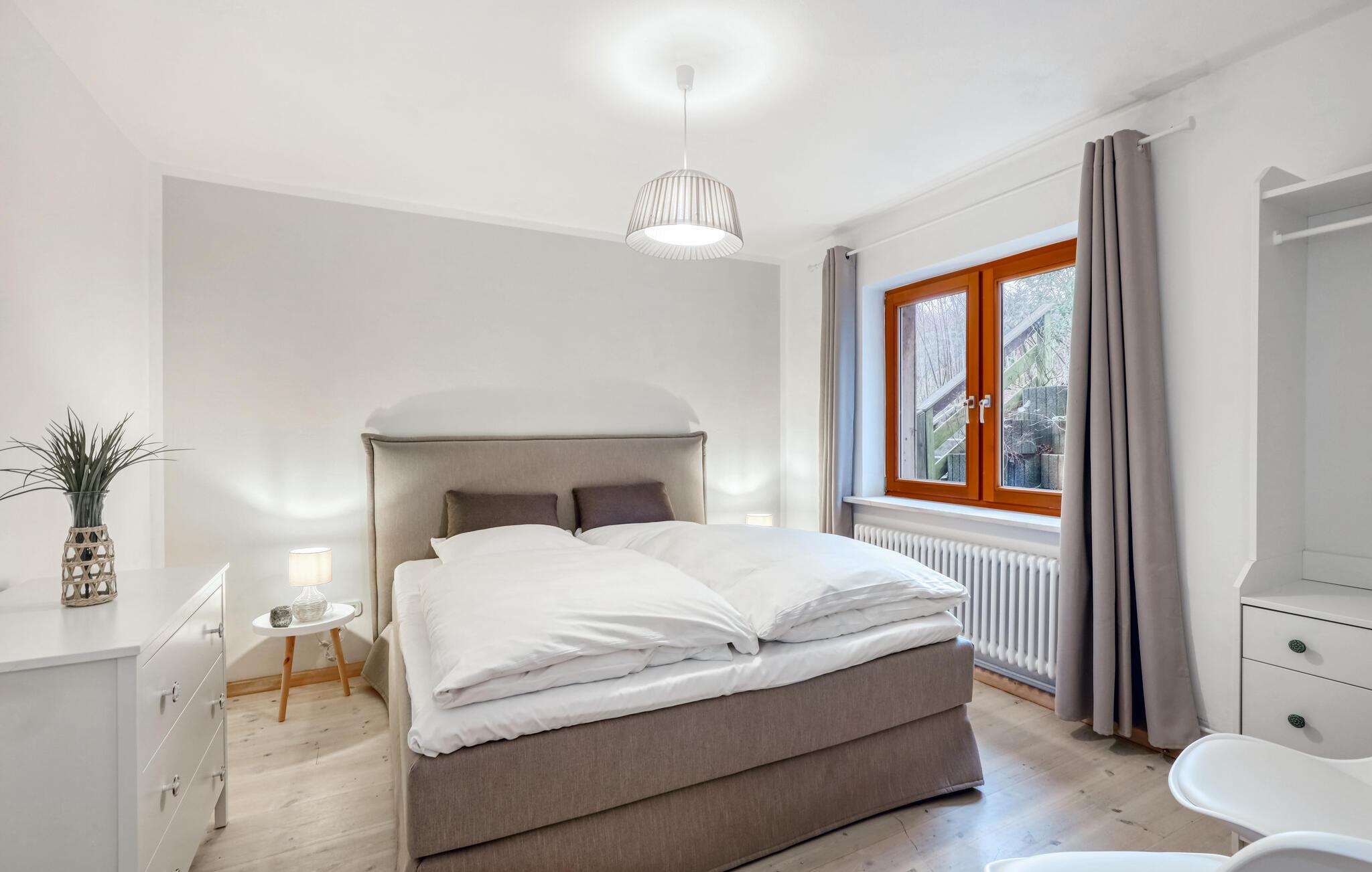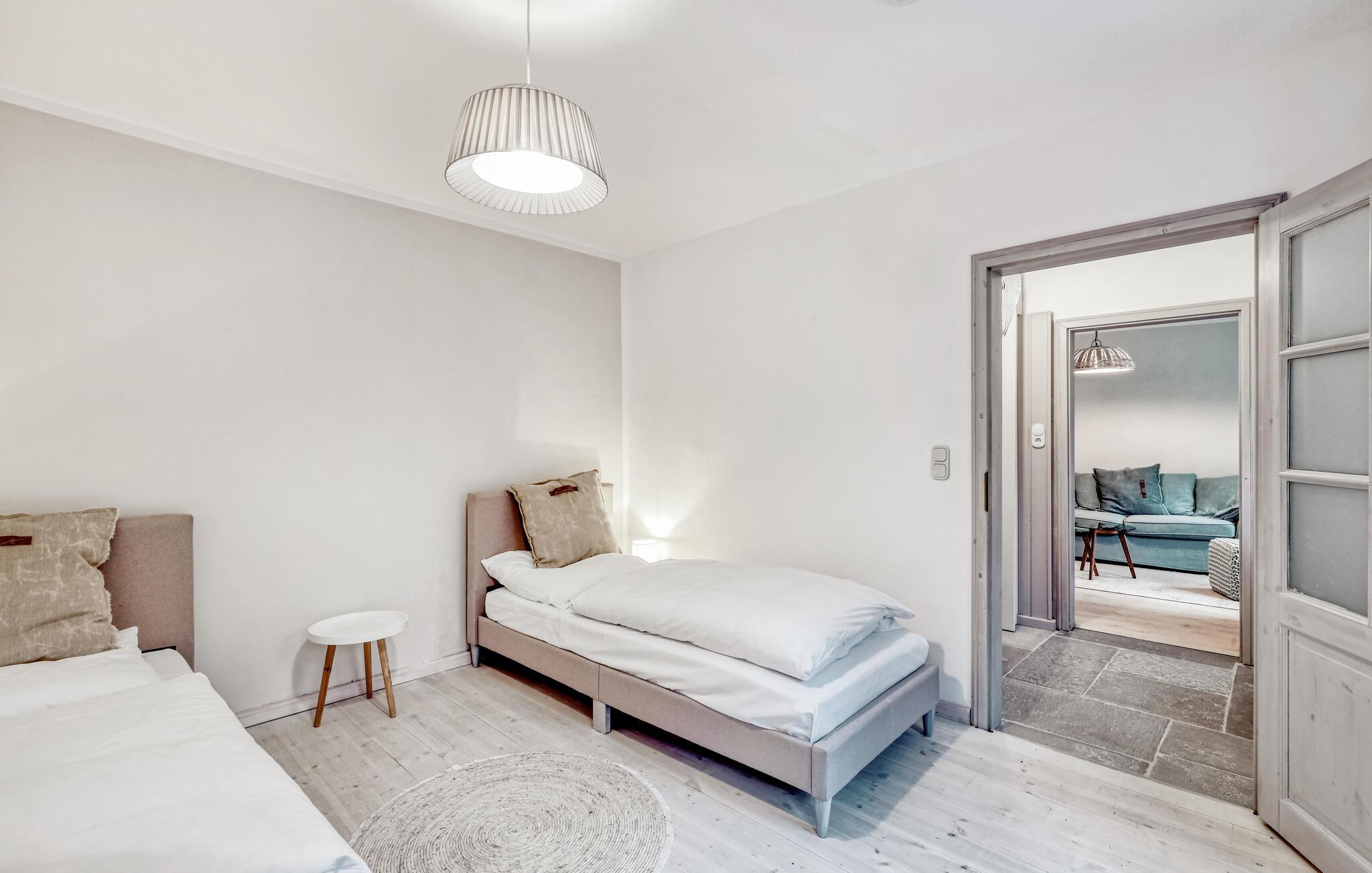Tag en velfortjent pause og rejs som par eller med den lille familie til udkanten af Glücksburg, hvor I finder denne charmerende lejlighed i skønne, rolige omgivelser. Boligen er nydeligt indrettet med lyse træpaneler, gode møbler og et veludstyret køkken, hvor I kan tilberede jeres livretter efter en aktiv feriedag. Senere kan I rykke over i sofaen eller lænestolen med snacks og hver jeres bog, mens I lægger planer for de kommende dage.