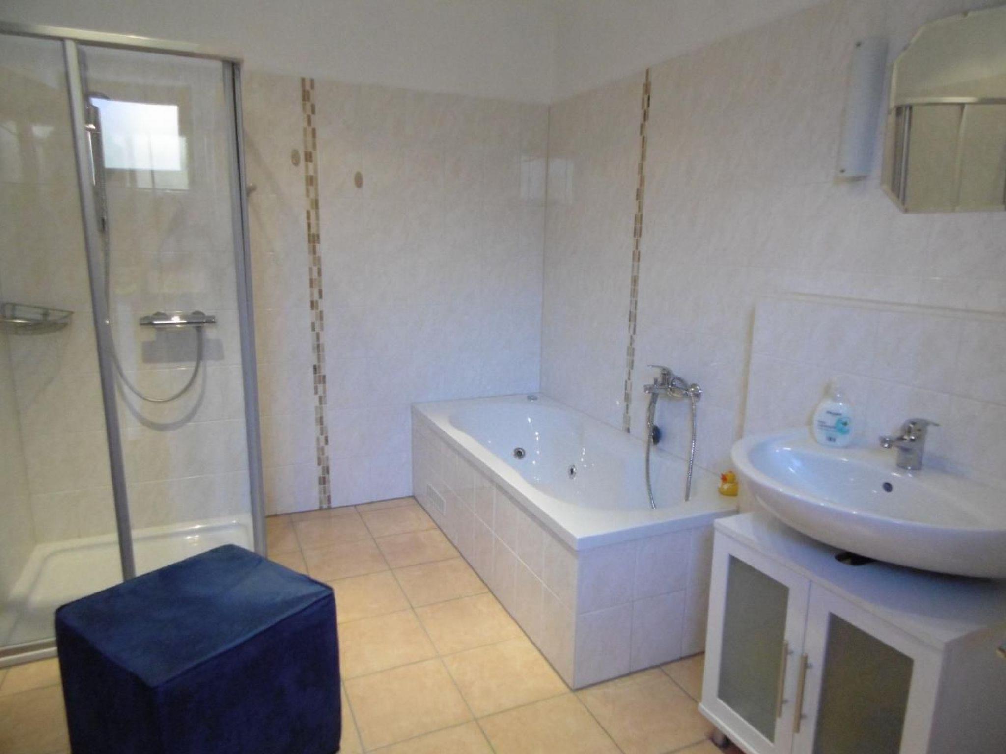 Bathroom facilities: shower and whirlpool bath, cupboard with toilet paper, hairdryer and first aid kit.