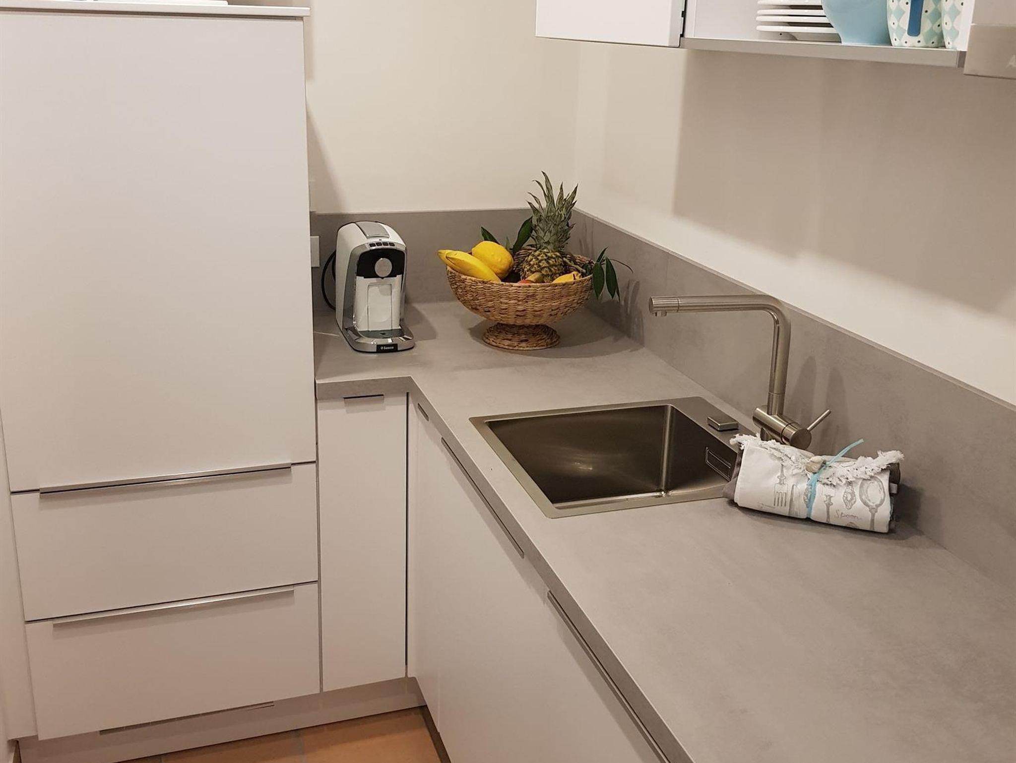 * eine moderne Küche mit Kühlschrank, Gefrierfach, Spülmaschine, Ceran-Kochfeld (4), Backofen, Abzugshaube, Kaffeevollautomaten, Filterkaffeemaschine, Eier-, Wasserkocher, Milchschäumer, Orangenpresse, Sandwich-, Toaster, Geschirr, Besteck, Töpfe, Pfanne, etc.