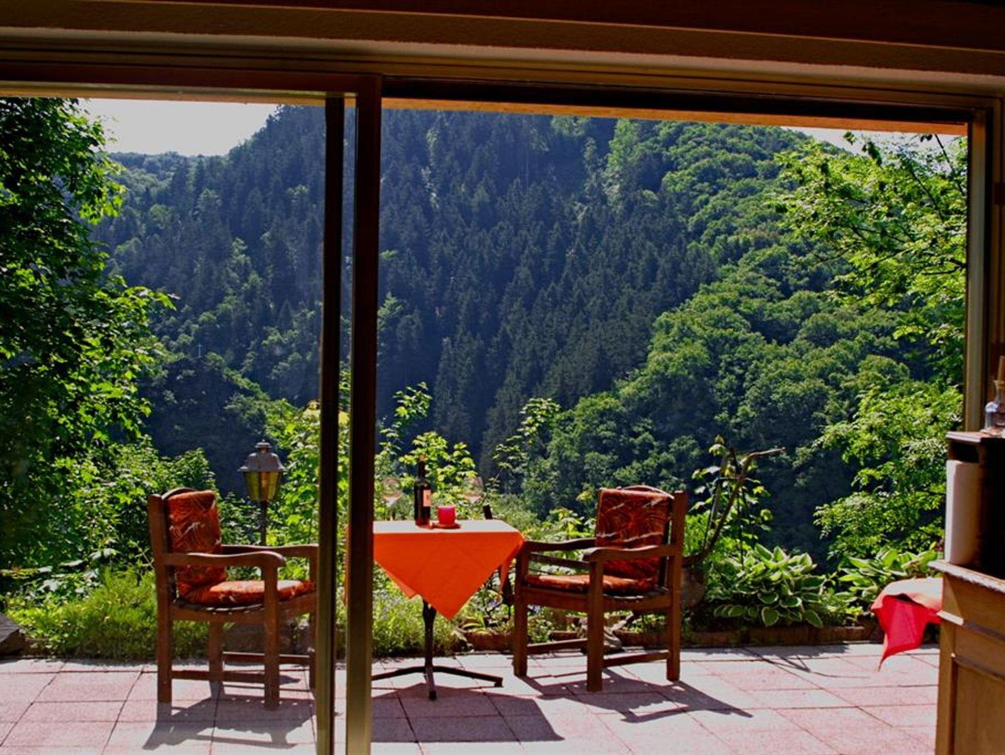 Große Panoramafenster bieten einen herrlichen Ausblick auf das romantische Wiedtal.