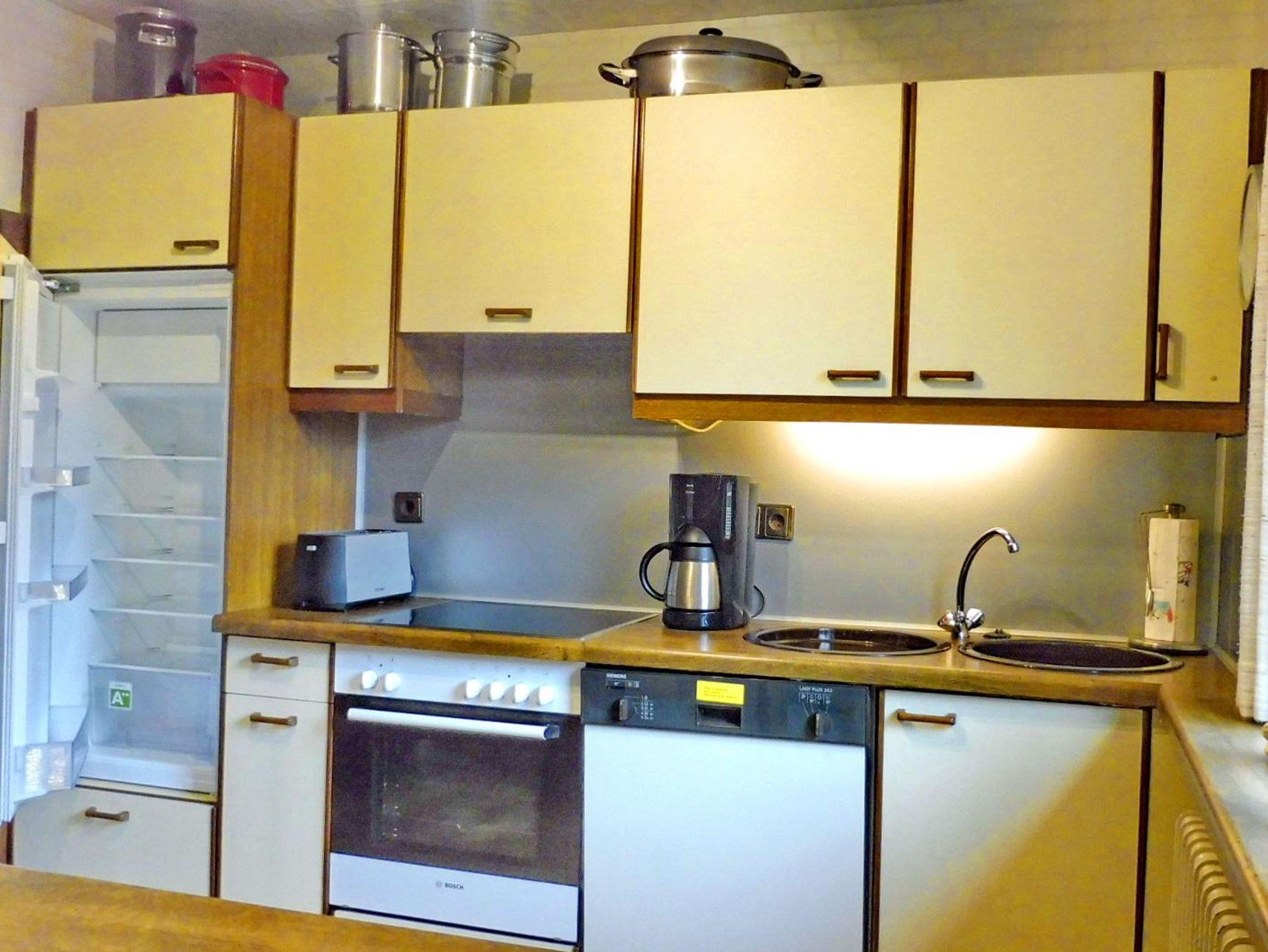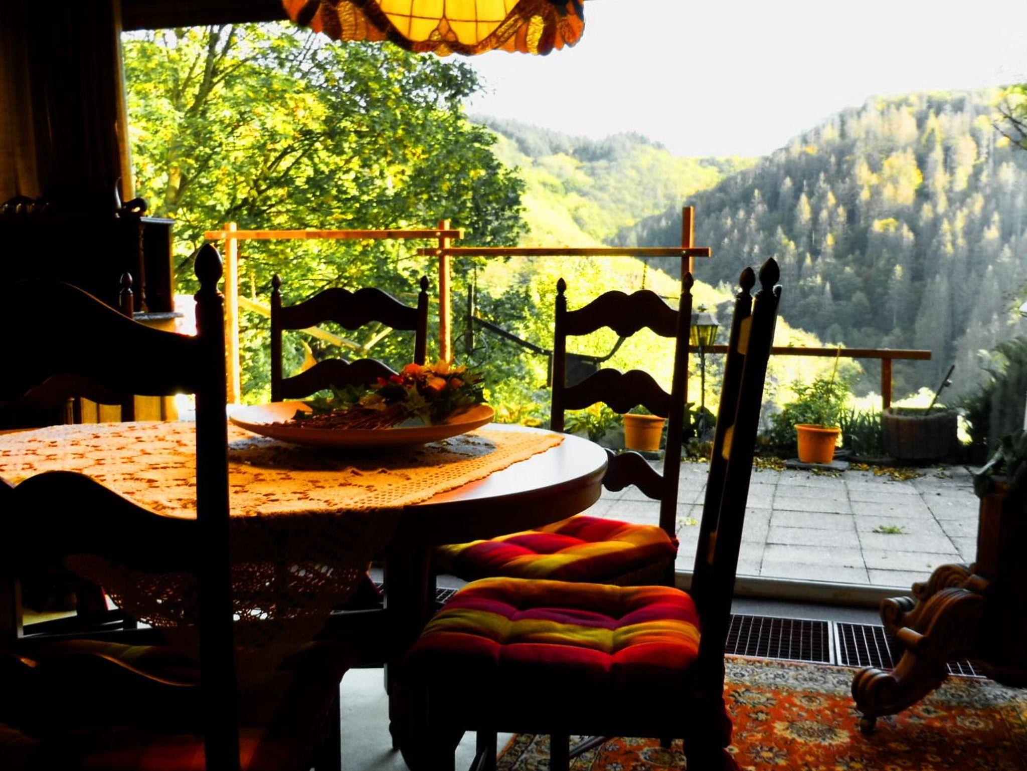 Die Küche ist komplett ausgestattet und verfügt über einen Einbaukühlschrank mit Gefrierfach, einen E-Herd mit 4-fach Cerankochfeld und Backofen, Dunstabzugshaube, Microwelle, Toaster, Kaffeemaschine, Eierkocher und vieles mehr. Das Esszimmer liegt an der Südseite direkt neben der Küche mit gemütlicher Leseecke und freiem Blick auf die gegenüberliegenden bewaldeten Hänge des Wiedtals.