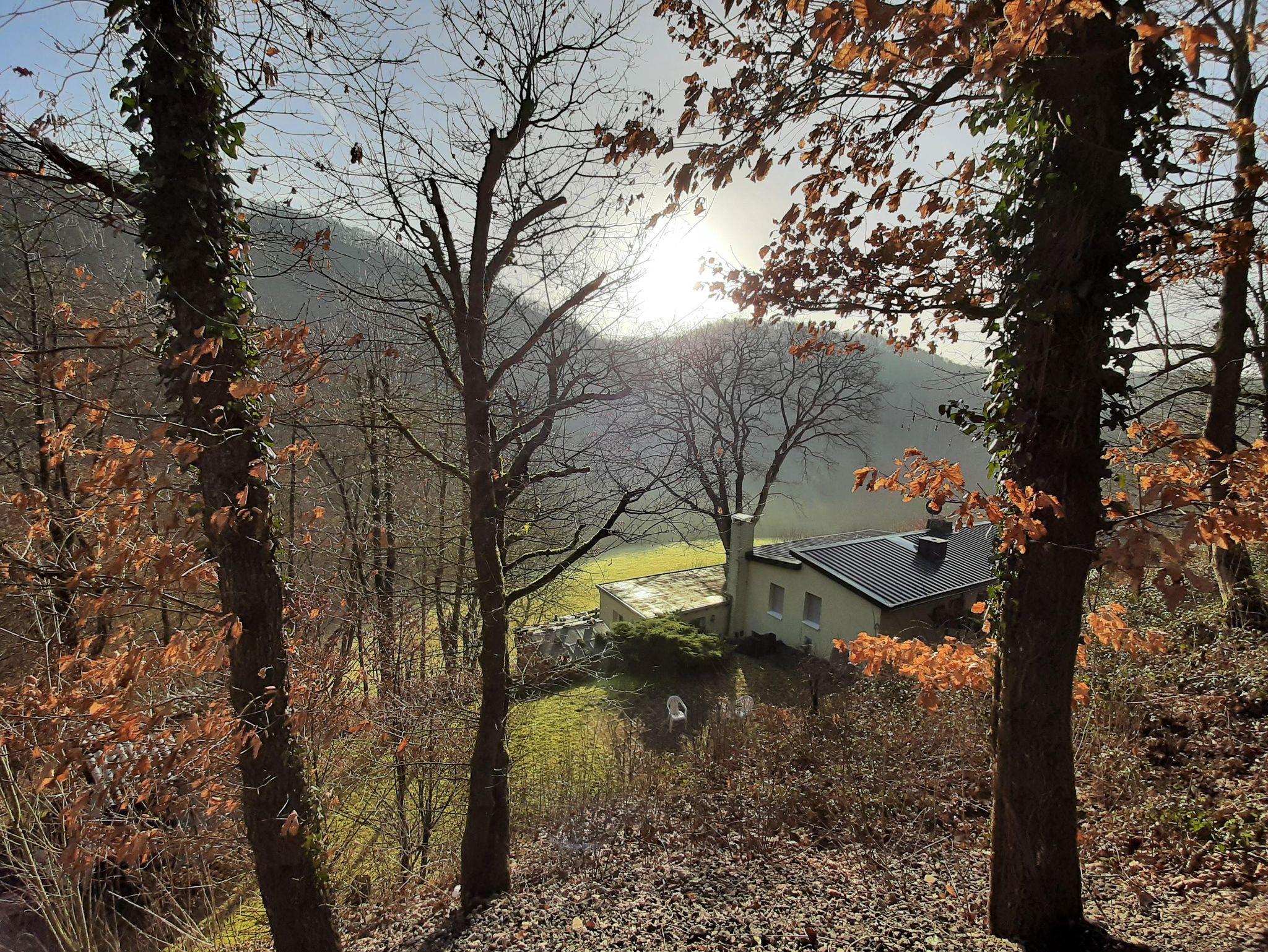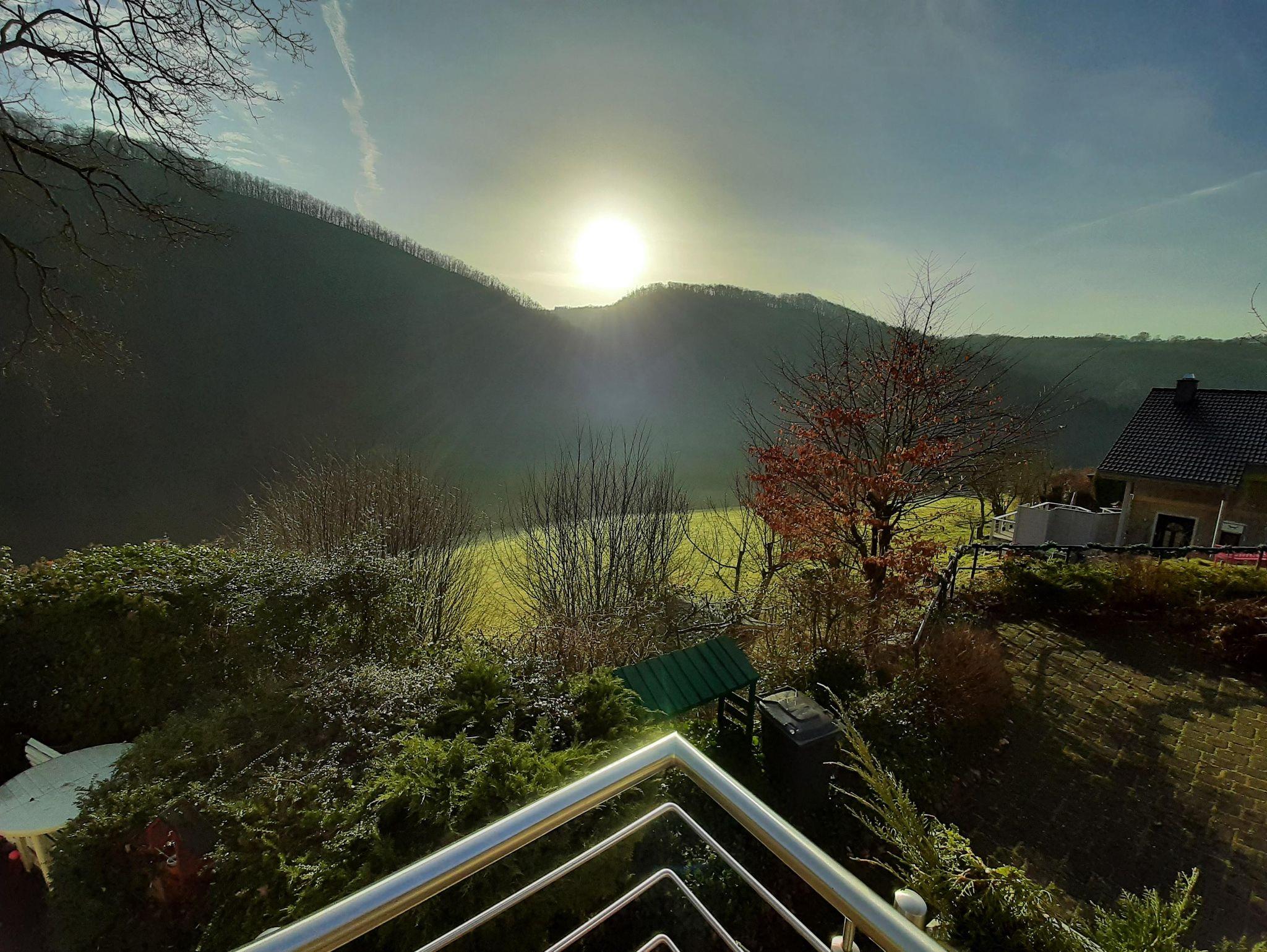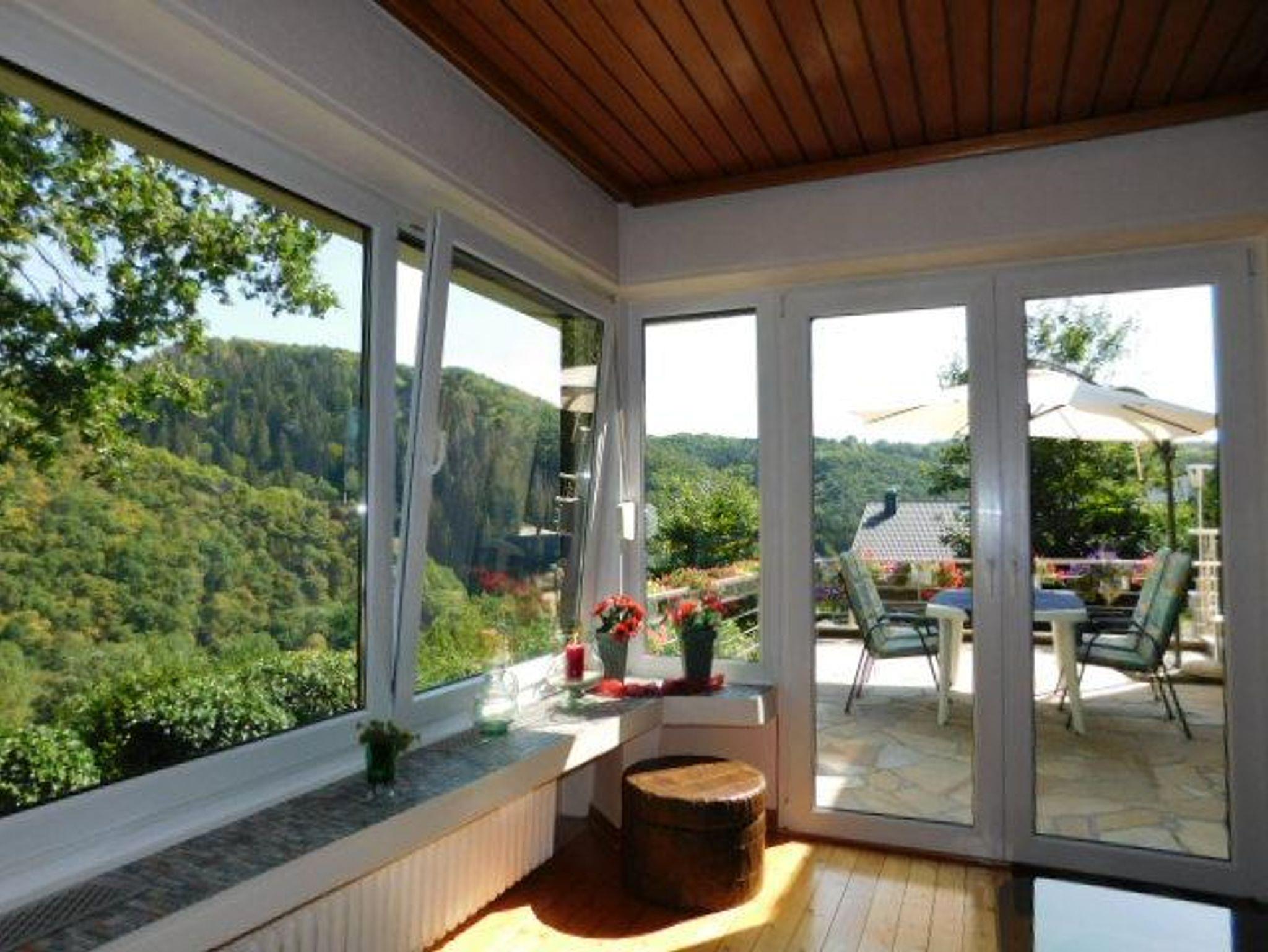 Große Panoramafenster bieten einen herrlichen Ausblick auf die gegenüberliegenden Waldhänge des Wiedtals. Die doppelflügige Glastür bietet den direkten Zugang zur großen Frei-Terrasse mit Gartenmöbeln inkl. Kissen- bzw. Polsterauflagen. Als Sonnenschutz dient ein großer Ampel-Sonnenschirm.