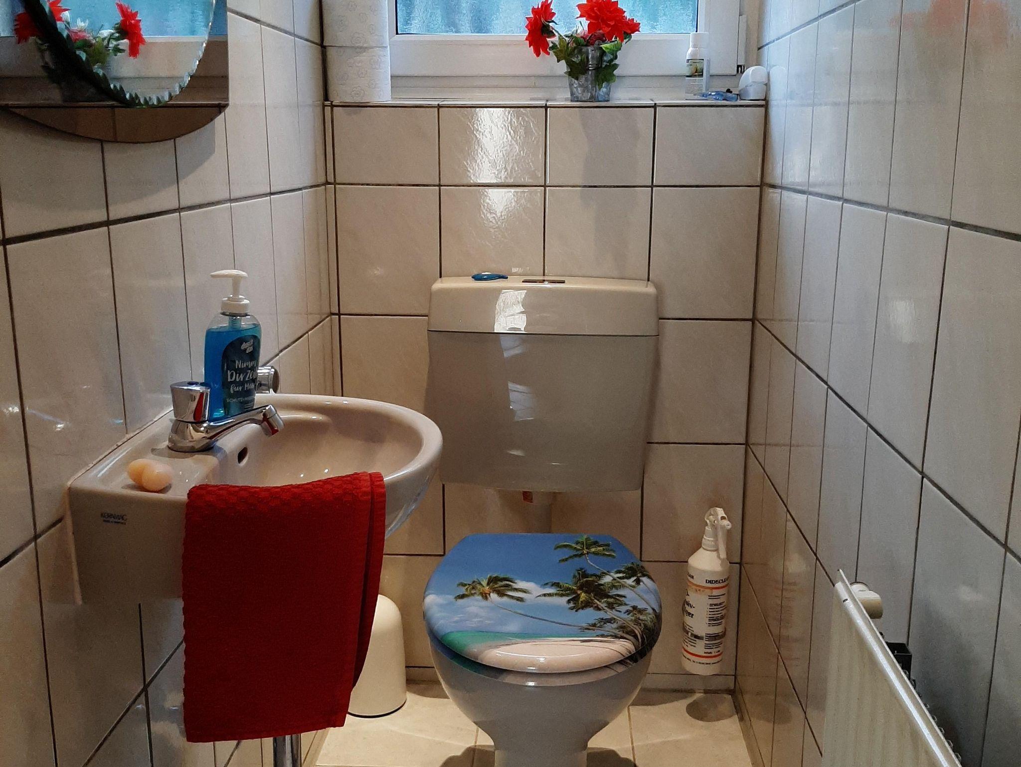 Auf Wunsch stehen außerdem ein (hoher) Standgrill sowie ein Tischgrill zur Verfügung. Das hell geflieste Badezimmer verfügt neben dem Handwaschbecken über eine Badewanne mit Duschvorrichtung sowie ausreichend Abstellmöglichkeiten. Das WC ist vom Bad getrennt und separat nutzbar.