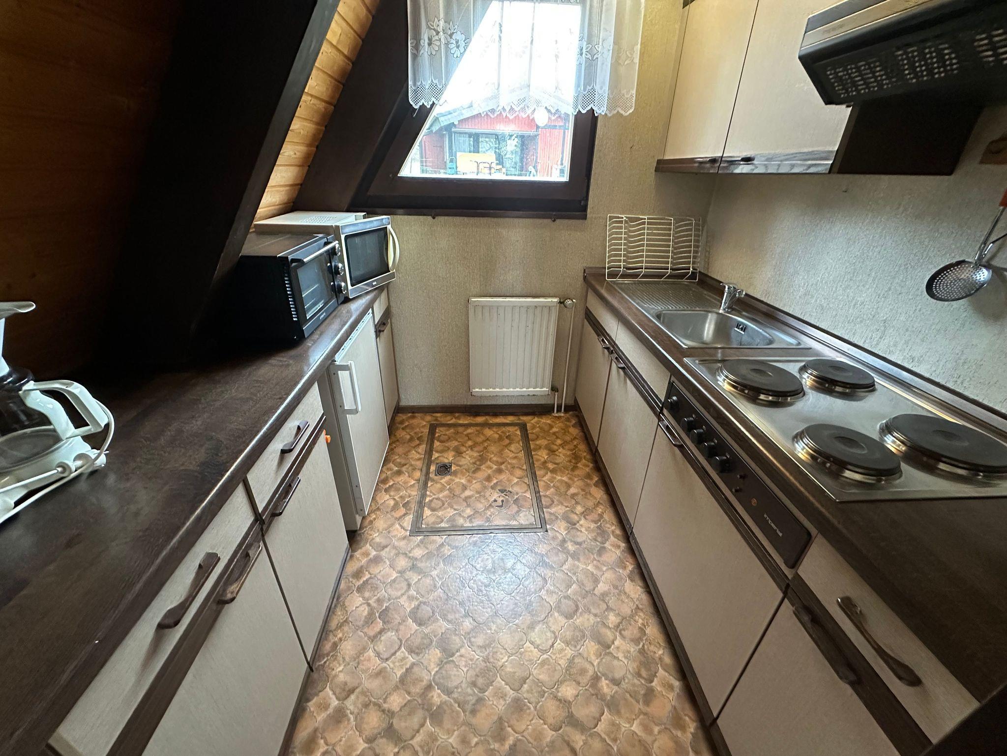 Im vorderen Bereich des Hauses gibt es ein großes Wohnzimmer mit SAT-TV. Direkt daran schließt sich die Küche an, die die Zubereitung von leckeren Speisen einfach macht. In der Küche befinden sich unter anderem Kaffeemaschine, Wasserkocher, Toaster,Geschirr und Herd.
