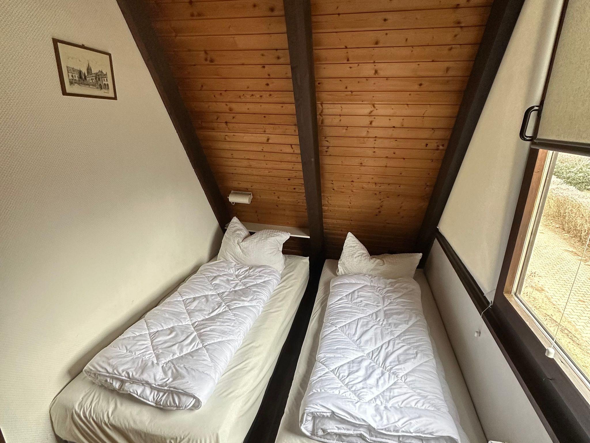 Das Ferienhaus Winnetou Nr. 27 verfügt über einen Wohnbereich, von dem man den Blick über den großen Garten schweifen lassen kann.Die Schlafzimmer liegen im oberen Bereich des Ferienhauses und sind über eine Treppe zu erreichen. Die Schlafkoje im großen Schlafzimmer ist der Lieblingsplatz der Jüngsten.