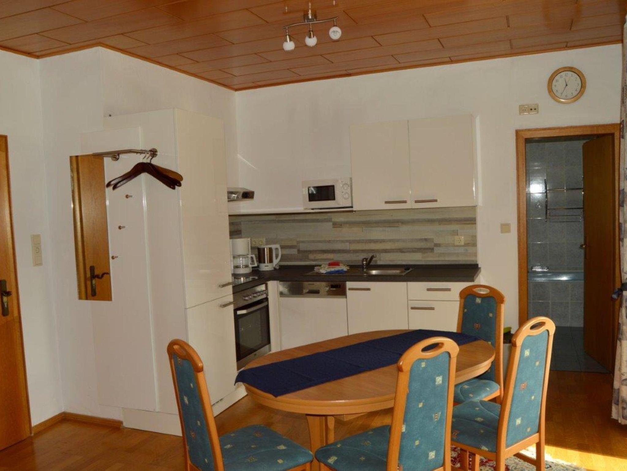 Die Wohnküche ist mit einer Küchenzeile (E-Herd, Backofen, Spülmaschine, Kühlschrank und Mikrowelle) ausgestattet.Darüber hinaus befinden sich in der Wohnküche eine Sitzecke mit Schlafsofa und ein Esstisch.