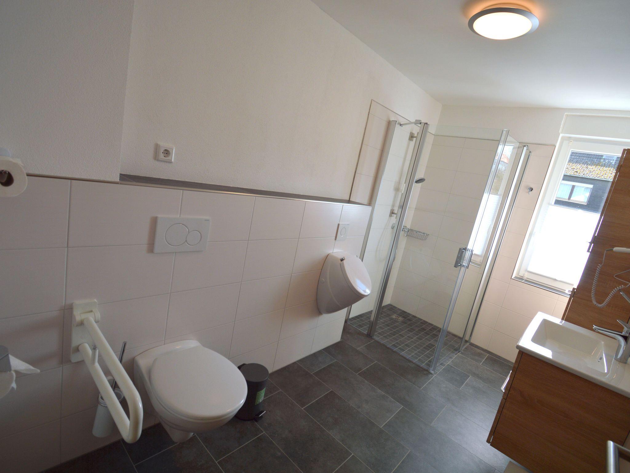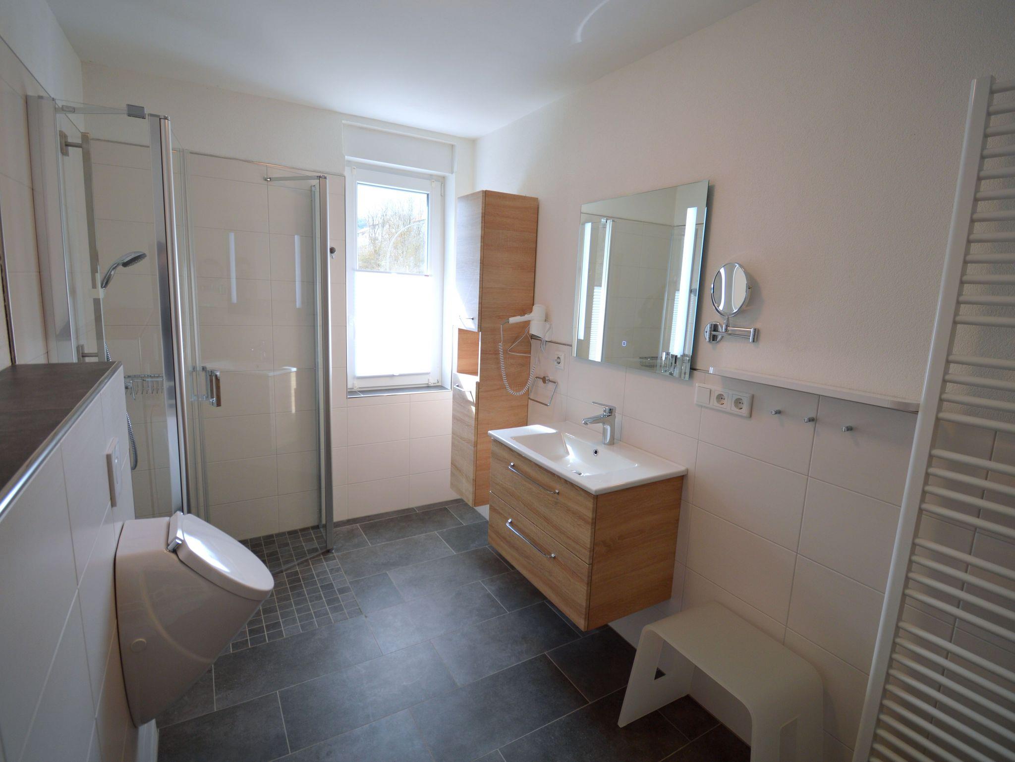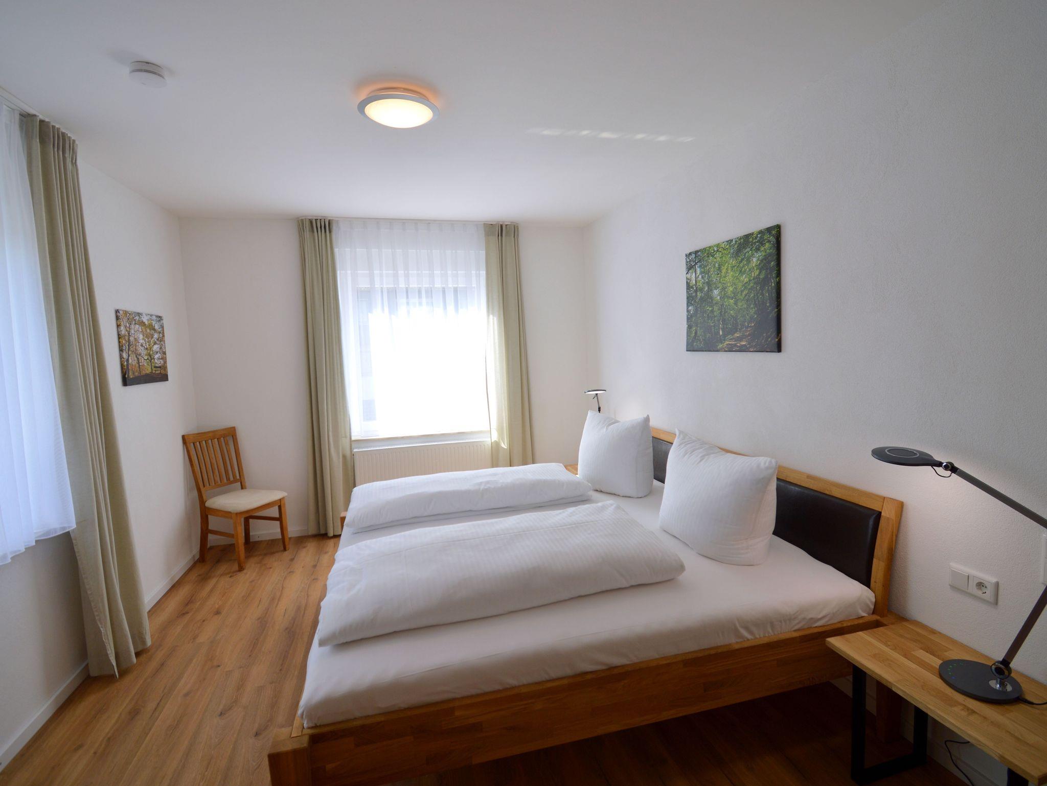Die moderne Drei-Zimmer Wohnung liegt im ersten Stock unseres Hauses. Die Wohnung ist mit 82 qm perfekt für einen Urlaub zu viert. Es sind zwei Schlafzimmer mit jeweils einen großen Doppelbett (200 cmx 200 cm) vorhanden. Besonderes Highlight im Schlafzimmer sind die Nachttischlampen mit verschiedenen Lichtstimmungen, je nachdem, ob Sie helles Licht zum Lesen benötigen oder ein warmes Licht zum Relaxen. Die Schlafzimmer lassen sich für besonders erholsame Nächte komplett verdunkeln. Die große Küche ist ausgestattet mit Kühl- und Gefrierschrank, Spülmaschine, Kaffeefiltermaschine, Wasserkocher, Toaster und Eierkocher und vieles andere, was Sie zum Kochen brauchen. Der Wohnbereich bietet sehr viel Platz um sich in Ruhe gemütlich zu entspannen. Das Badezimmer verfügt neben dem WC über ein Urinal und eine ebenerdige Dusche mit mobilen Duschsitz. Auf dem Balkon lässt es sich in der Morgensonne mit einem Blick auf den Nationalpark und das Vorstaubecken des Edersees gut frühstücken.