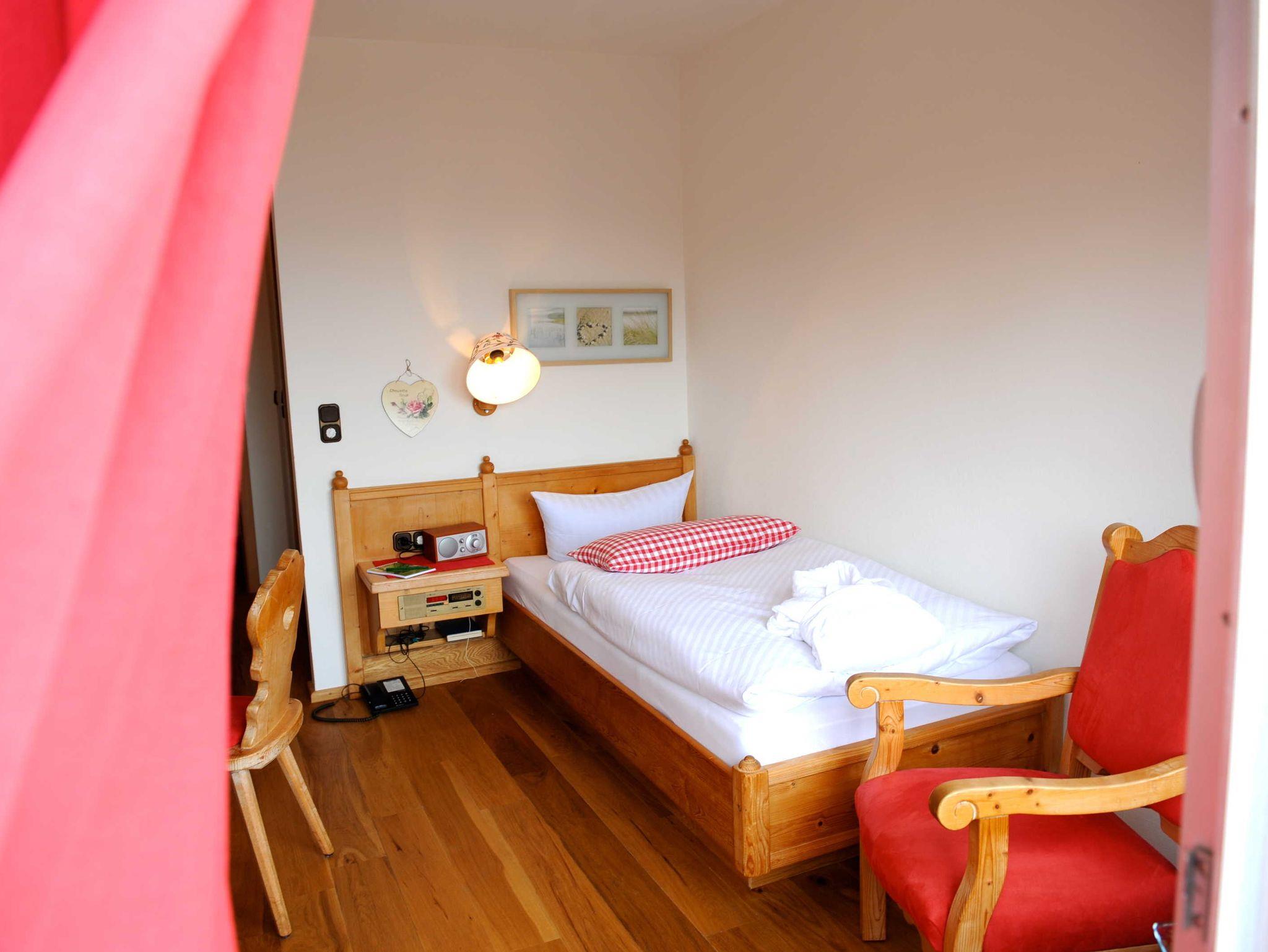 Einzelzimmer mit Naturholz-Dielen, Deckbett 155 x 220 cm, Bettwäsche und Handtücher in Bio Cotton, TV, Dusche, WC, Lotion und Shampoo Speick Thermal, Wasserkocher, Föhn und Bademantel.