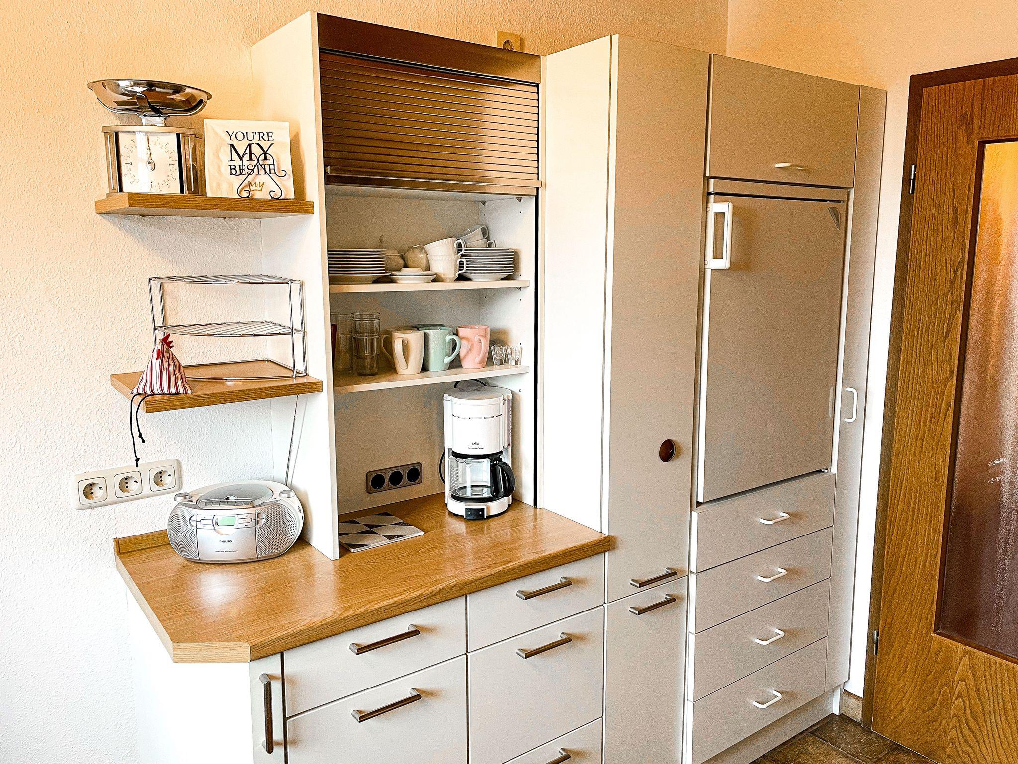 Die gut ausgestattete Küche besteht aus Backofen, Ceranfeld, Dunstabzug, Kühlschrank und Essecke sowie allen erforderlichen Küchenutensilien.