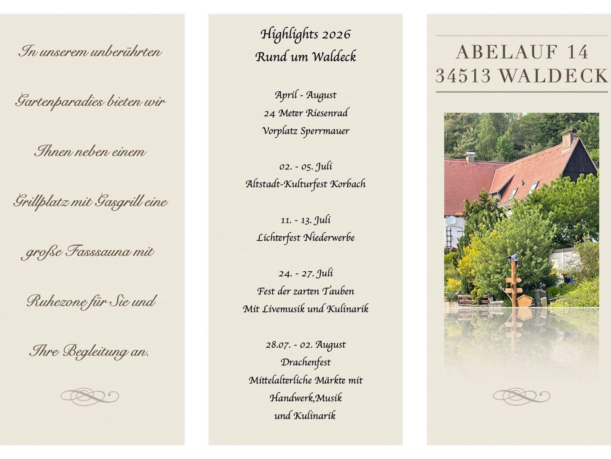 Die Nationalparkstadt Waldeck erhebt ganzjährig einen Tourismusbeitrag von 1,- € pro Person und Tag. (Kinder bis zum vollendeten 14. Lebensjahr sind frei). Der Tourismusbeitrag wird vor Ort gesondert berechnet!
