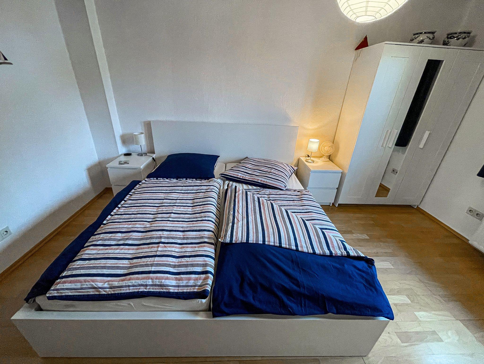 Doppelbett. Der Blick aus dem Fenster (das mit Verdunkelungsgardine versehen ist)